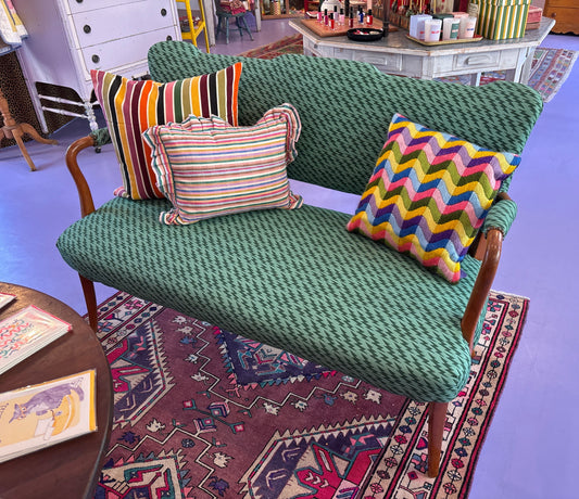 Mid Century Upholstered Settee - Ottoline Green Lightning Bolt Fabric