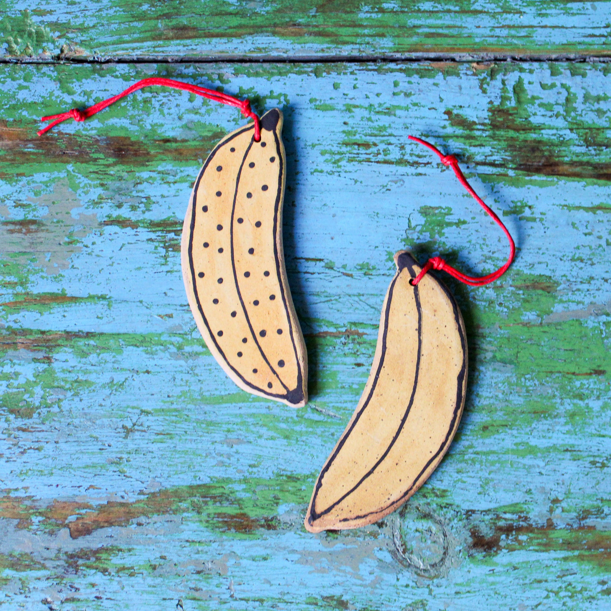 Handmade ceramic Banana ornament with hand-painted details in colorful underglaze. Each ornament is strung with a durable nylon chord. These beautiful one-of-a-kind ornaments make for lovely gifts during the holiday season.