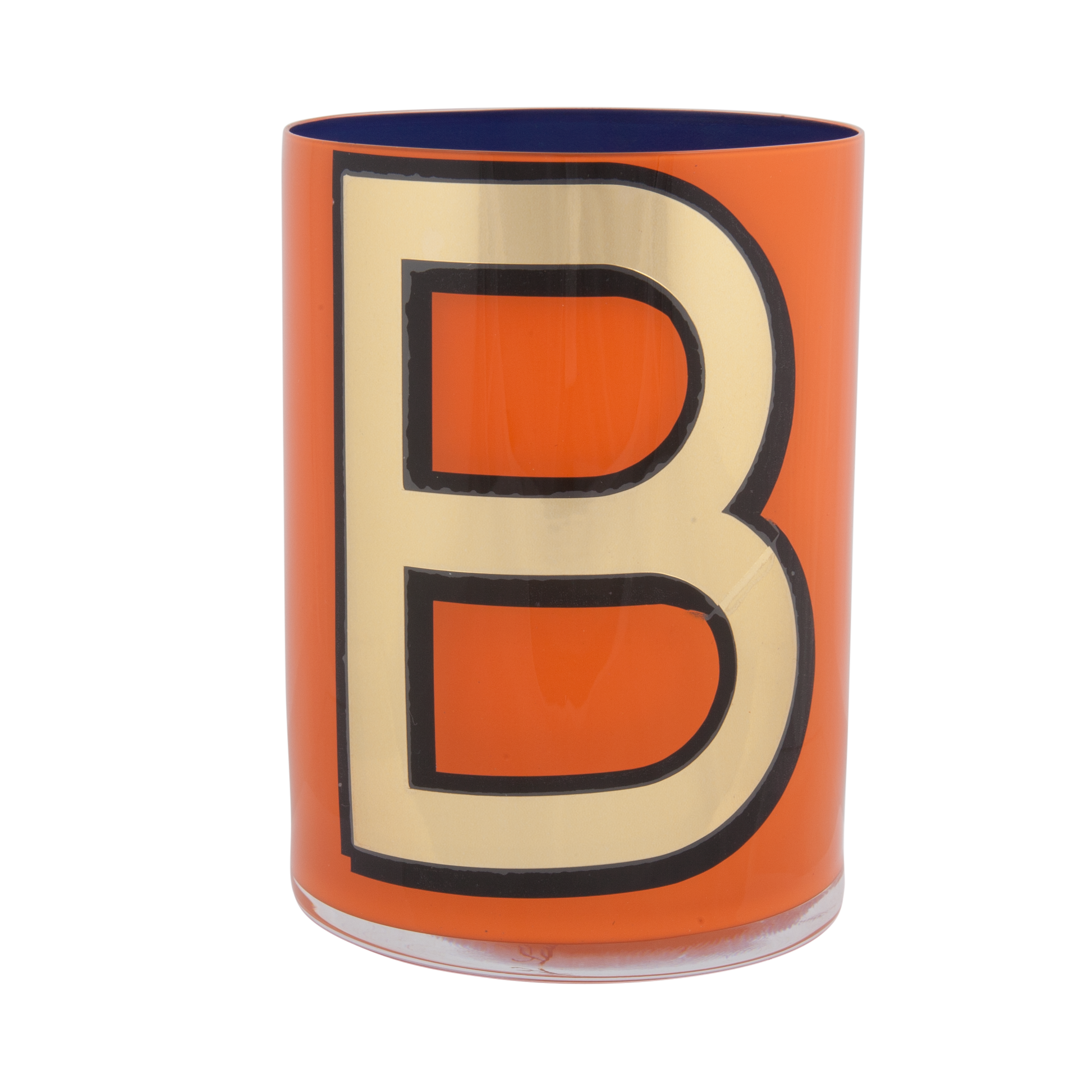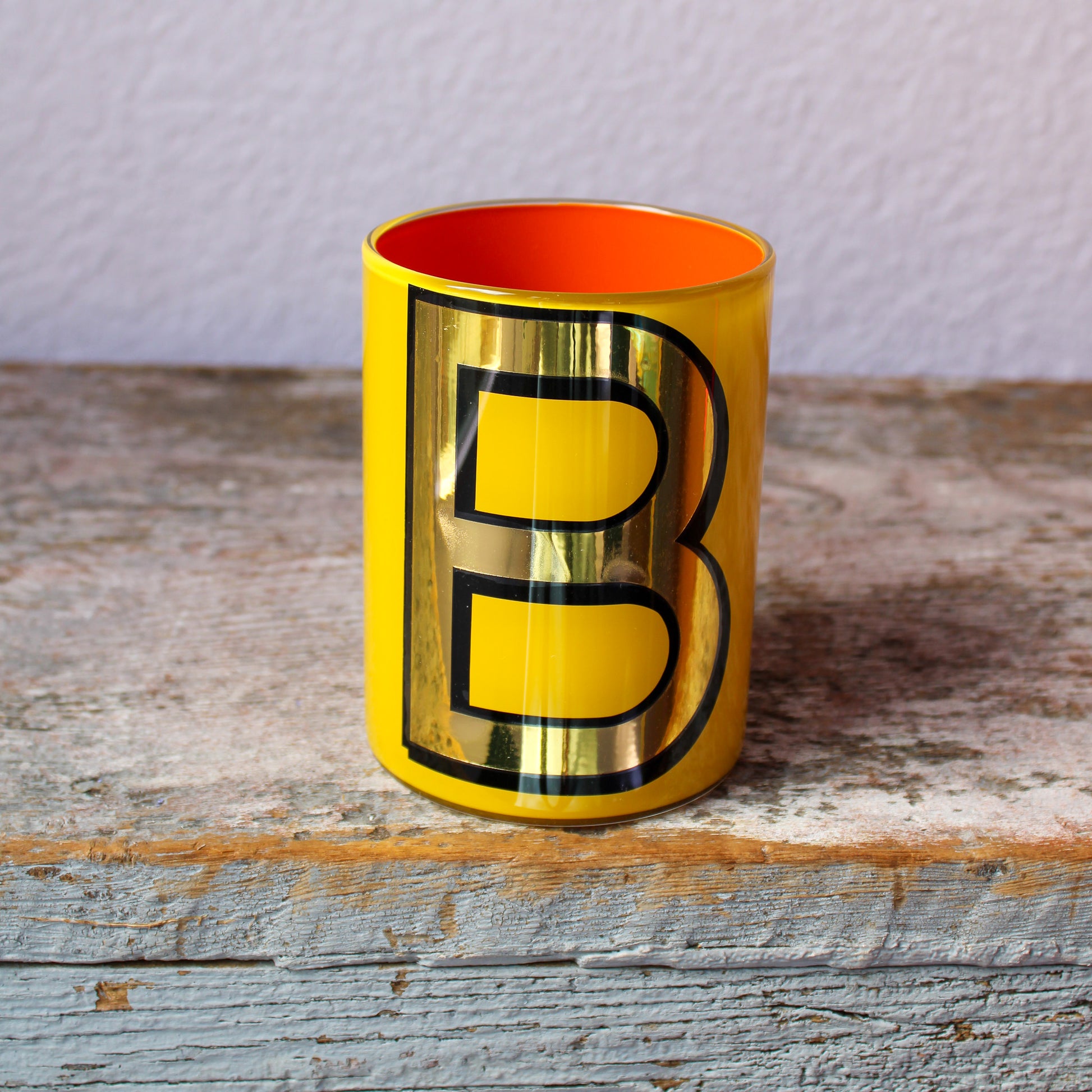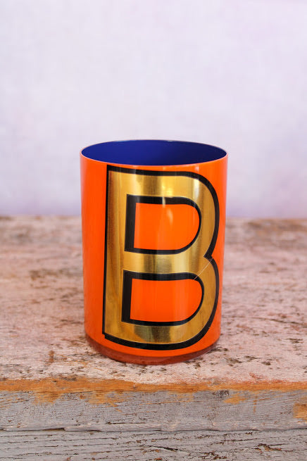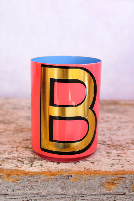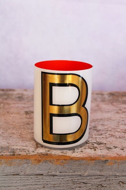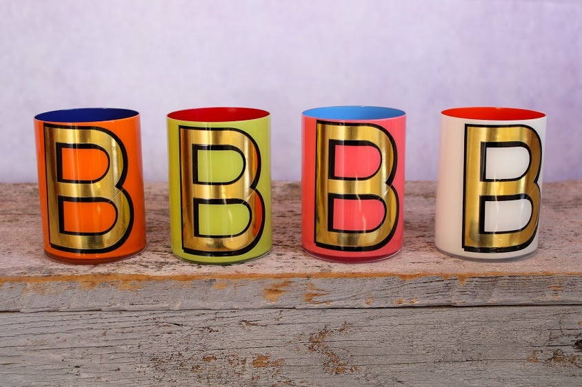 Smooth crystal tumblers inlaid with a gold vinyl letter or symbol, backed with one of six different colored lacquers and a topcoat of glossy varnish. Please note the pots are for decorative use only and are not suitable for food or drink consumption. Whilst durable, the lacquers are water-soluble so if they were ever to be used to hold flowers (which is a fabulous idea) the best thing is to put a small jar of water inside.