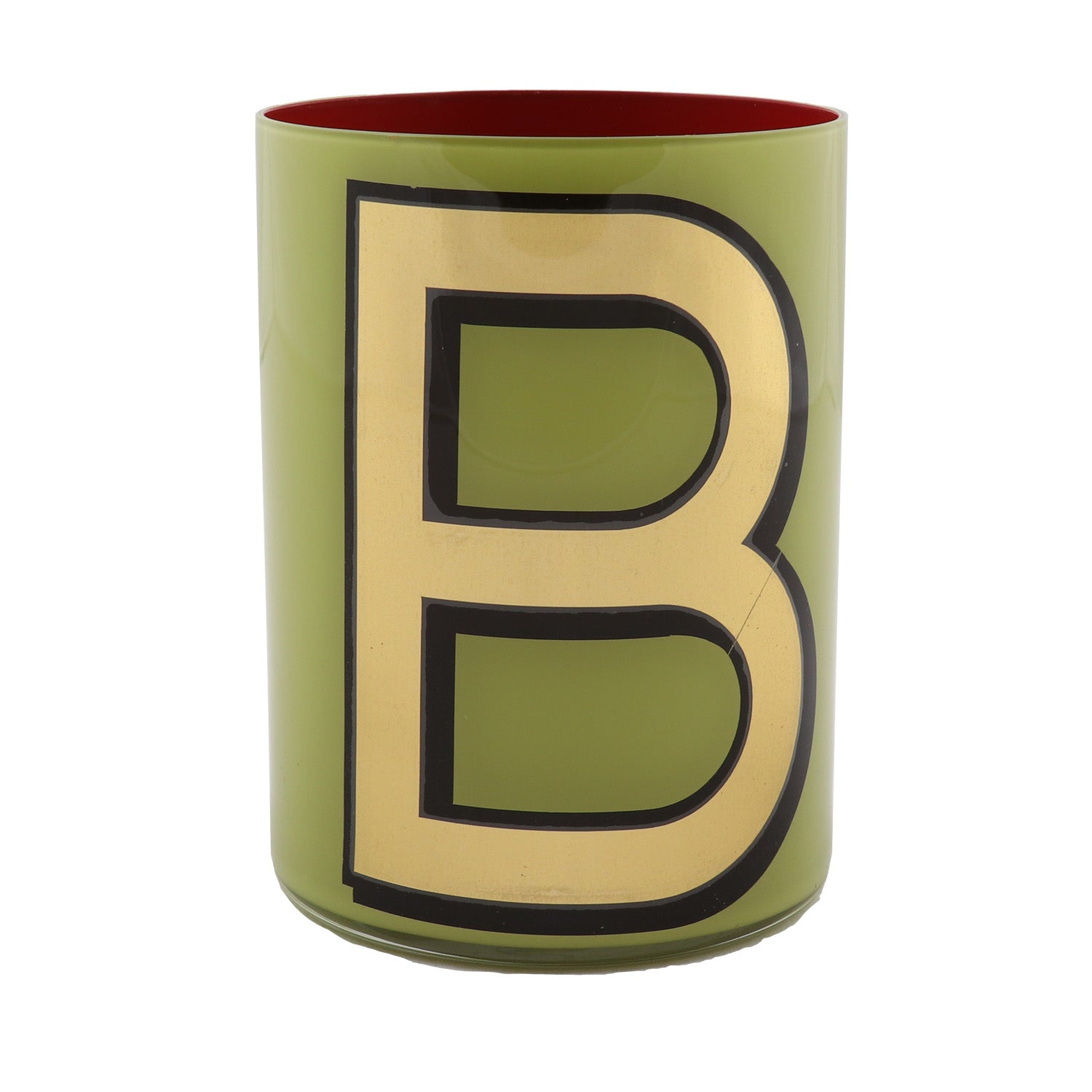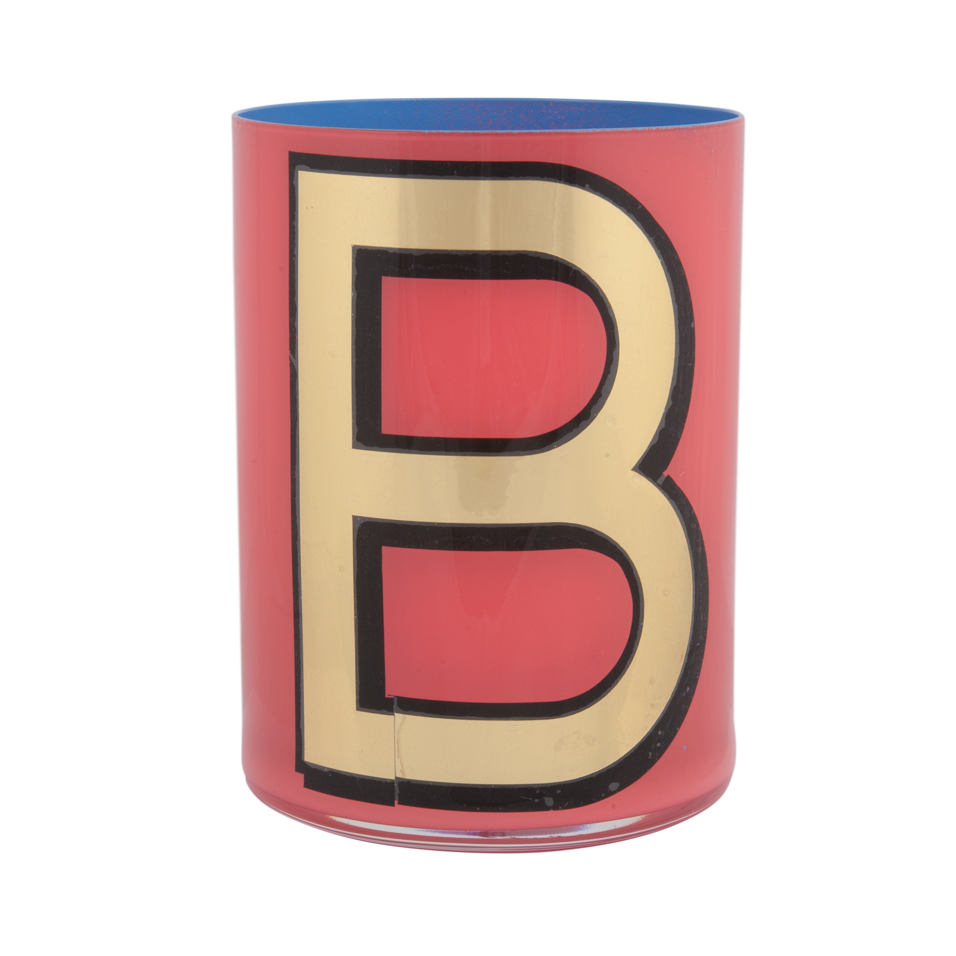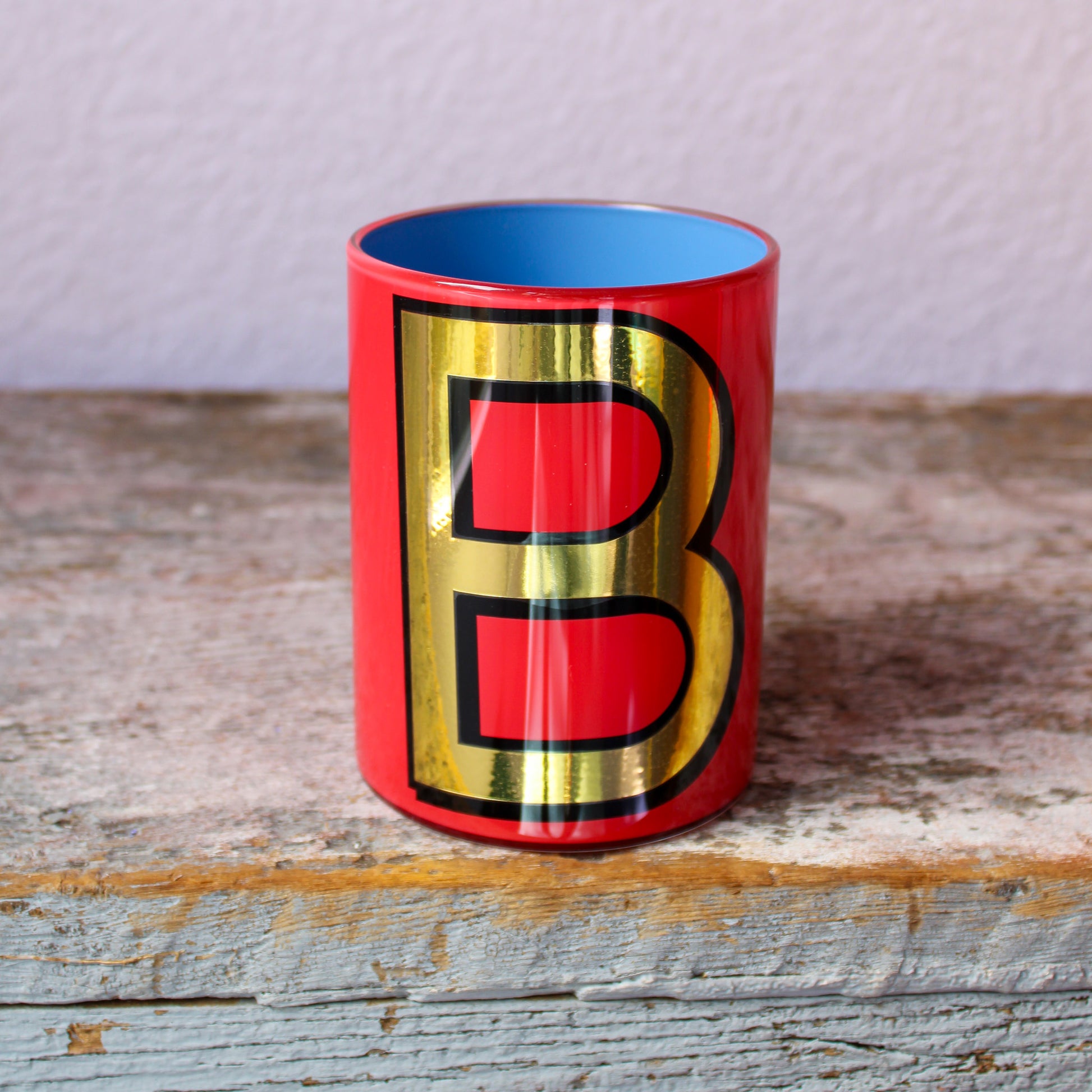 Smooth crystal tumblers inlaid with a gold vinyl letter or symbol, backed with one of six different colored lacquers and a topcoat of glossy varnish. Please note the pots are for decorative use only and are not suitable for food or drink consumption. Whilst durable, the lacquers are water-soluble so if they were ever to be used to hold flowers (which is a fabulous idea) the best thing is to put a small jar of water inside.