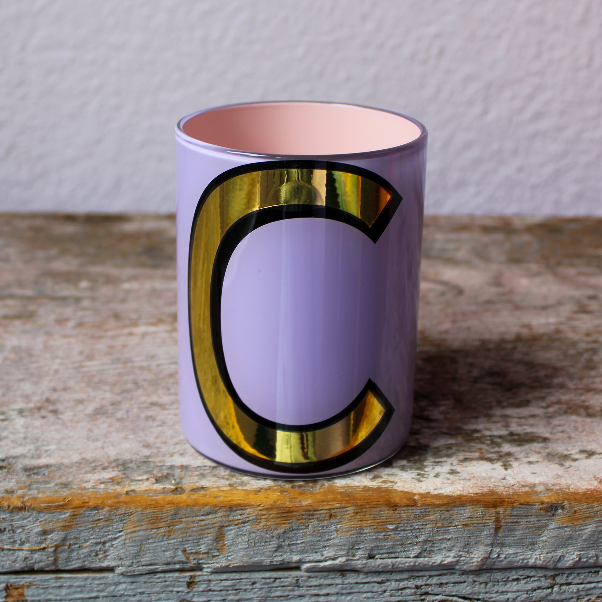 Smooth crystal tumblers inlaid with a gold vinyl letter or symbol, backed with one of six different colored lacquers and a topcoat of glossy varnish. Please note the pots are for decorative use only and are not suitable for food or drink consumption. Whilst durable, the lacquers are water-soluble so if they were ever to be used to hold flowers (which is a fabulous idea) the best thing is to put a small jar of water inside.