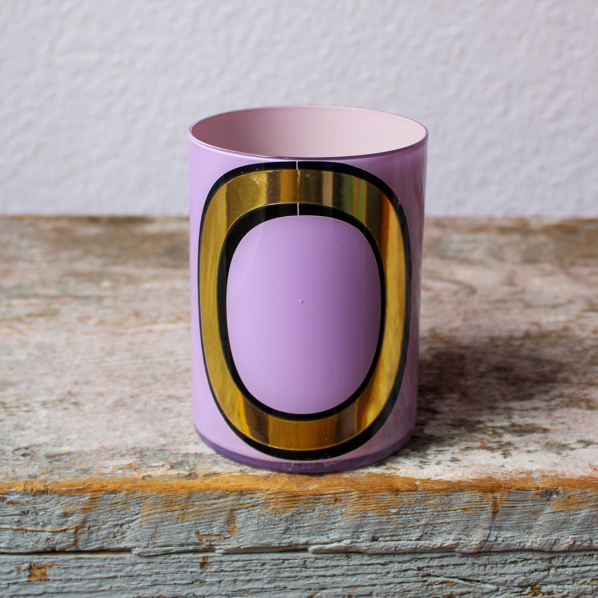 Smooth crystal tumblers inlaid with a gold vinyl letter or symbol, backed with one of six different colored lacquers and a topcoat of glossy varnish. Please note the pots are for decorative use only and are not suitable for food or drink consumption. Whilst durable, the lacquers are water-soluble so if they were ever to be used to hold flowers (which is a fabulous idea) the best thing is to put a small jar of water inside.