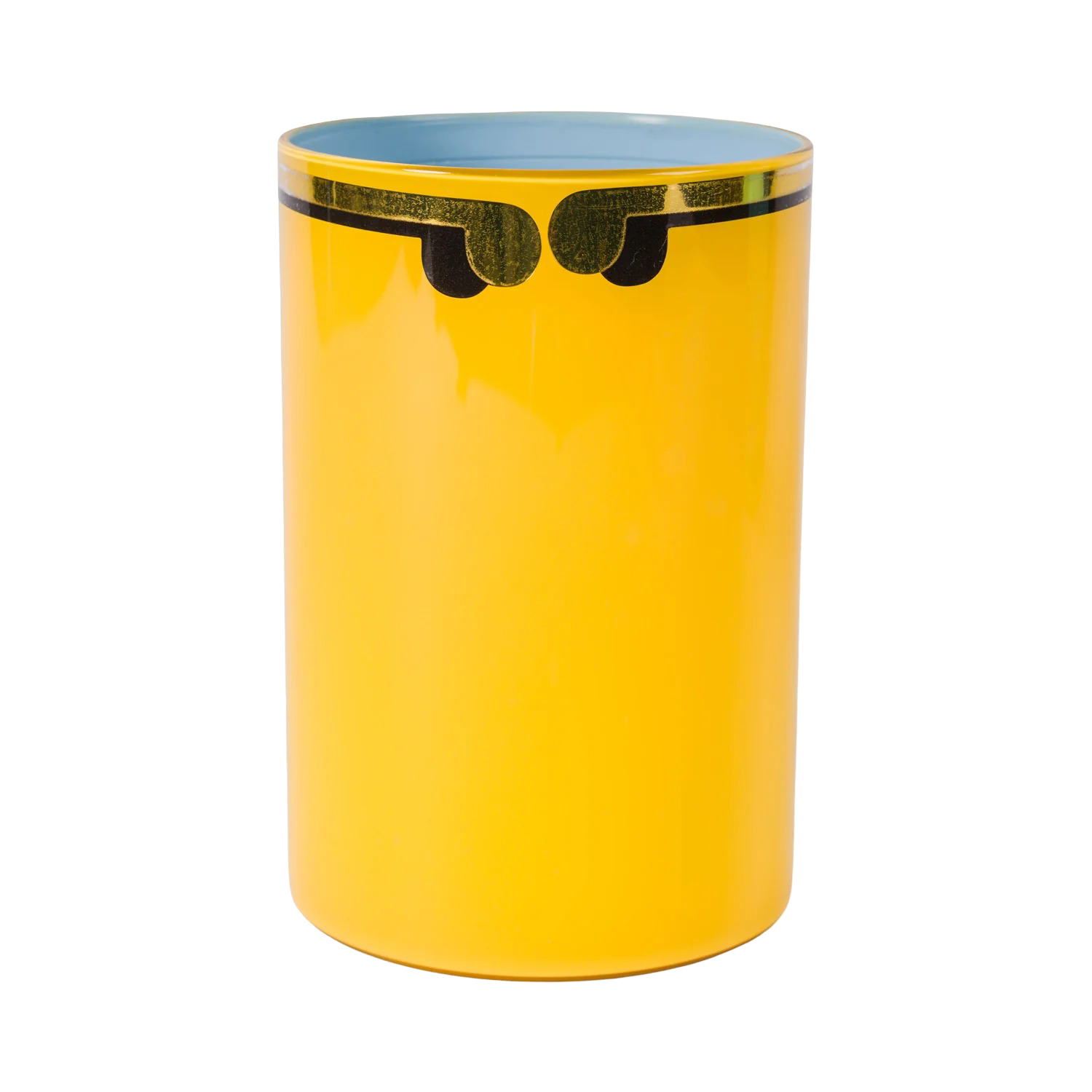 Smooth crystal tumblers inlaid with a gold vinyl letter or symbol, backed with one of six different colored lacquers and a topcoat of glossy varnish. Please note the pots are for decorative use only and are not suitable for food or drink consumption. Whilst durable, the lacquers are water-soluble so if they were ever to be used to hold flowers (which is a fabulous idea) the best thing is to put a small jar of water inside.