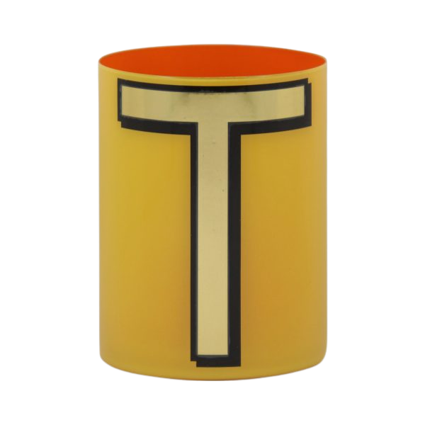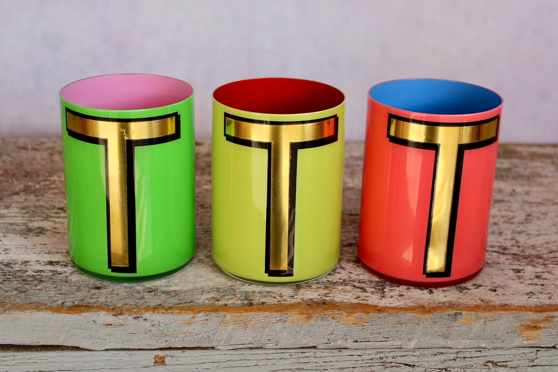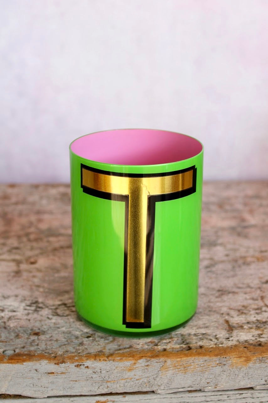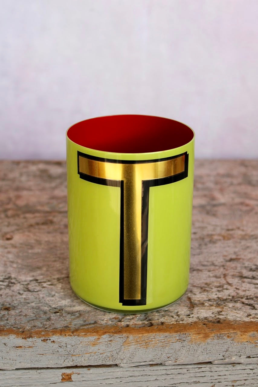 Smooth crystal tumblers inlaid with a gold vinyl letter or symbol, backed with one of six different colored lacquers and a topcoat of glossy varnish. Please note the pots are for decorative use only and are not suitable for food or drink consumption. Whilst durable, the lacquers are water-soluble so if they were ever to be used to hold flowers (which is a fabulous idea) the best thing is to put a small jar of water inside.