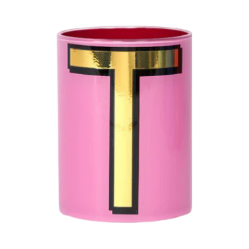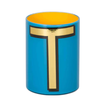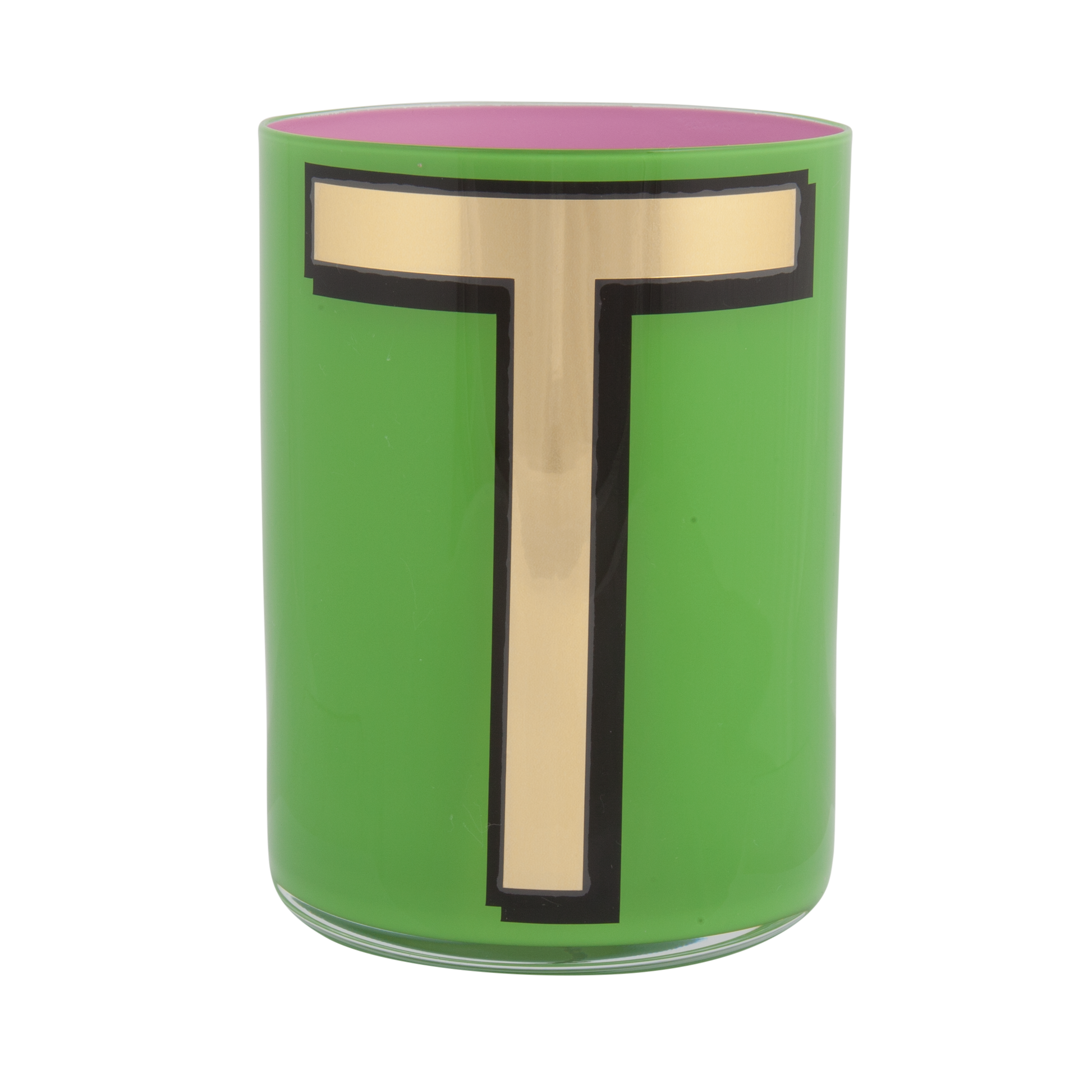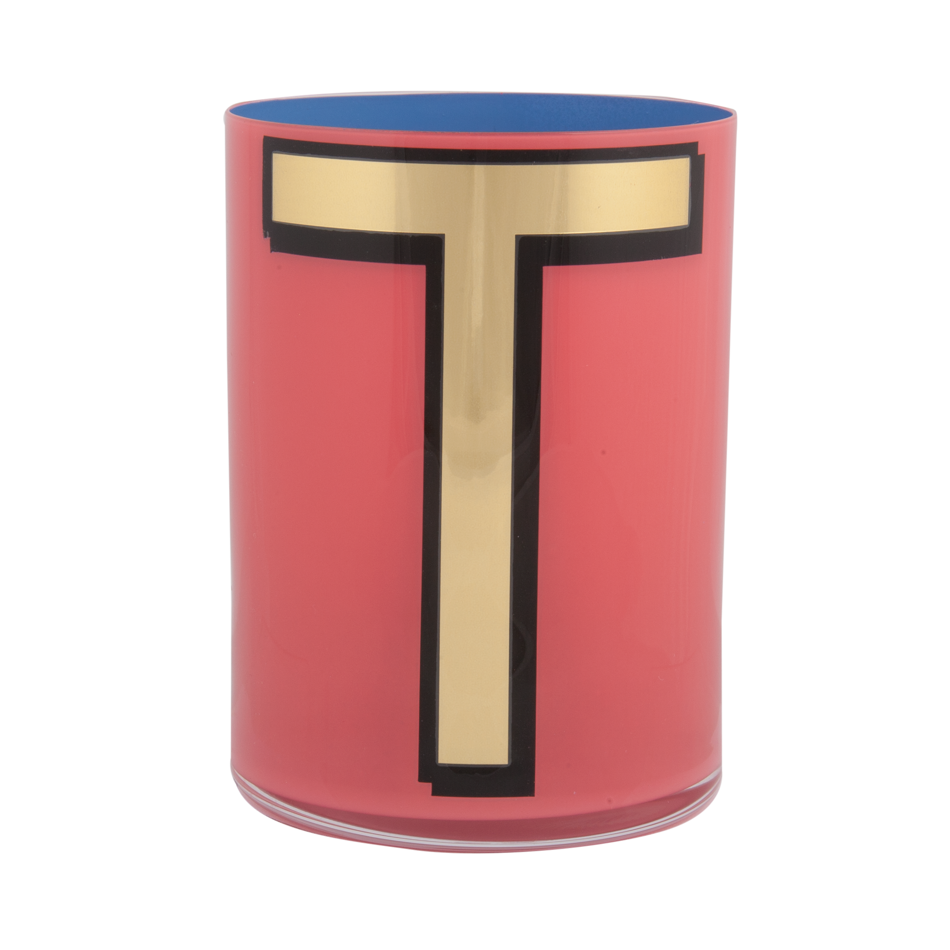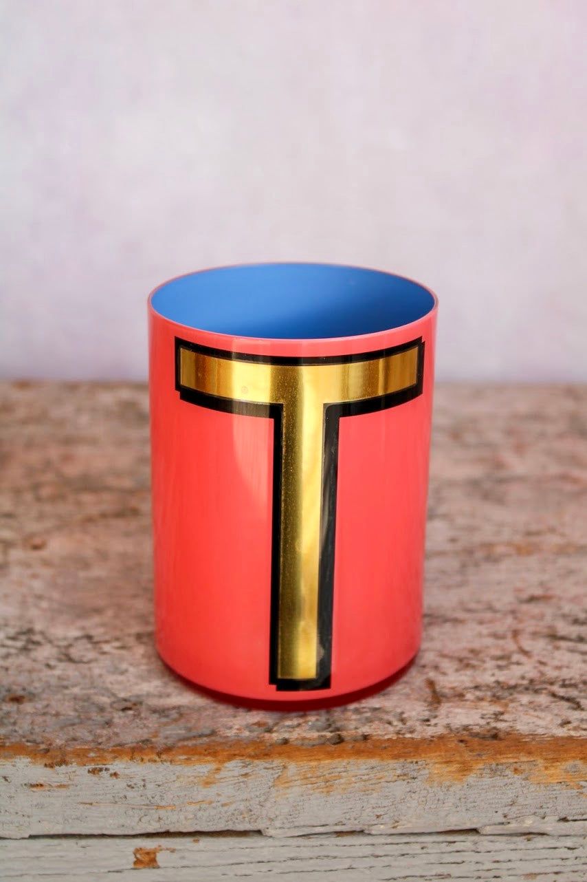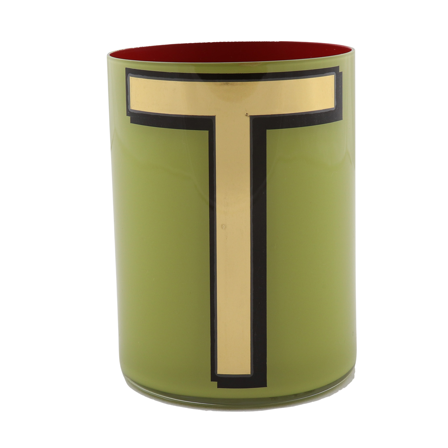Smooth crystal tumblers inlaid with a gold vinyl letter or symbol, backed with one of six different colored lacquers and a topcoat of glossy varnish. Please note the pots are for decorative use only and are not suitable for food or drink consumption. Whilst durable, the lacquers are water-soluble so if they were ever to be used to hold flowers (which is a fabulous idea) the best thing is to put a small jar of water inside.