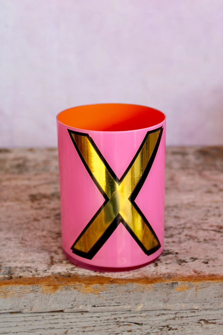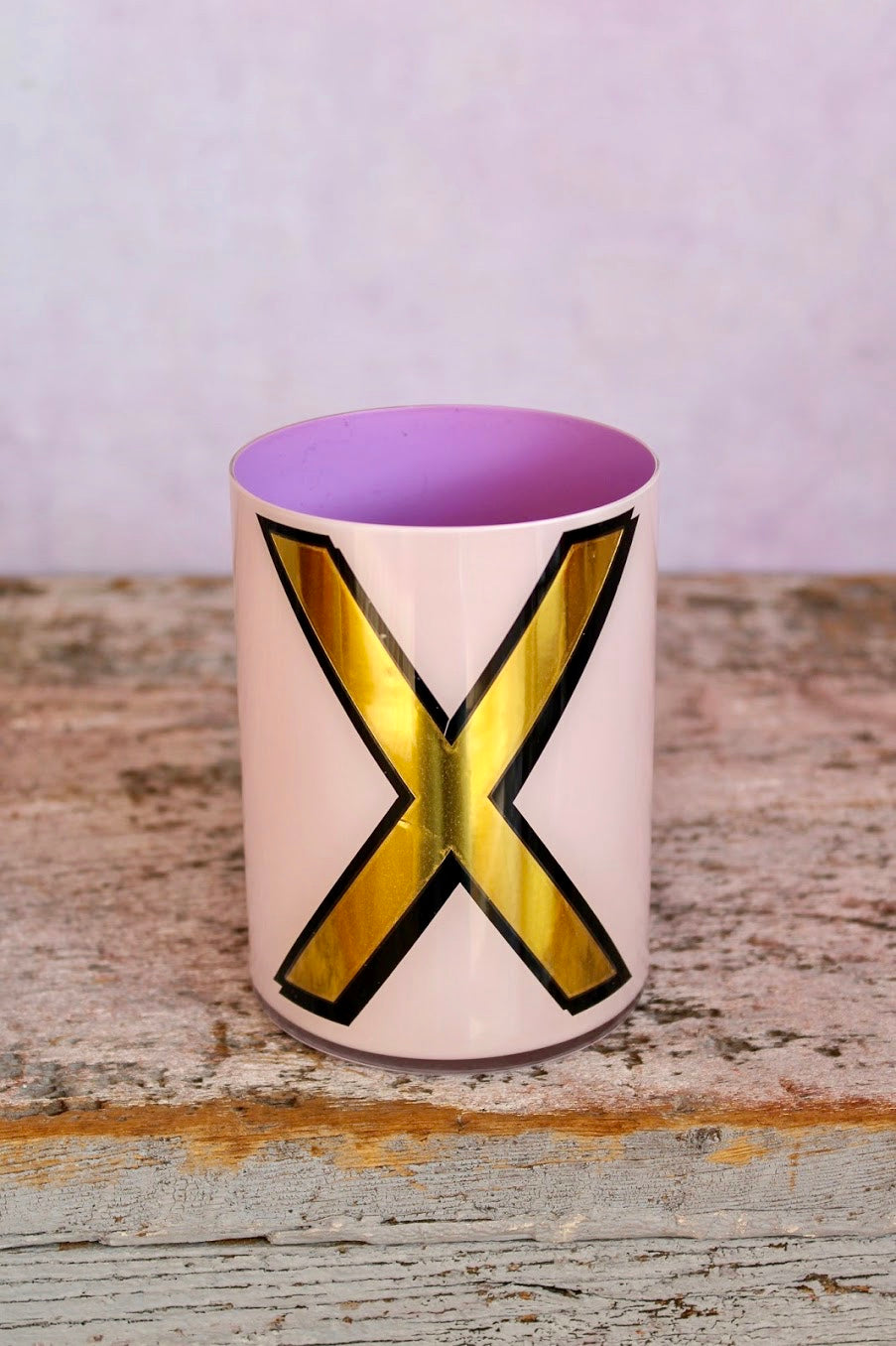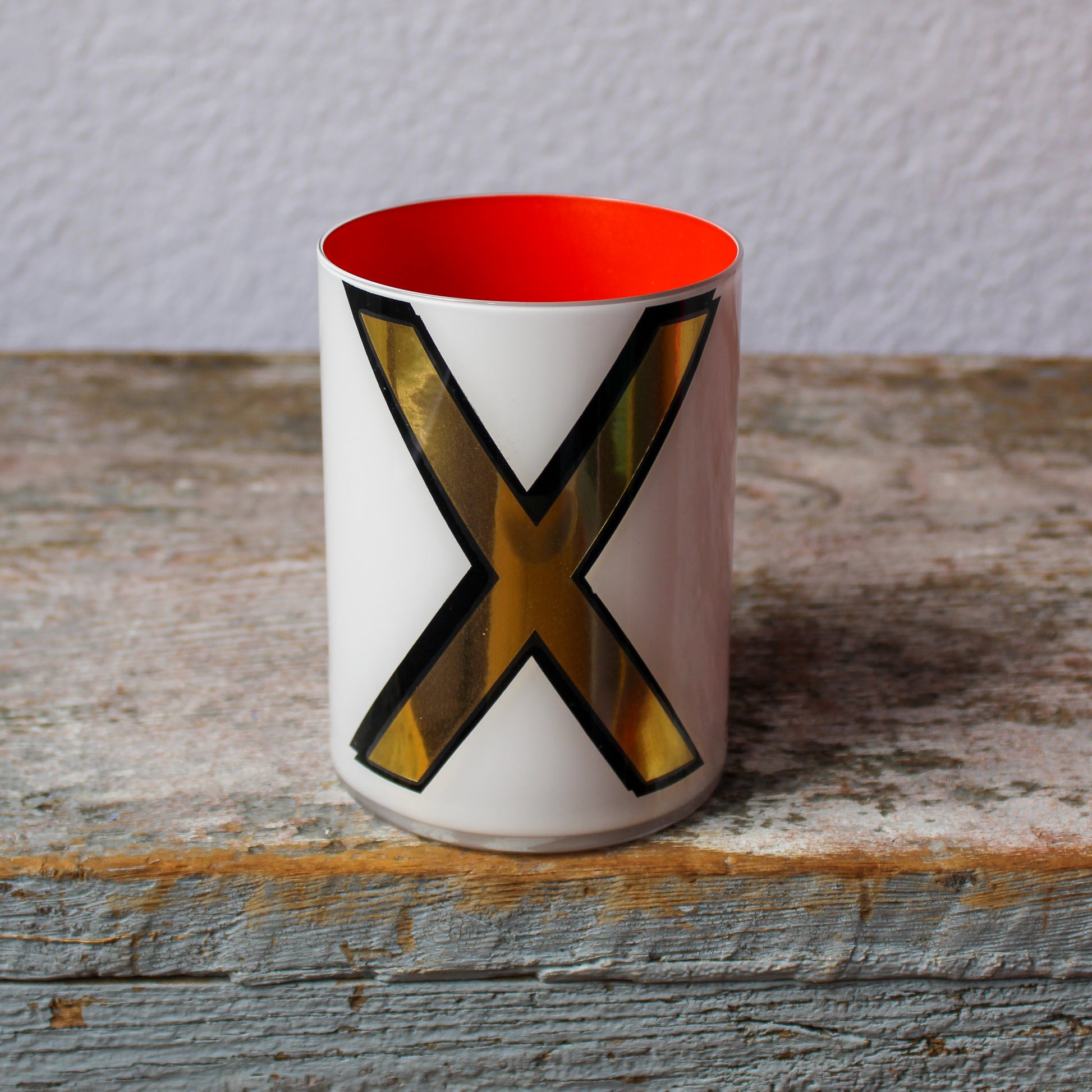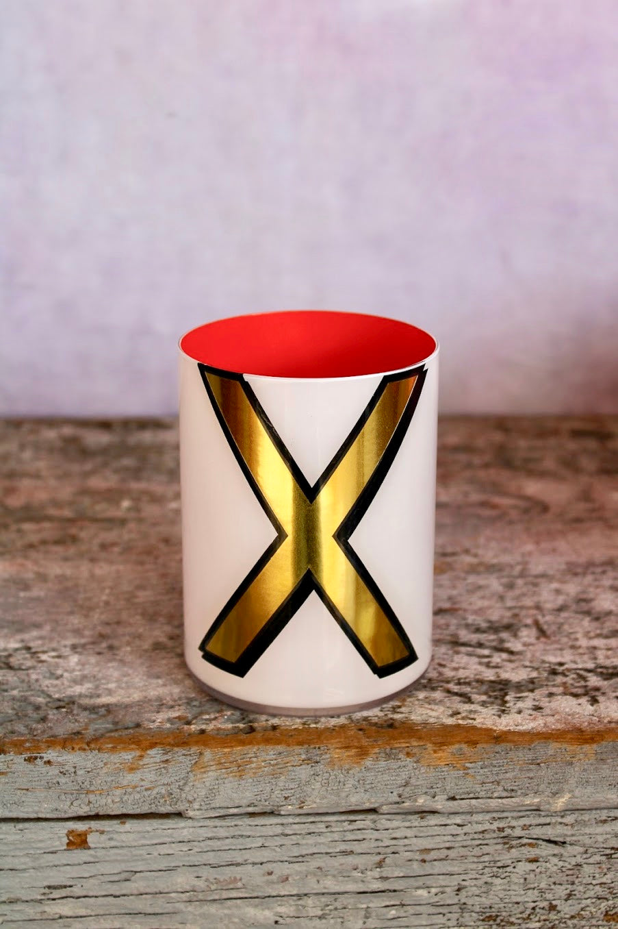 Smooth crystal tumblers inlaid with a gold vinyl letter or symbol, backed with one of six different colored lacquers and a topcoat of glossy varnish. Please note the pots are for decorative use only and are not suitable for food or drink consumption. Whilst durable, the lacquers are water-soluble so if they were ever to be used to hold flowers (which is a fabulous idea) the best thing is to put a small jar of water inside.