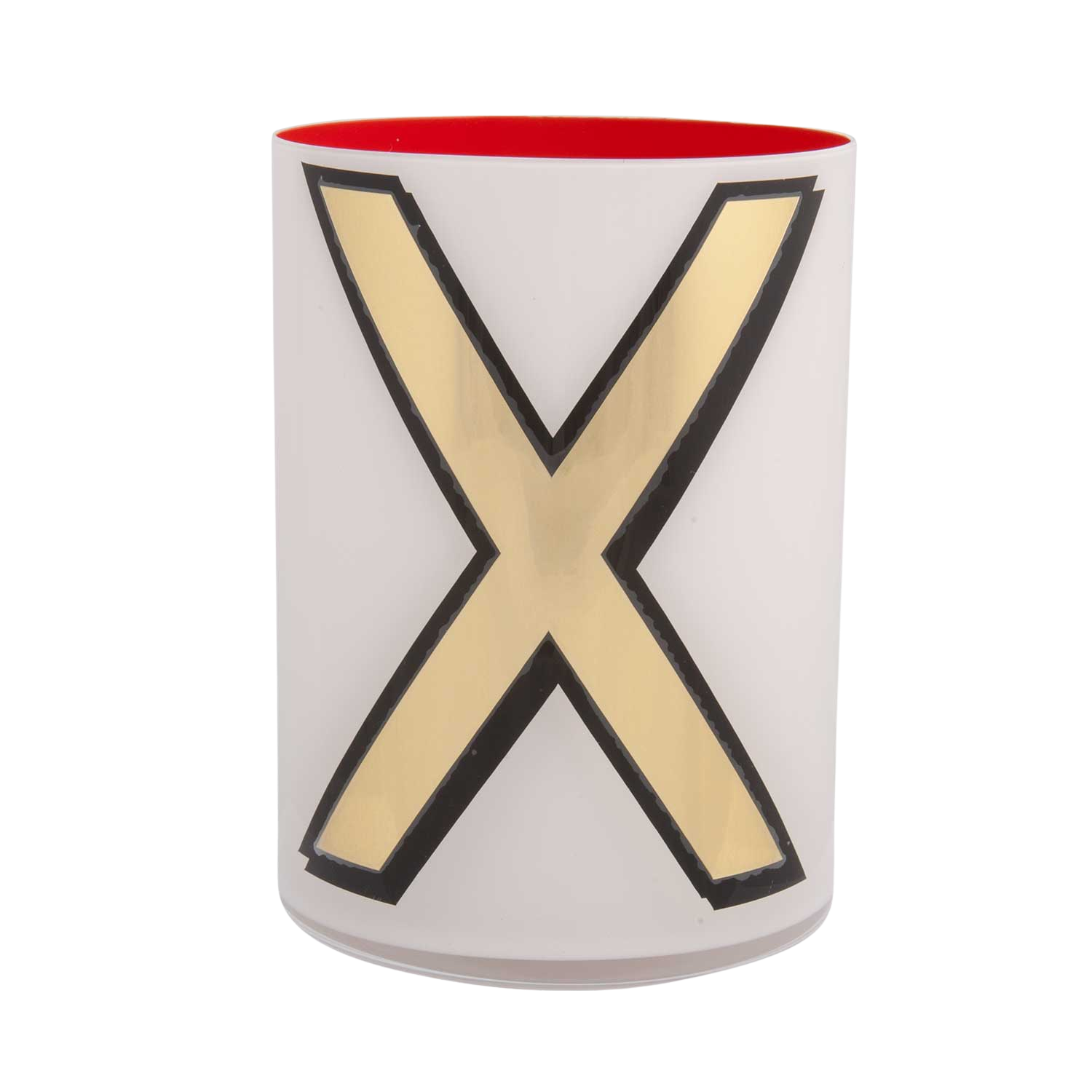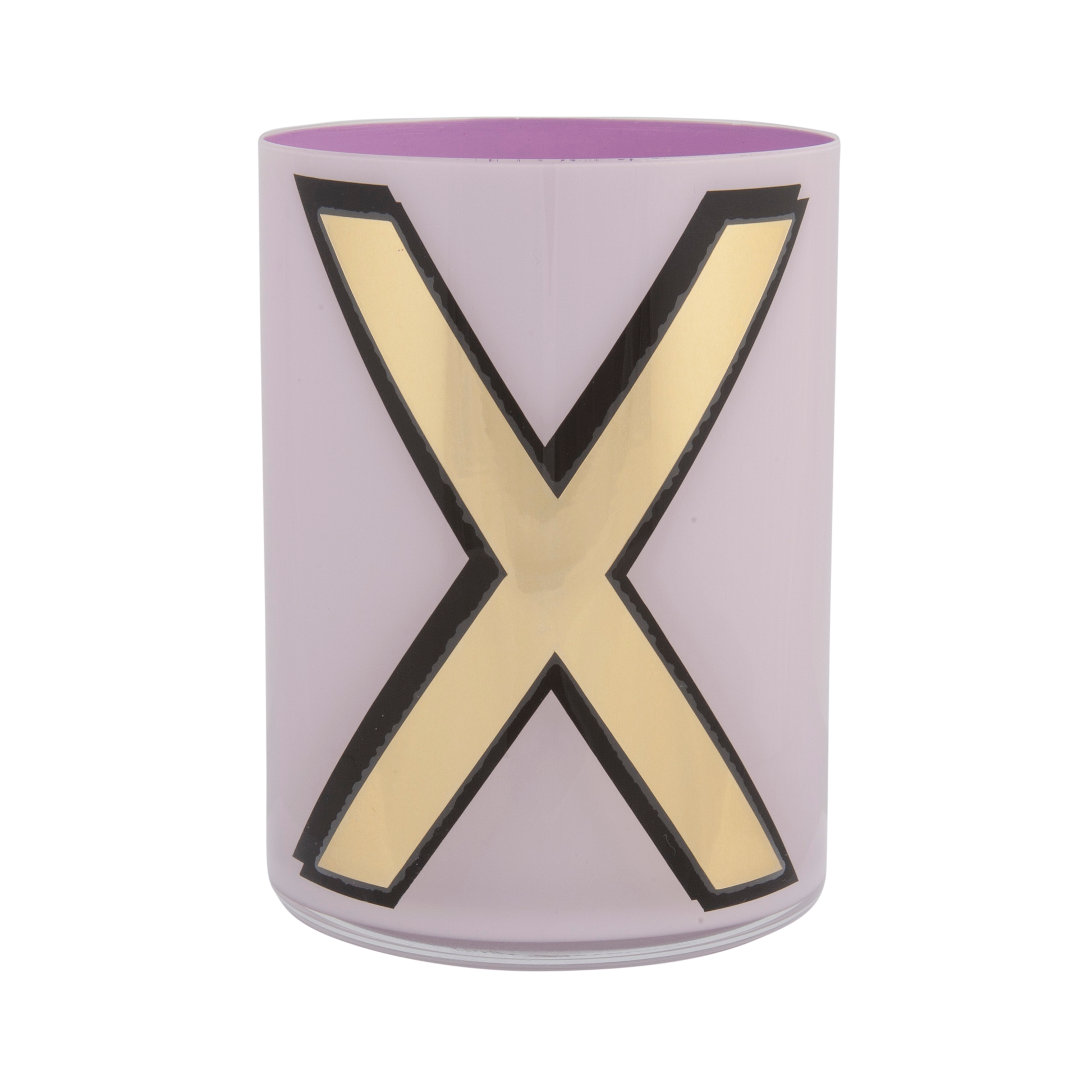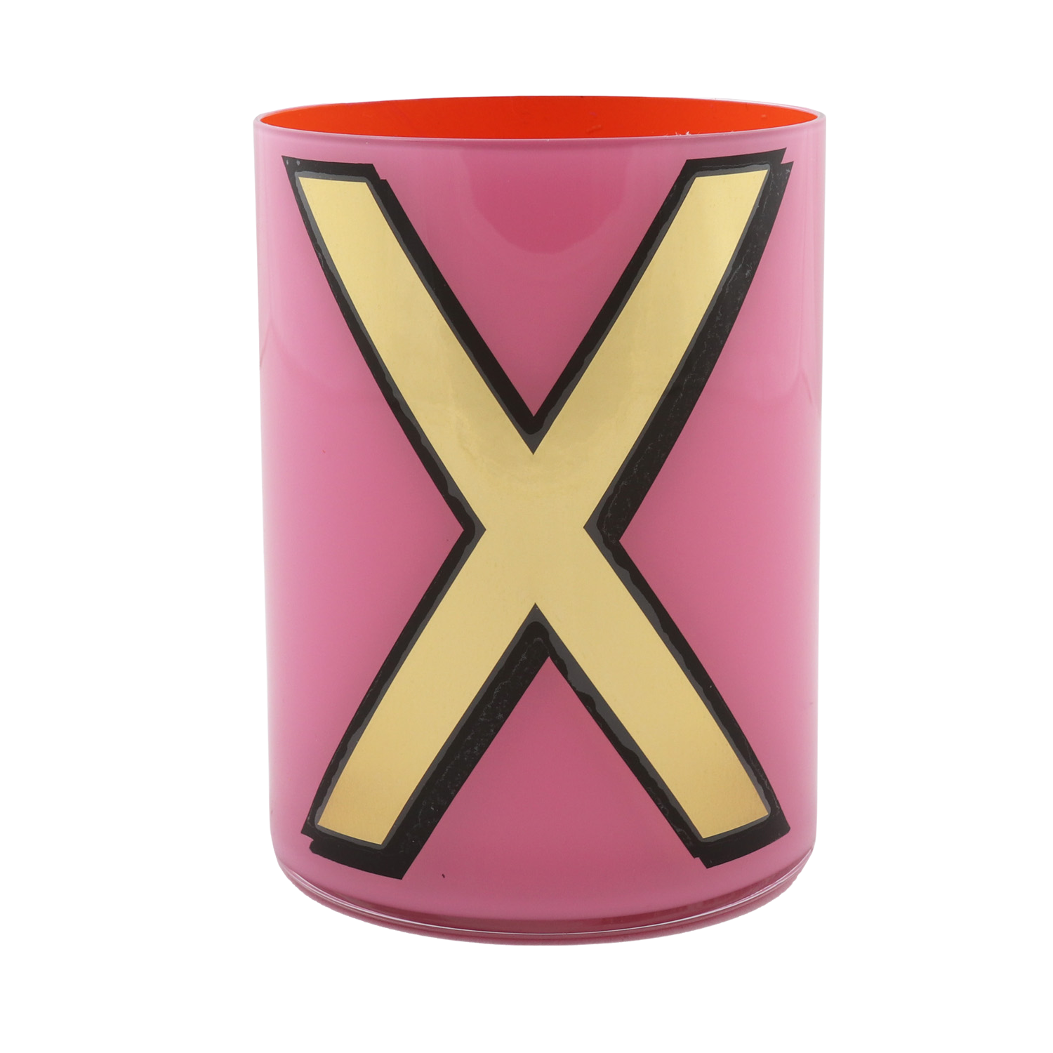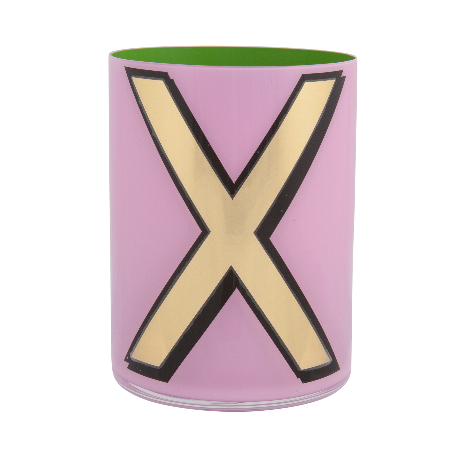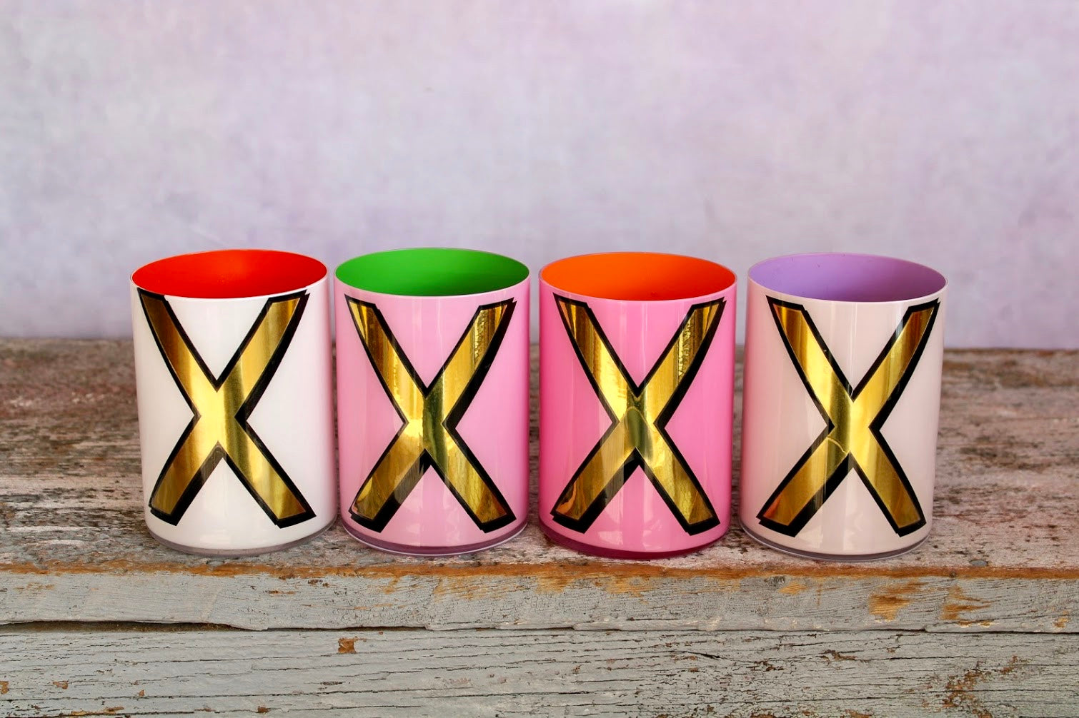 Smooth crystal tumblers inlaid with a gold vinyl letter or symbol, backed with one of six different colored lacquers and a topcoat of glossy varnish. Please note the pots are for decorative use only and are not suitable for food or drink consumption. Whilst durable, the lacquers are water-soluble so if they were ever to be used to hold flowers (which is a fabulous idea) the best thing is to put a small jar of water inside.