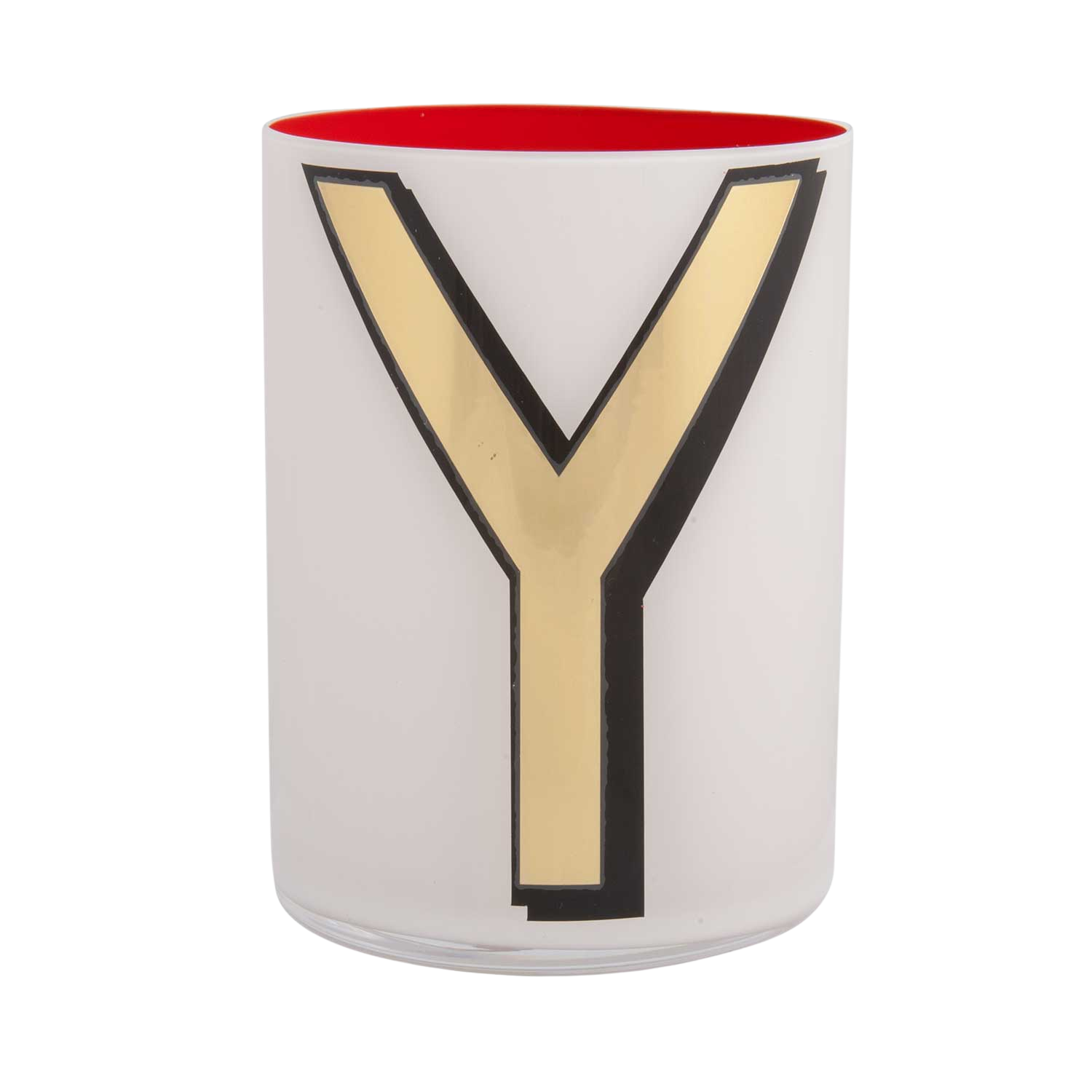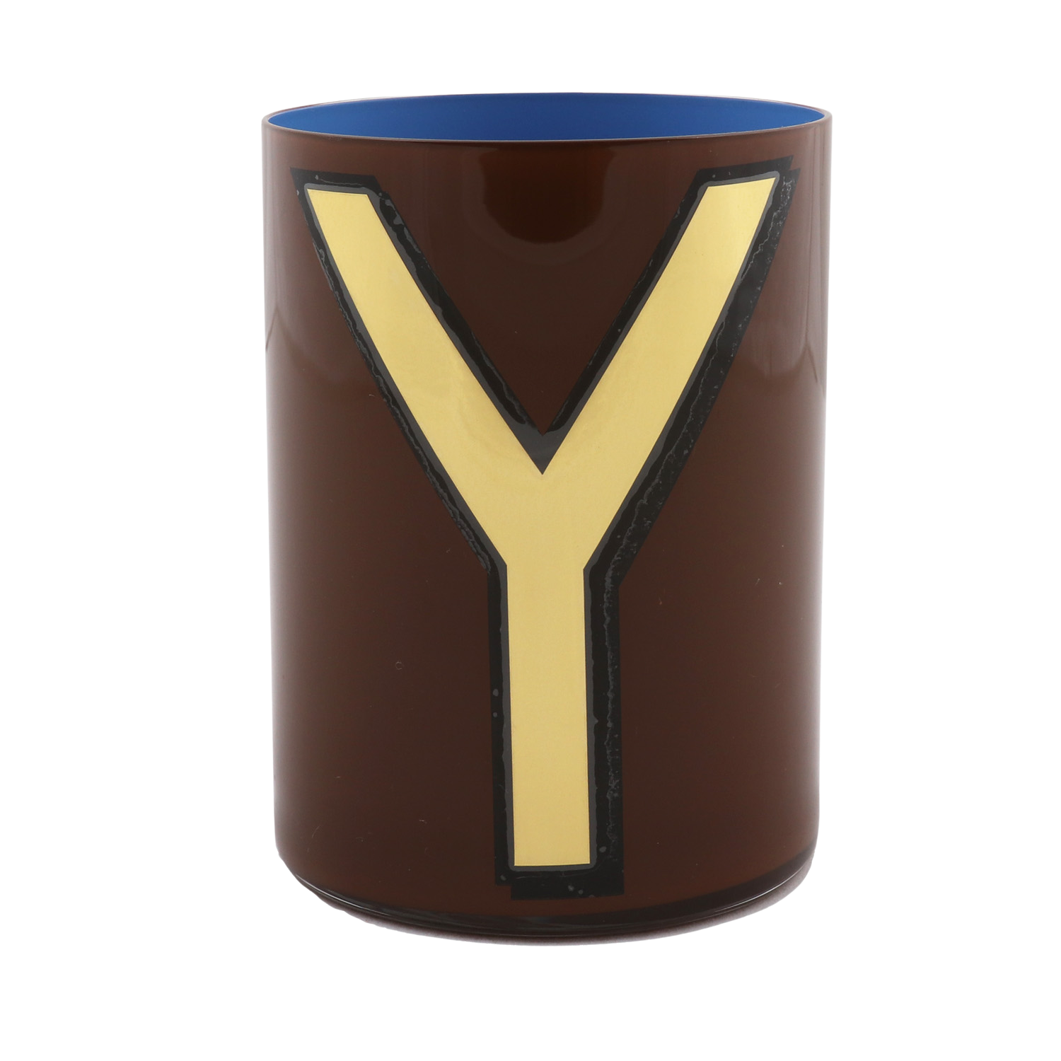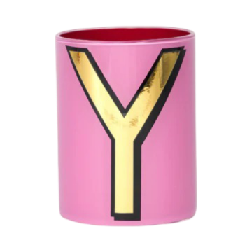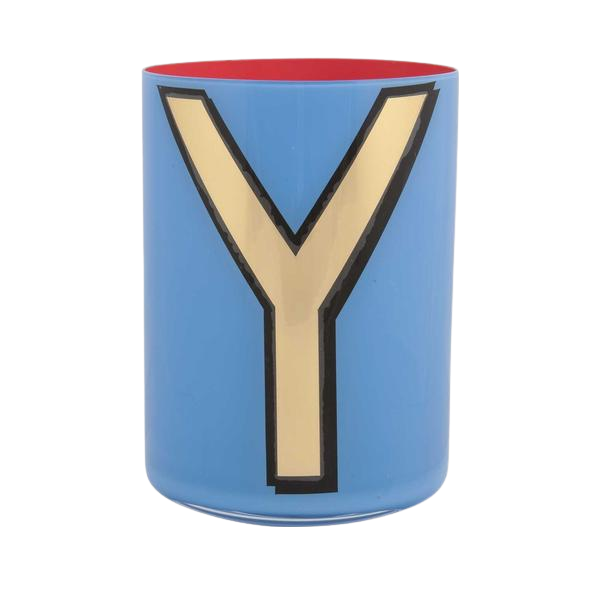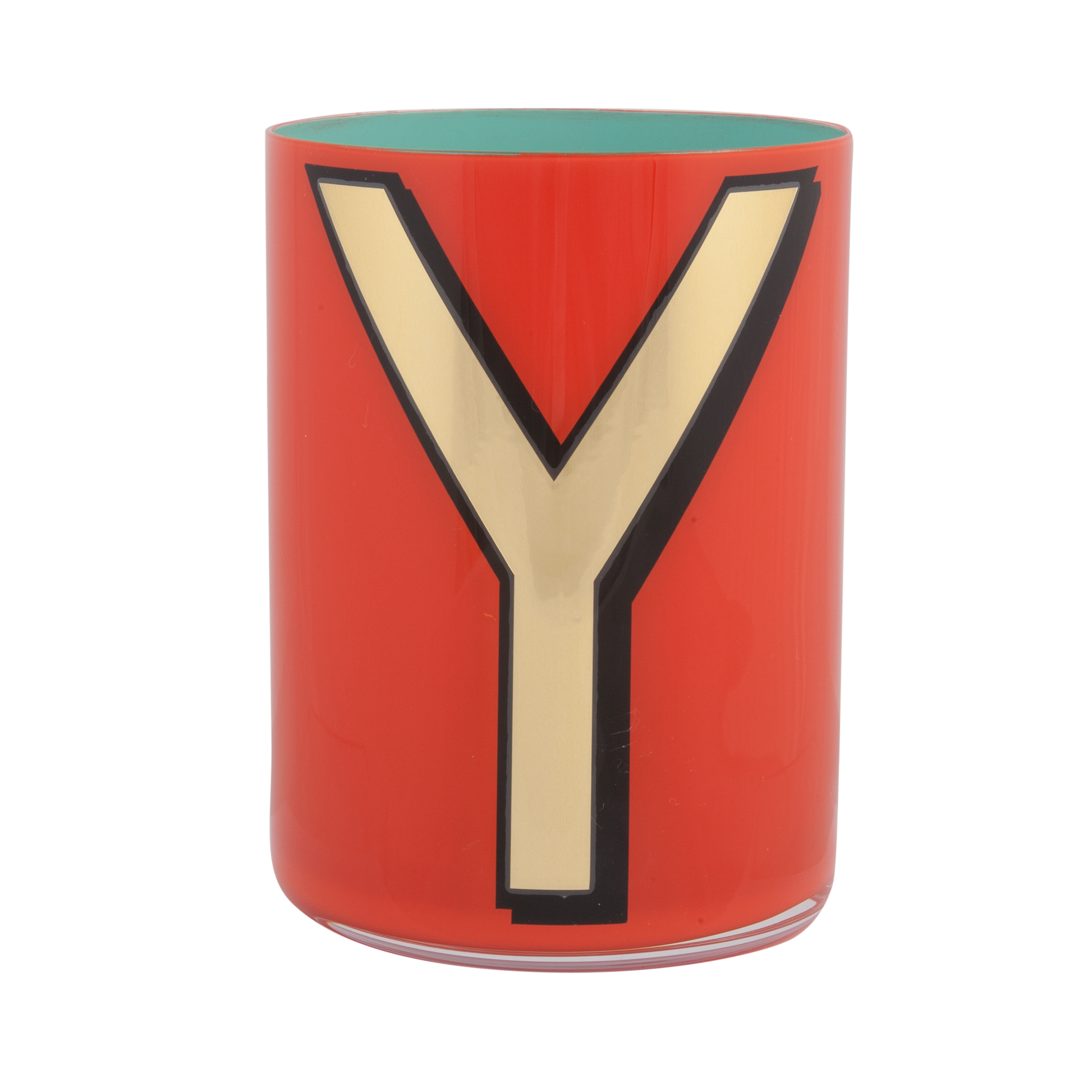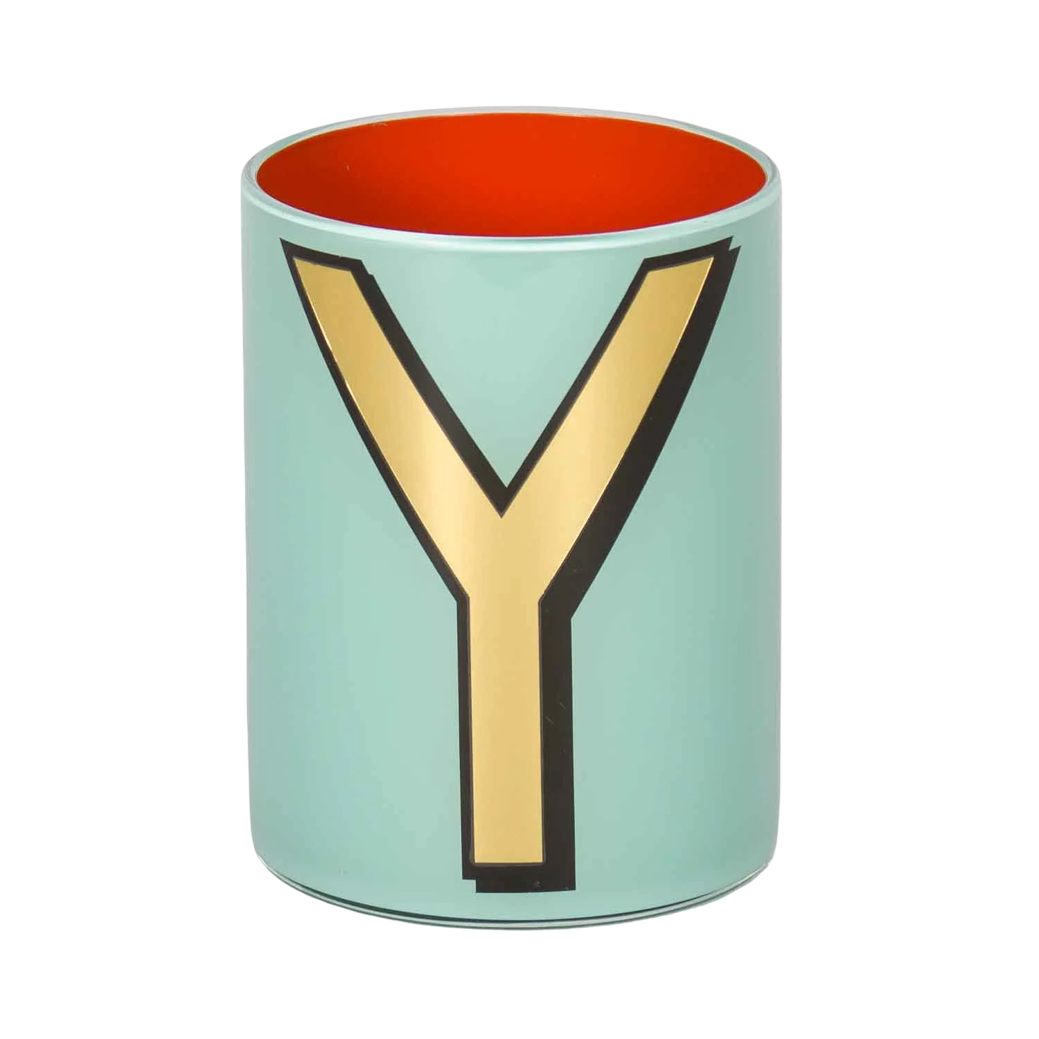 Smooth crystal tumblers inlaid with a gold vinyl letter or symbol, backed with one of six different colored lacquers and a topcoat of glossy varnish. Please note the pots are for decorative use only and are not suitable for food or drink consumption. Whilst durable, the lacquers are water-soluble so if they were ever to be used to hold flowers (which is a fabulous idea) the best thing is to put a small jar of water inside.