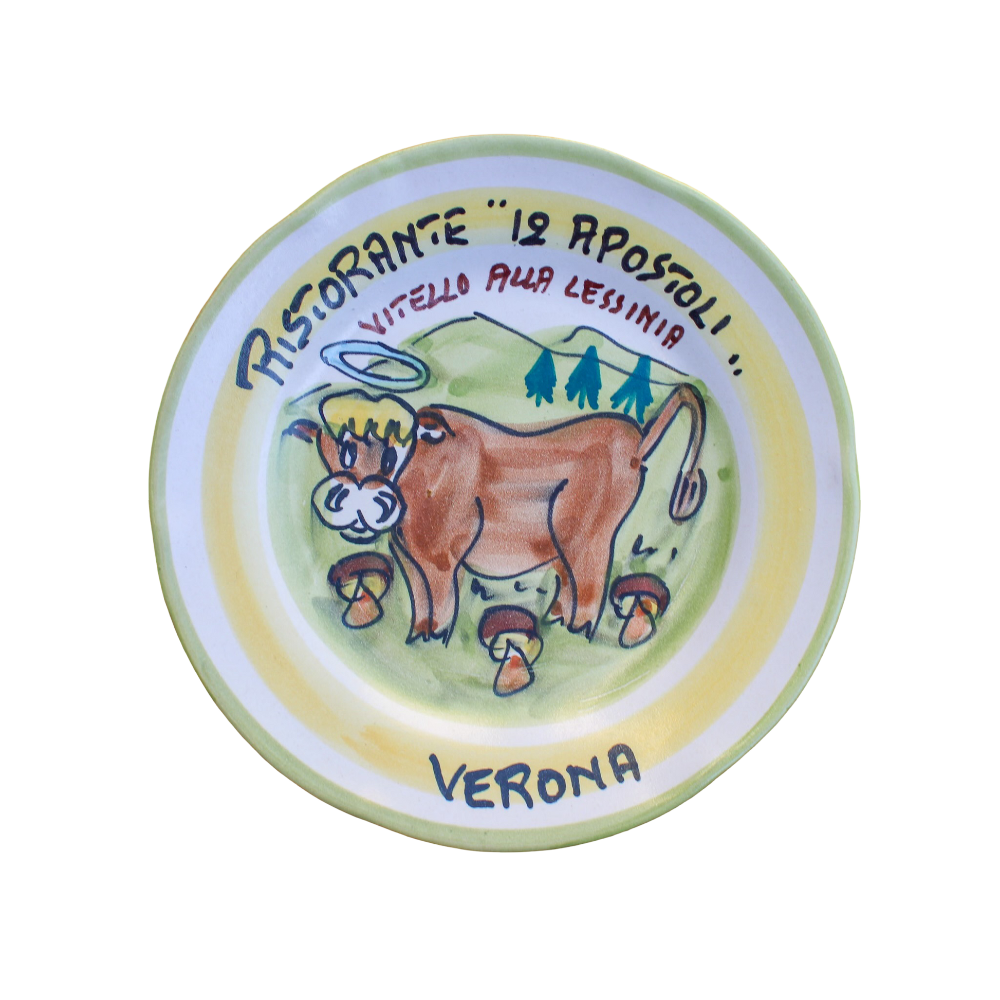 In 1964, a handful of Italian restaurant owners established the “Buon Ricordo” association. A restaurant could become affiliated only if it offered good quality and good value regional cuisine. Every Buon Ricordo affiliated restaurant had a commemorative dish custom designed to portray their most famous recipe. All dishes were hand painted in Vietri in southern Italy. Patrons of these restaurants could order their Buon Ricordo menu and receive the commemorative dish as a present. Year after year more restaurants joined the association and collecting these dishes literally became a mania for many Italians, mostly between the late 60’s and late 80’s.