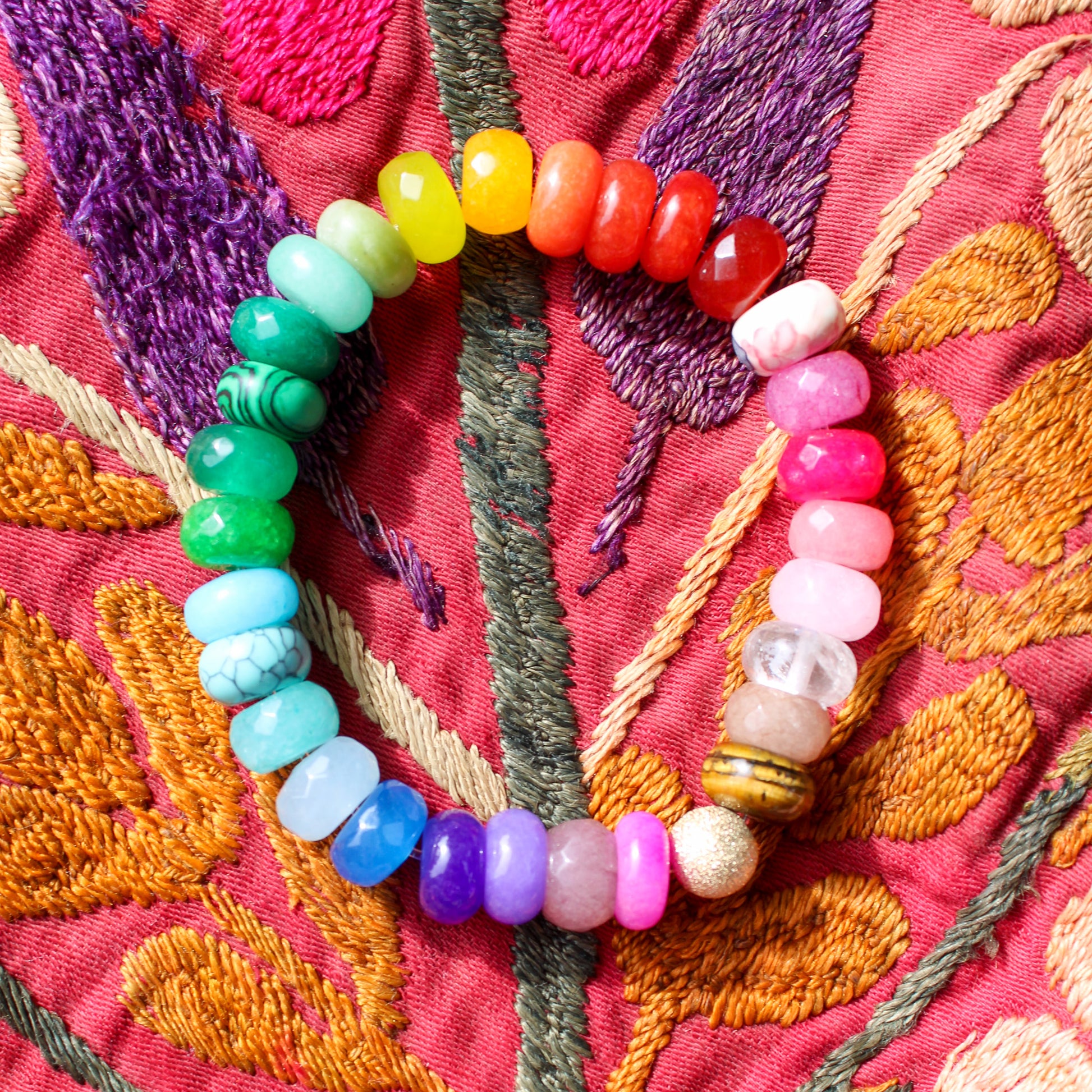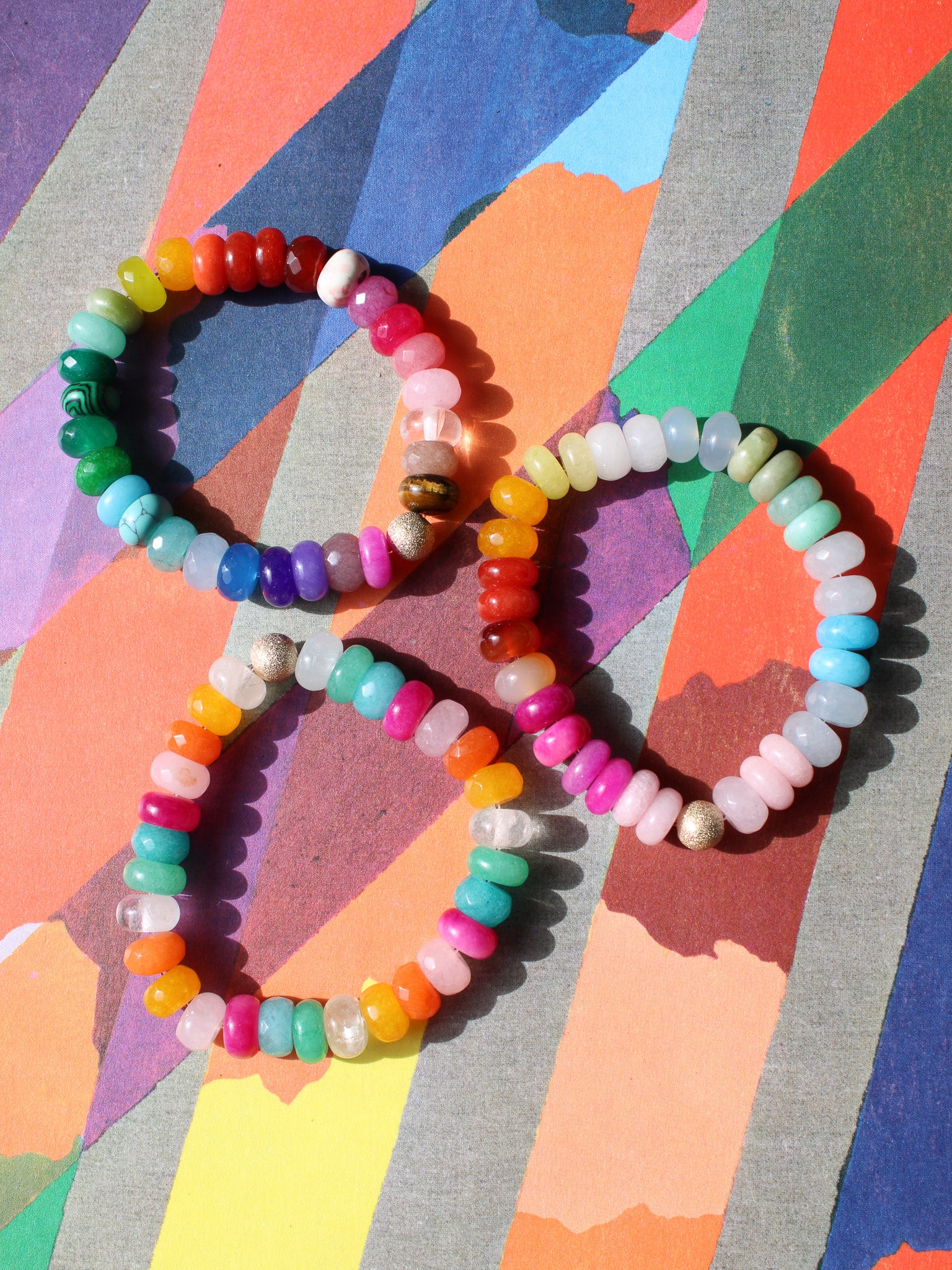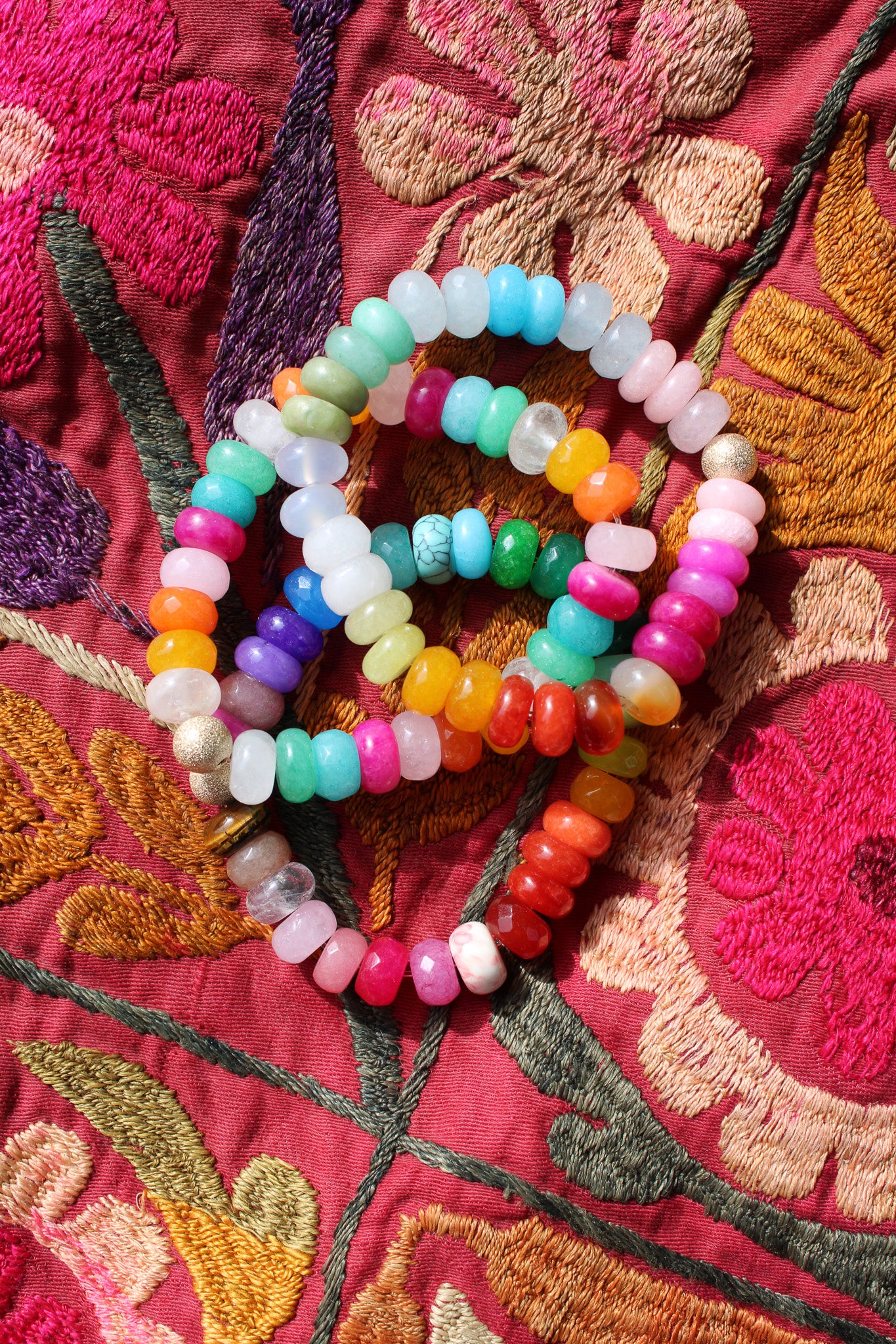 Seally Mimi makes playful, colorful bracelets and chokers made from smooth, semiprecious stones. Each piece is handmade in Switzerland, and the stones are charged with a specific "Seally Energy" to encourage wellness for the wearer. These are intended to stack, mix, match, or wear alone.