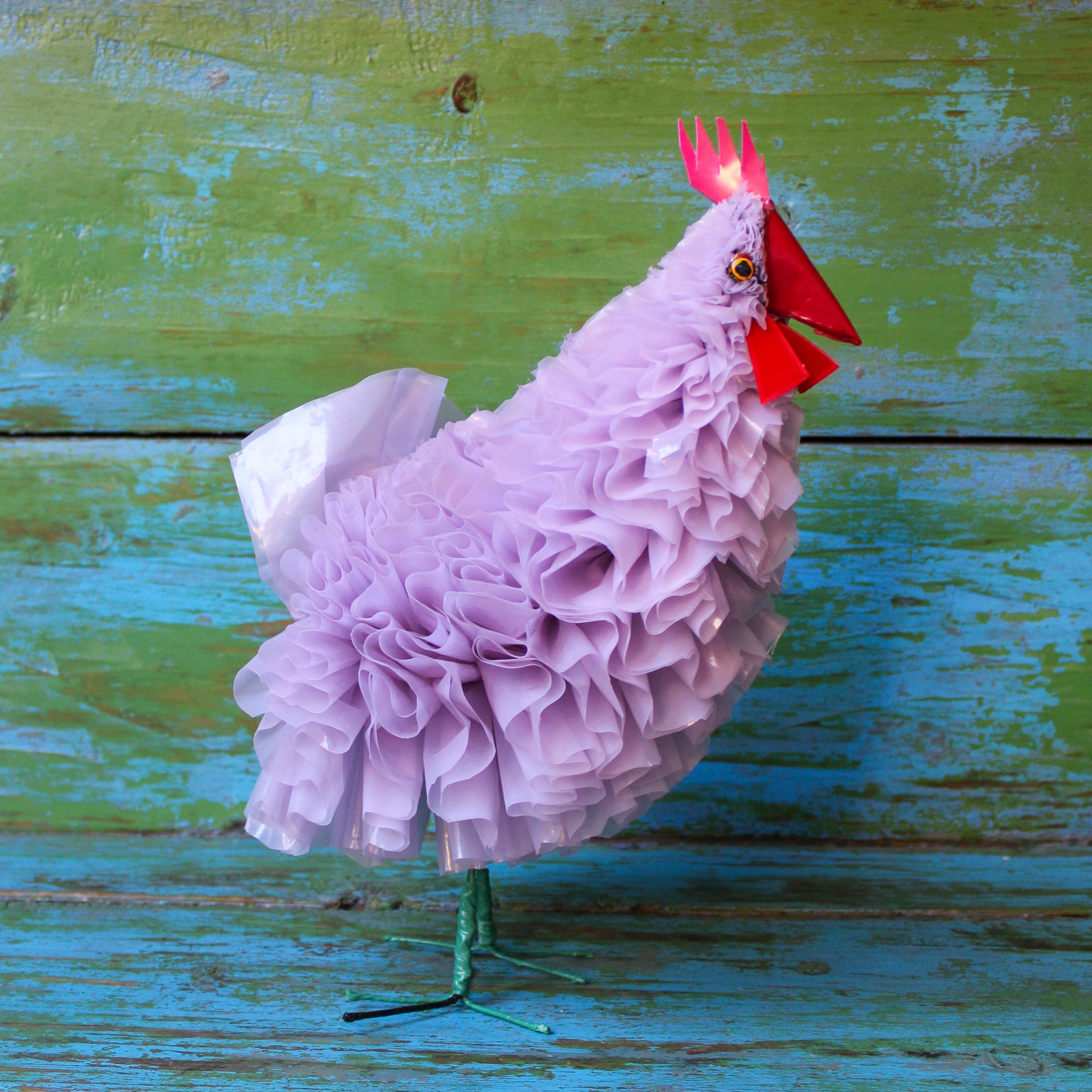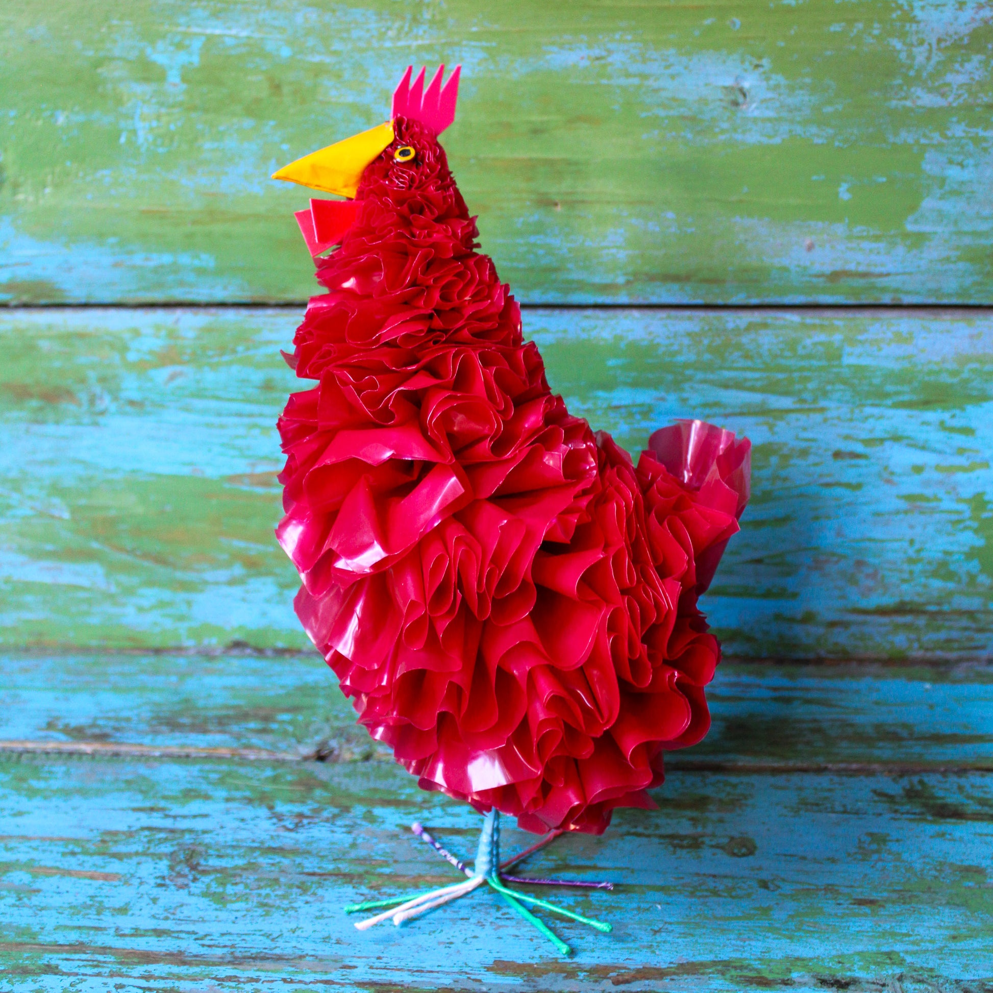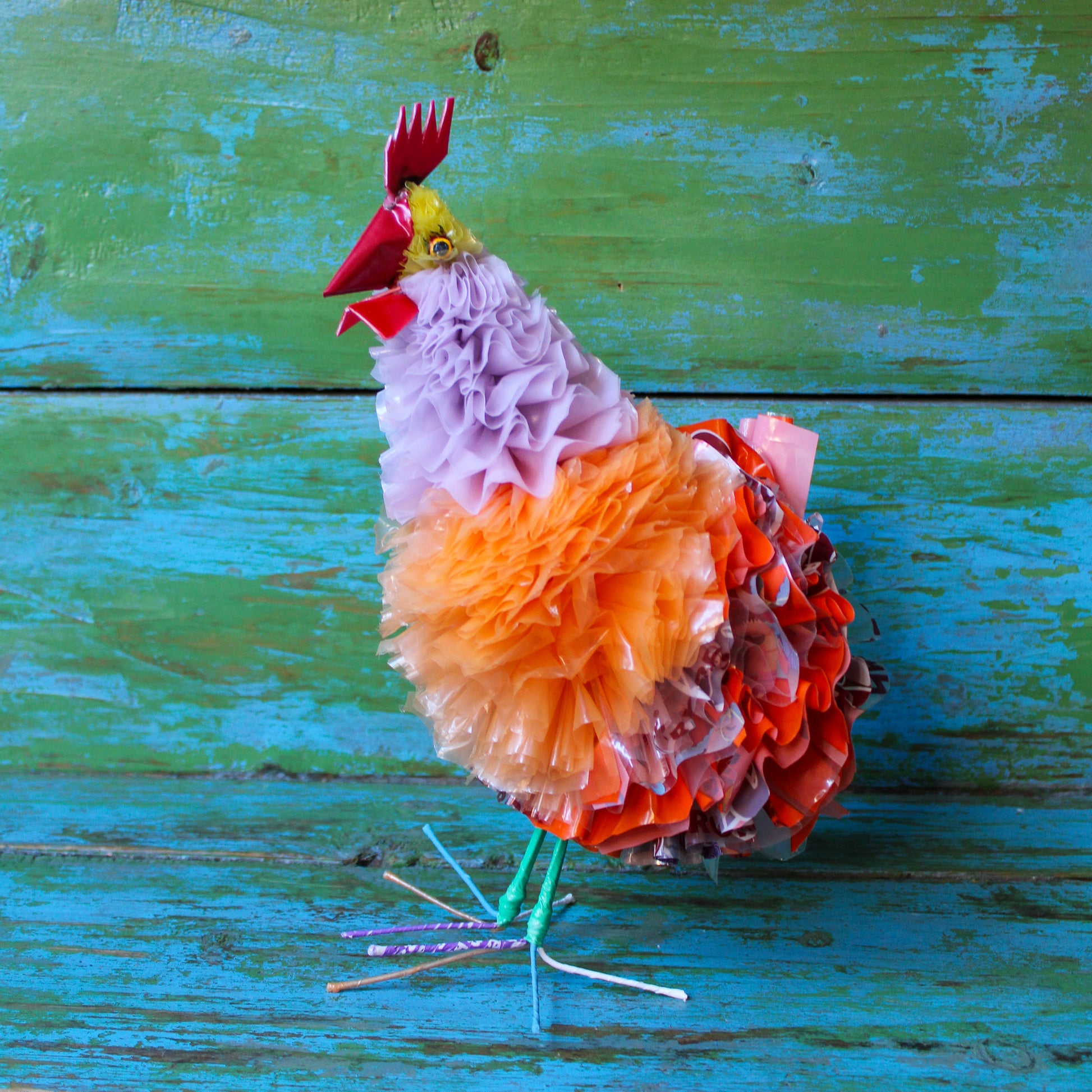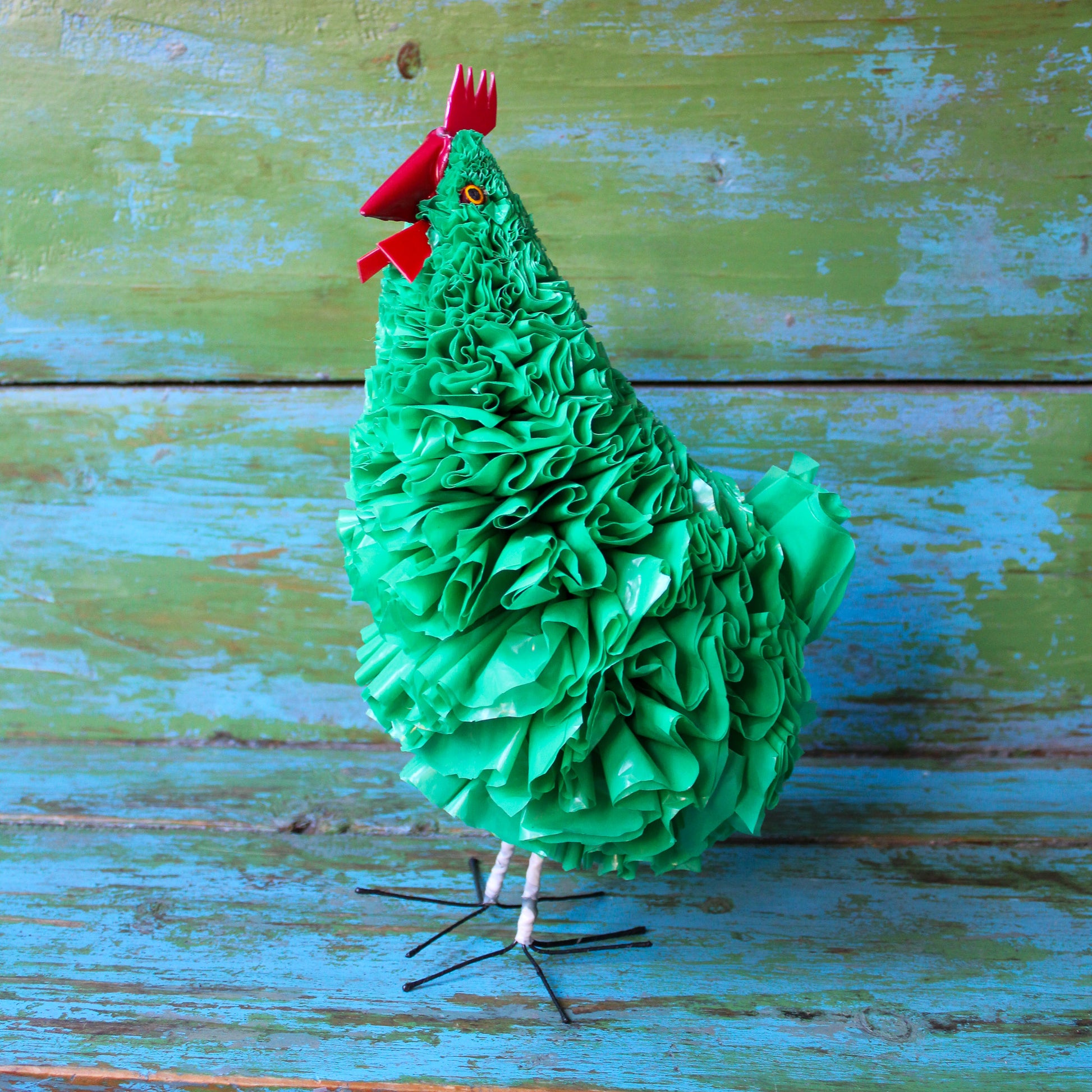 Fun and whimsical decorative chicken object made from recycled plastic bags with metal and plastic accents. Handmade by artisans in South Africa. No two are alike!!