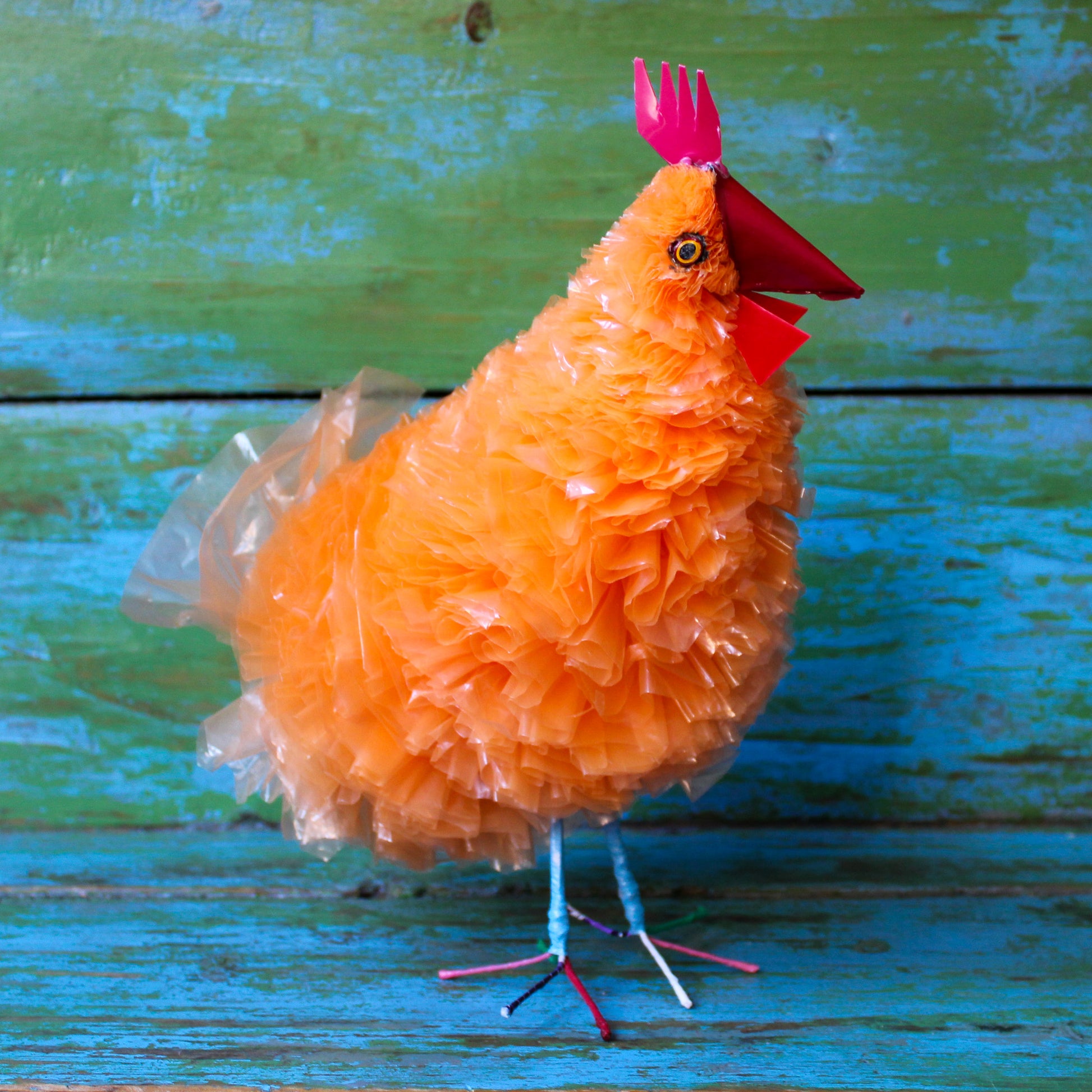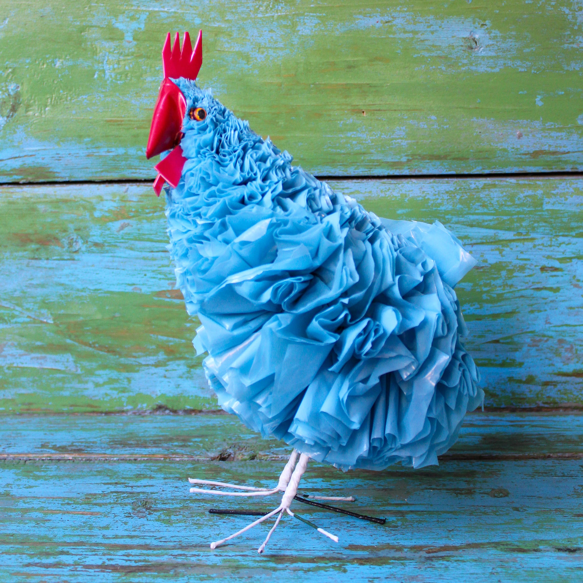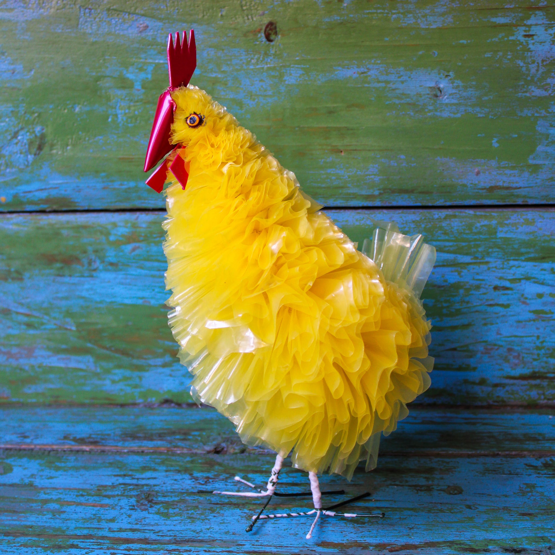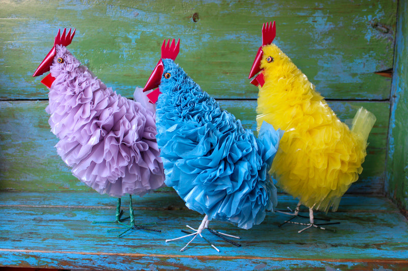Fun and whimsical decorative chicken object made from recycled plastic bags with metal and plastic accents. Handmade by artisans in South Africa. No two are alike!!