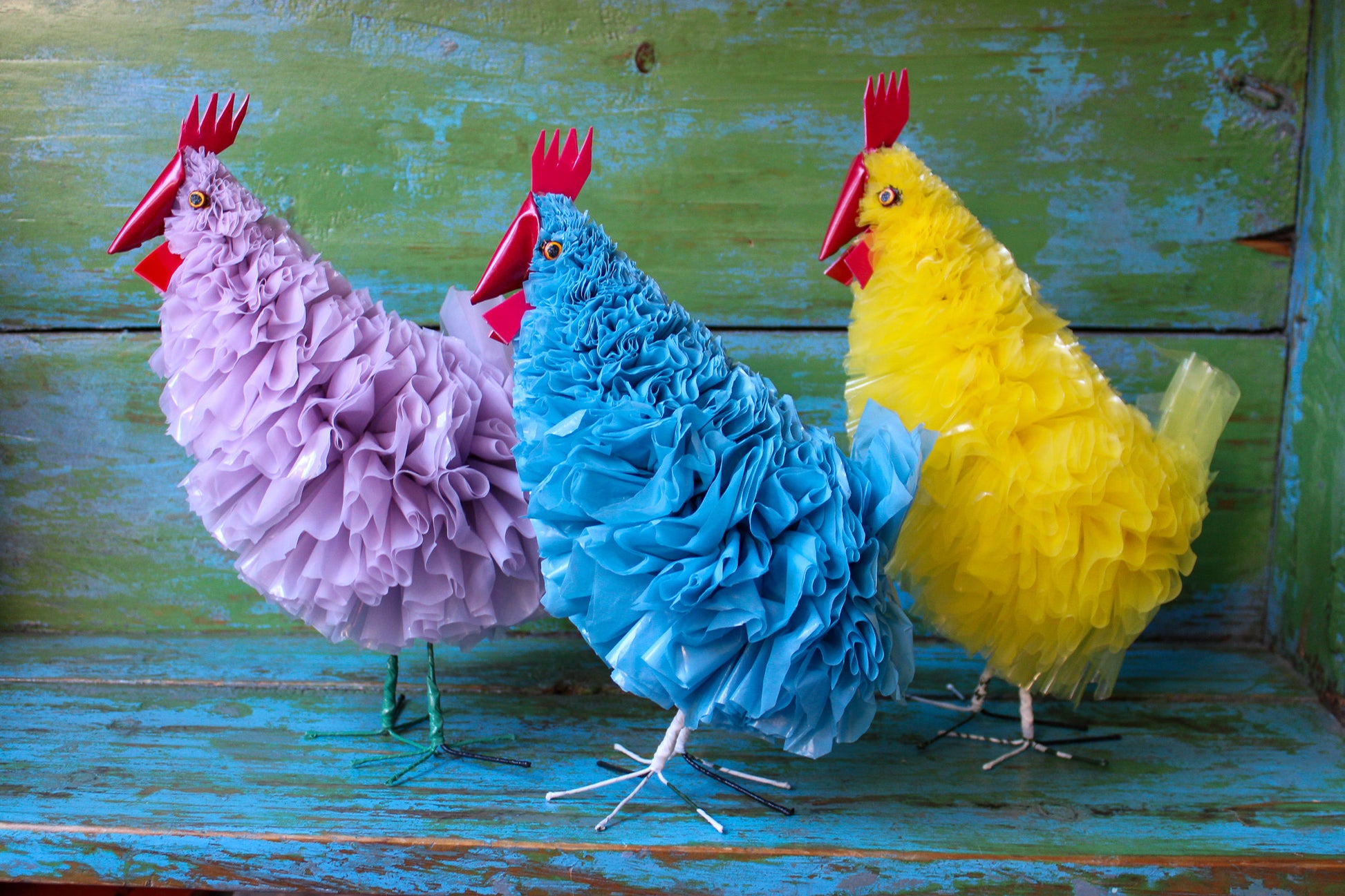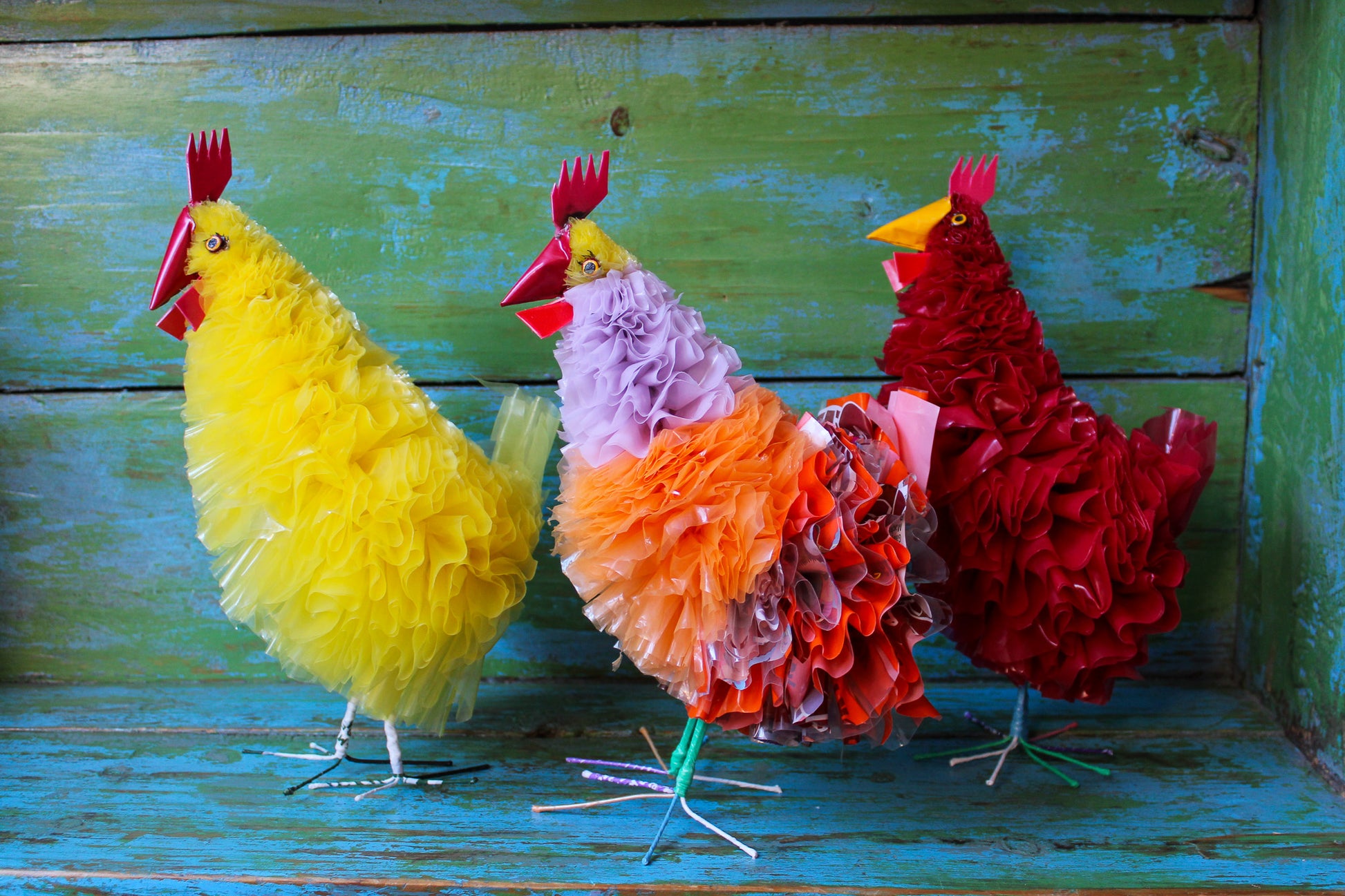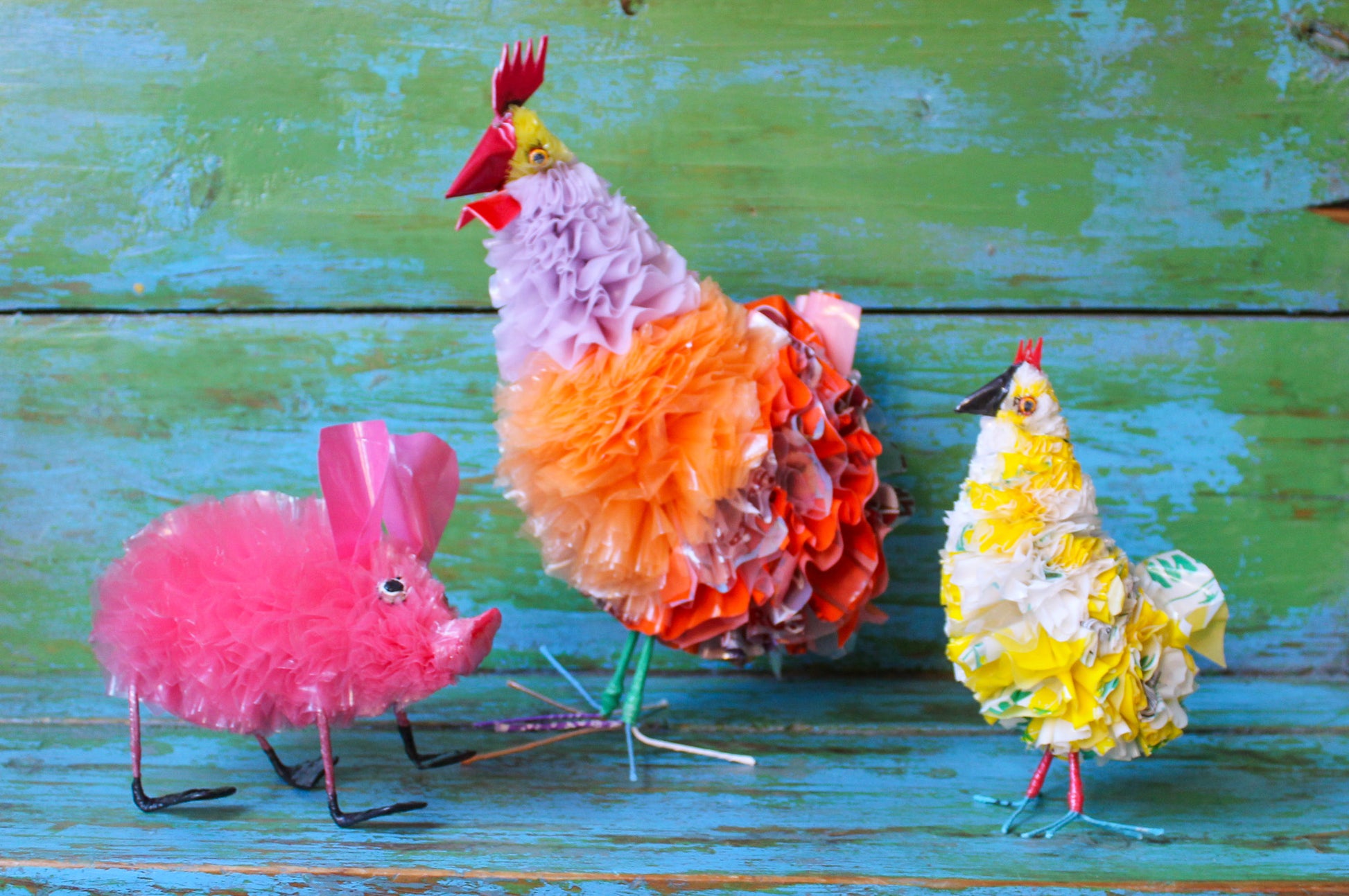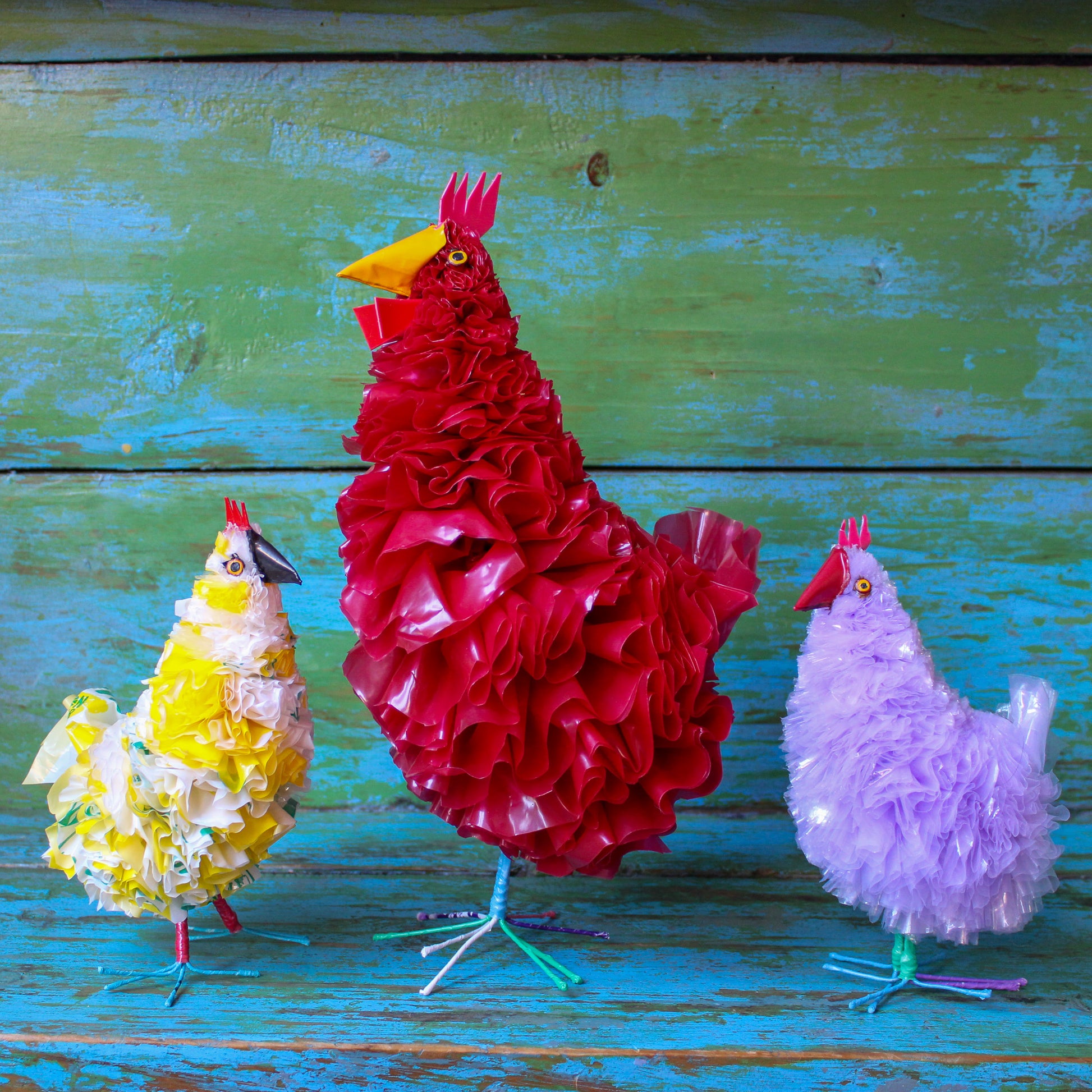 Fun and whimsical decorative chicken object made from recycled plastic bags with metal and plastic accents. Handmade by artisans in South Africa. No two are alike!!