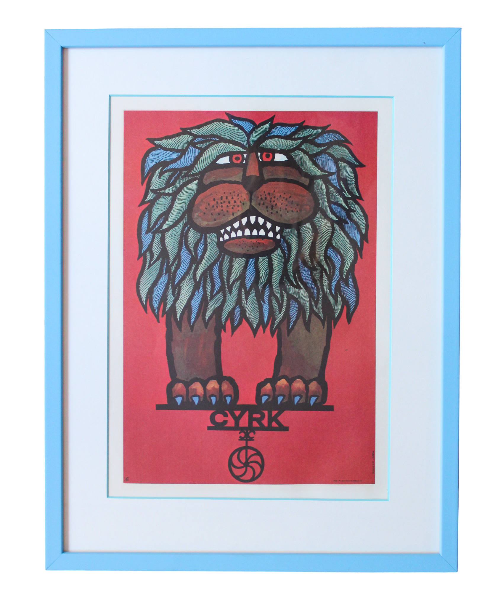 Hubert Hilscher Circus poster print custom framed in light blue wood frame.