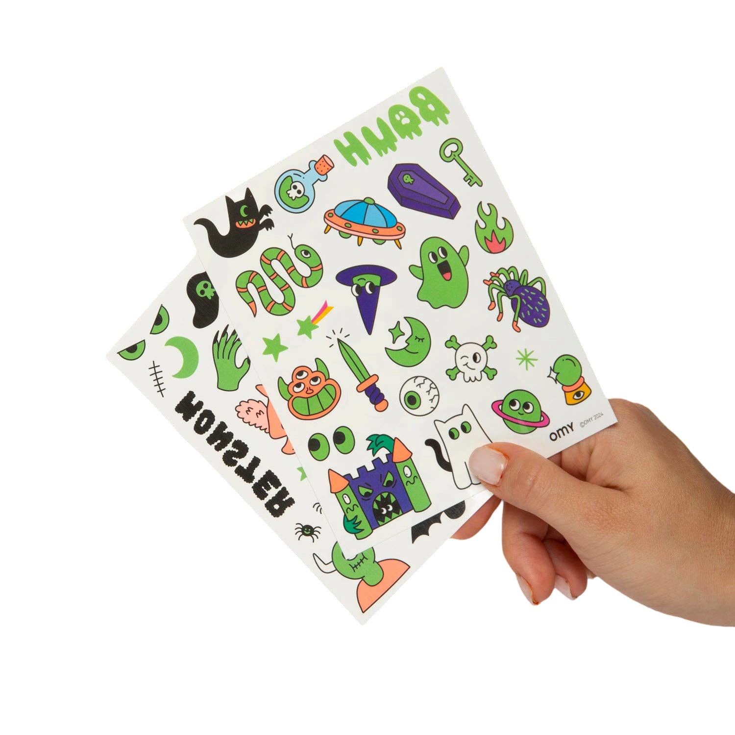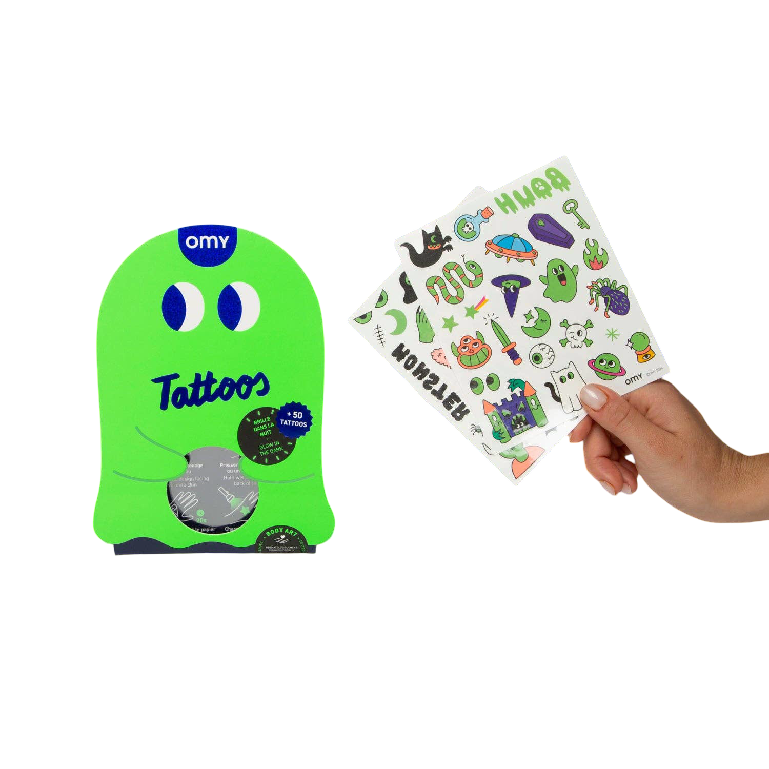 50 Glow-in-the-Dark Tattoos – They shine in the dark! Ready for some spooky fun? This sheet of 50 temporary tattoos takes you into a world full of mischievous ghosts and other funny (and slightly scary) creatures. ✨ Magical bonus: the tattoos glow in the dark! Perfect for surprising your friends, laughing, and transforming yourself when the lights go out… Easy to apply and dermatologically tested, they’re safe and fun for Halloween—or anytime you want a little frightful fun!