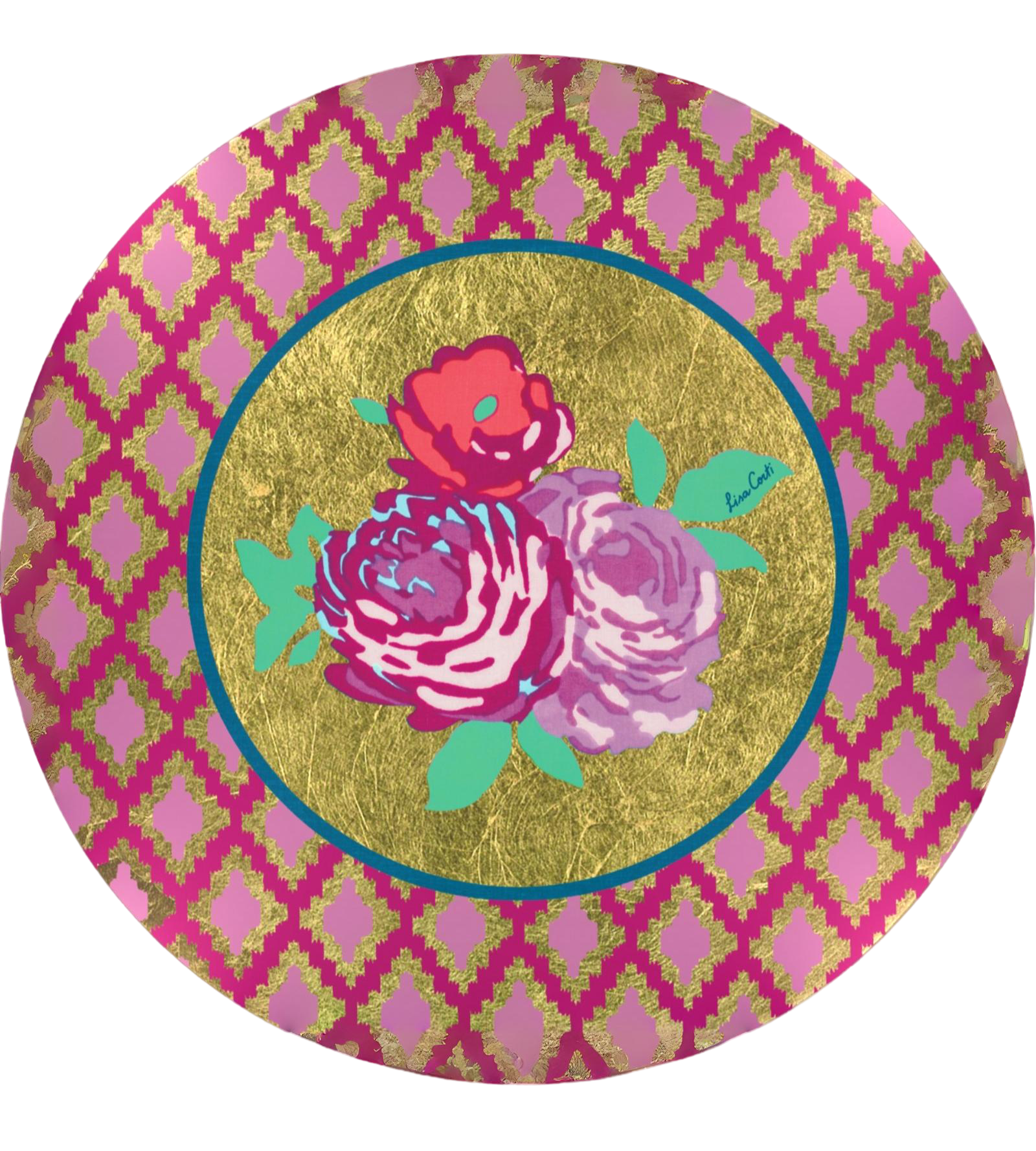 13.4" round. 94% wood fiber, 2% cork, 2% gold foil, 2% polyester.
