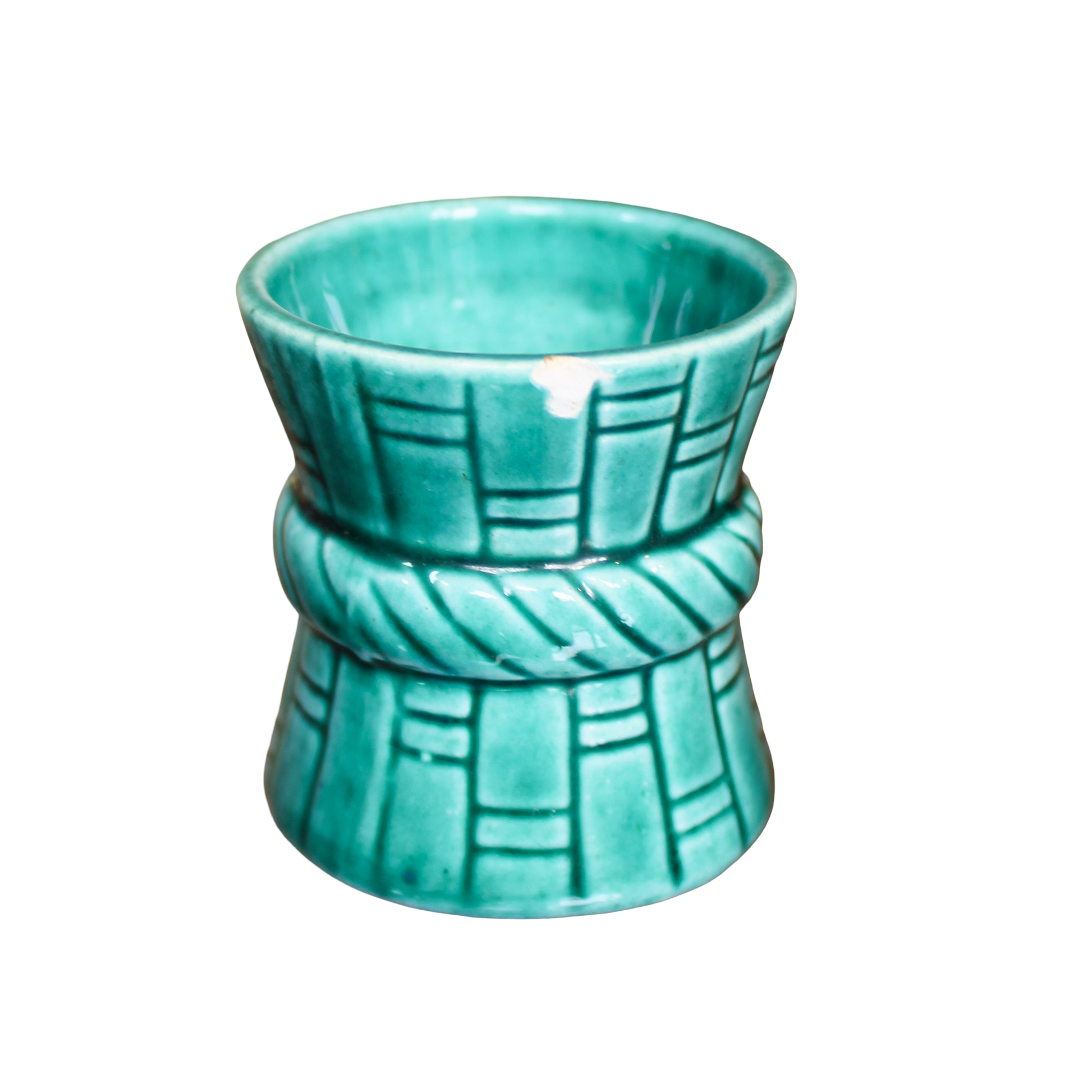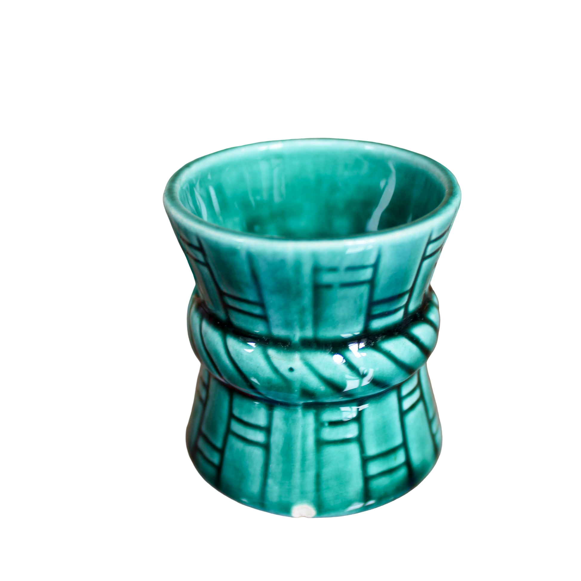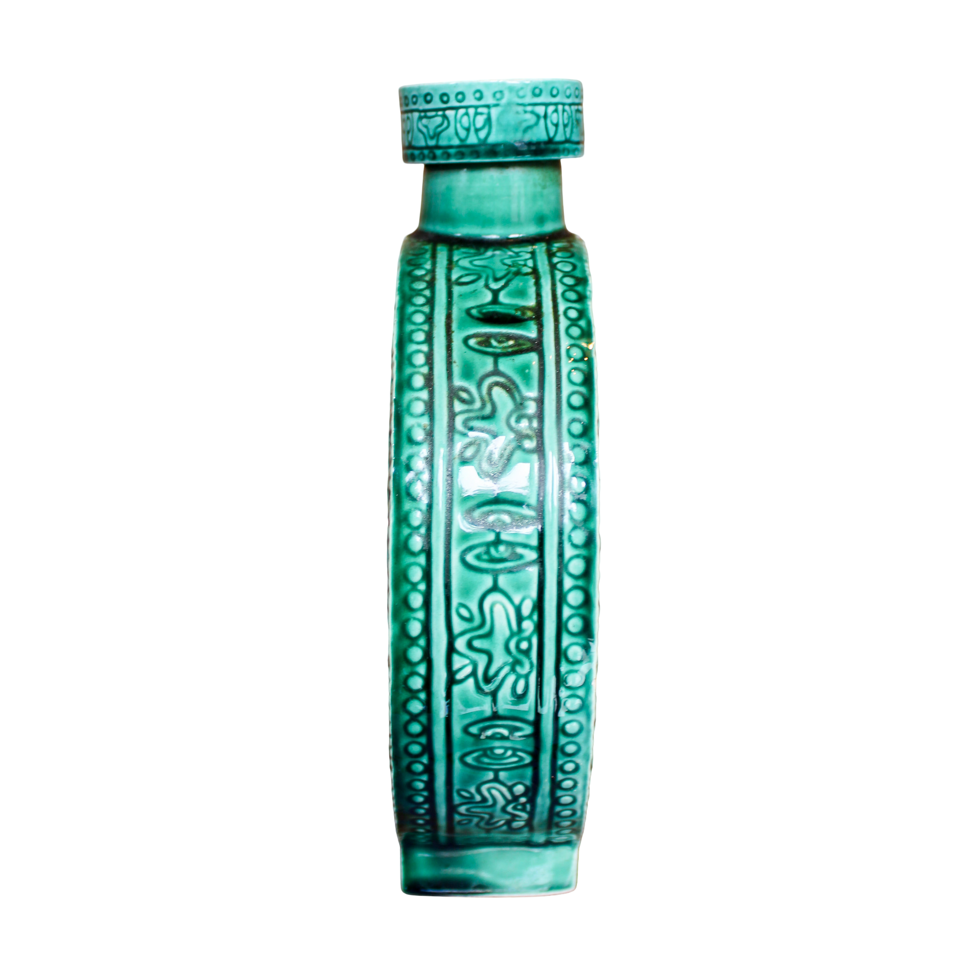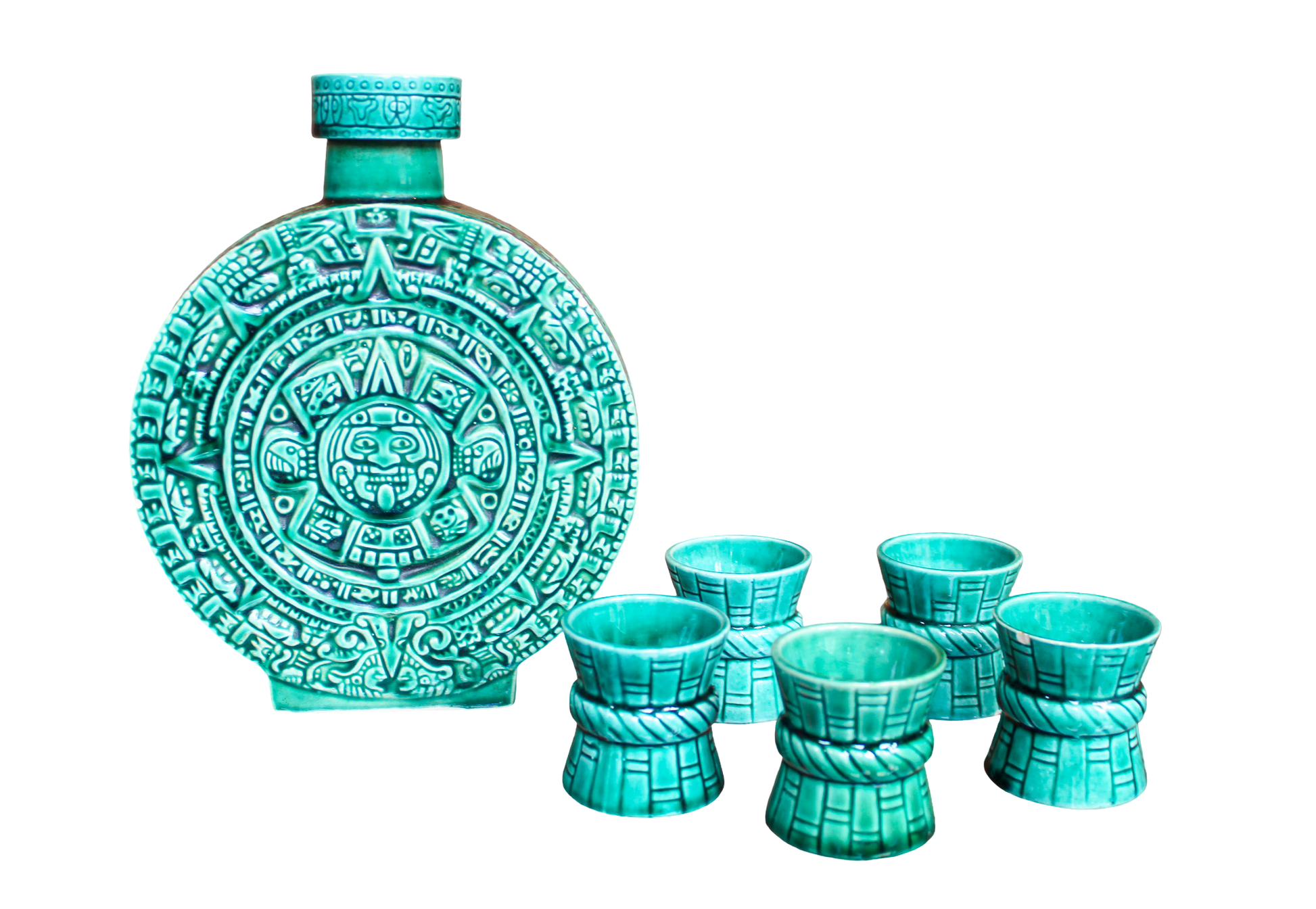 Ceramic vintage bottle decanter and shot glass set with Aztec design.