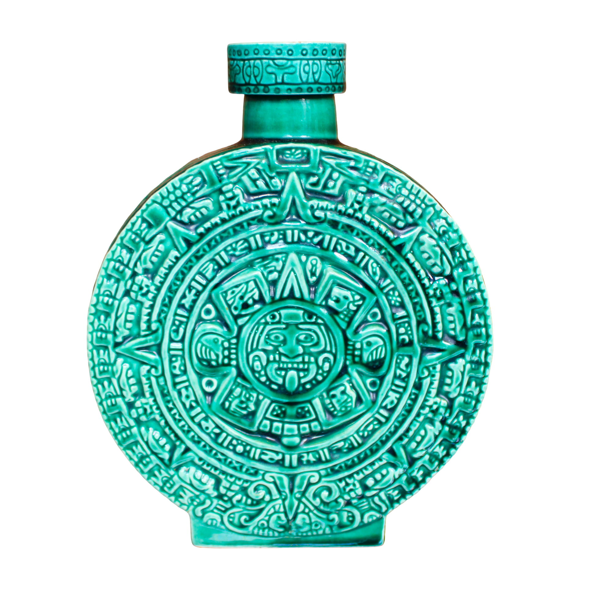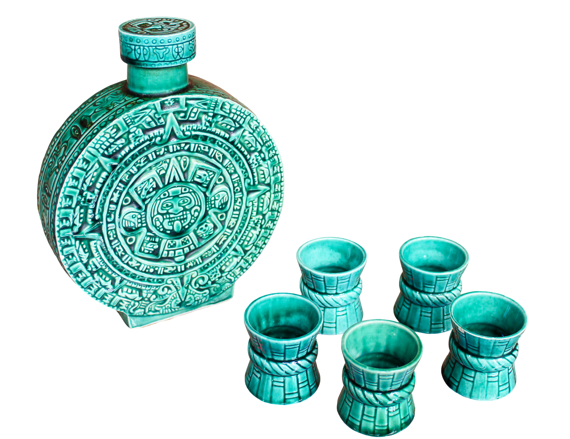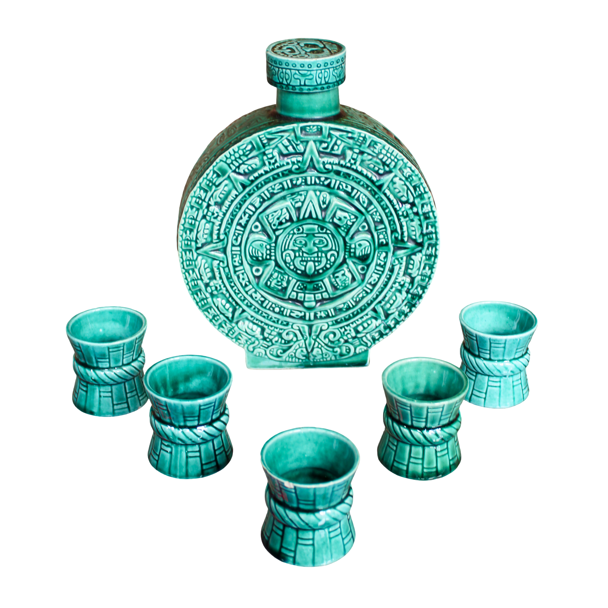 Mid-Century Aztec Calendar Bottle & 5 Shot Glasses