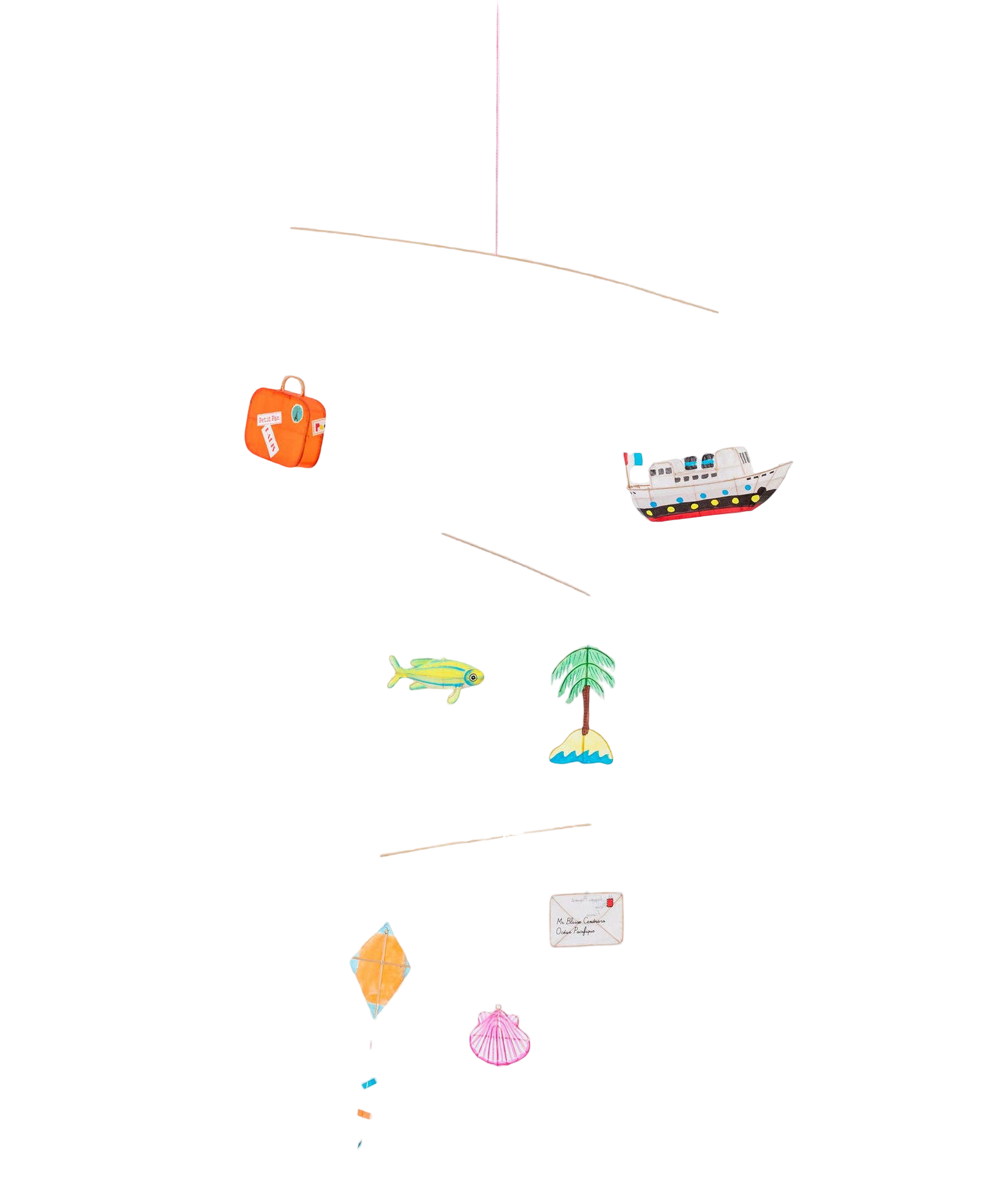 Dive into the fabulous world of Petit Pan with our Planets Mobile. Composed of the planet Earth, a second beautiful unknown and very colorful planet, a rocket, a star, and a moon quarter, this mobile is delicate and poetic. It transforms your child's room into a cocoon of softness conducive to sleep. It is made of bamboo and hand-painted silk.