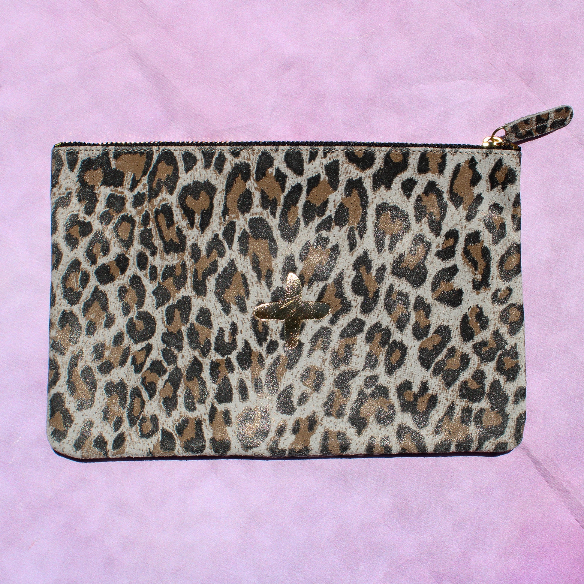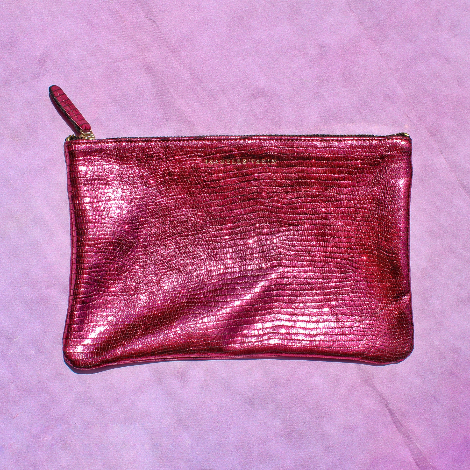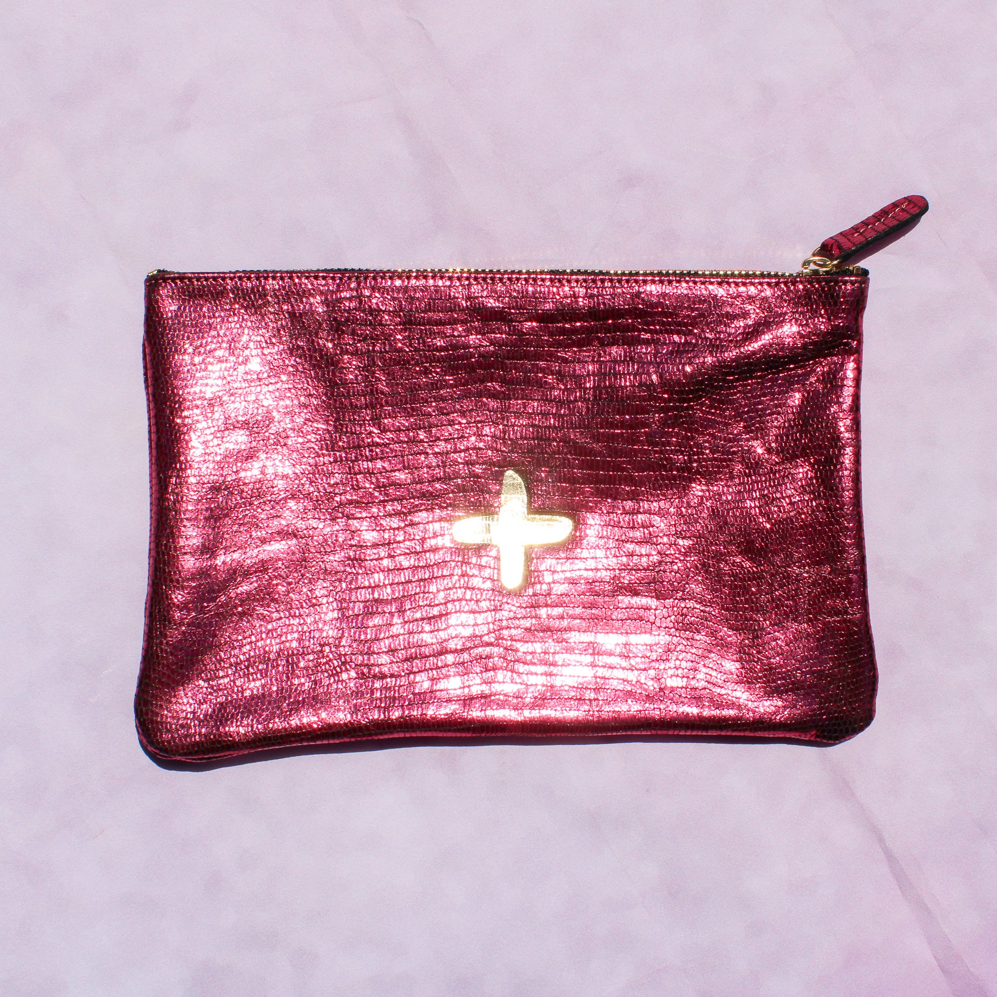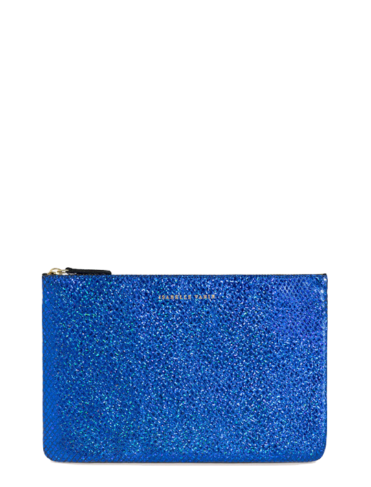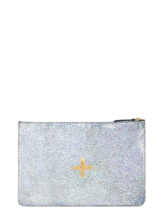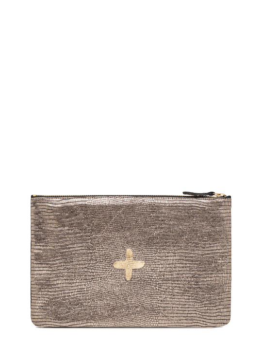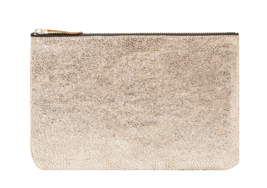 Shimmery metallic leather pouch in a universal size to carry all your essentials! Use as a little clutch on its own or pack it with goodies to throw in a larger bag.