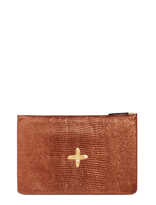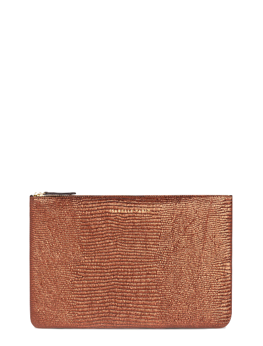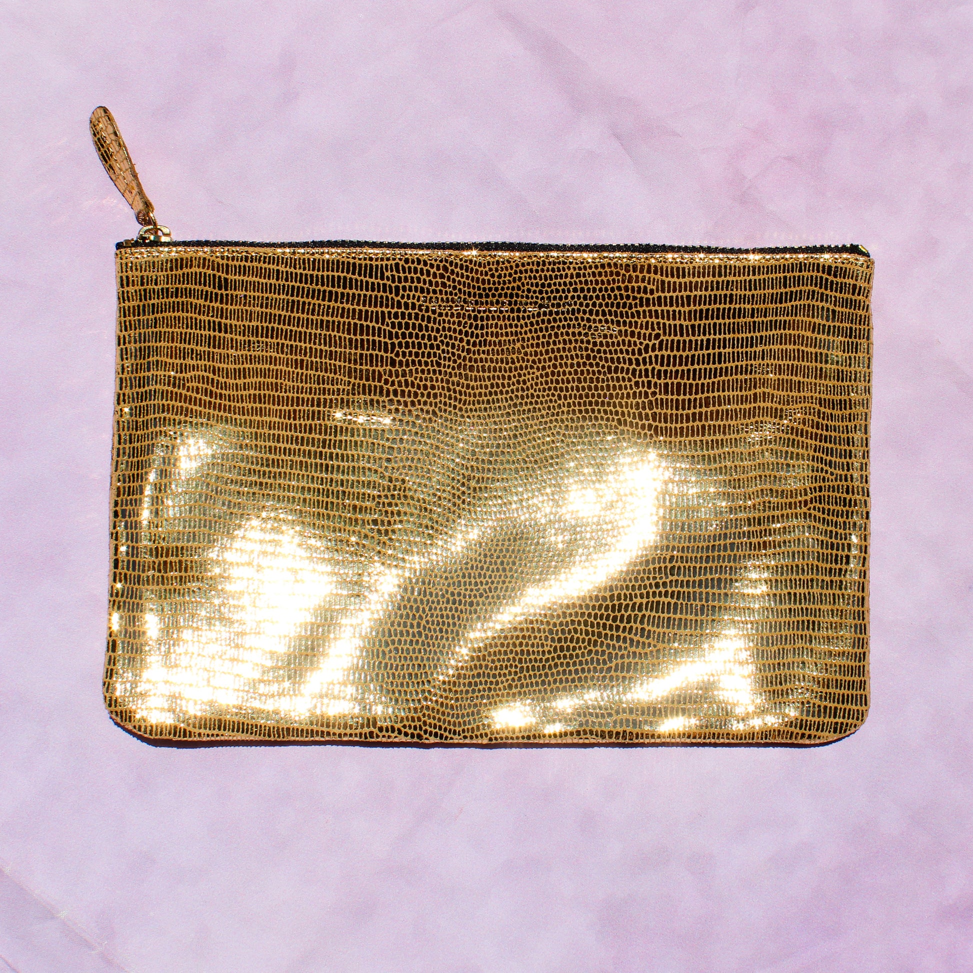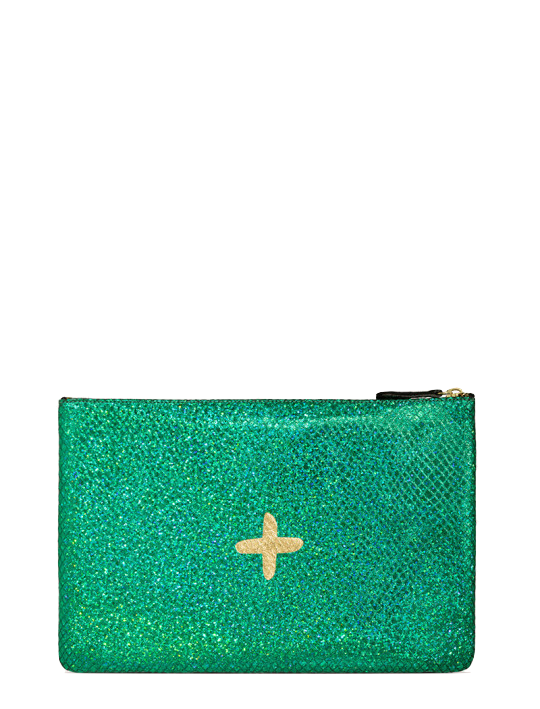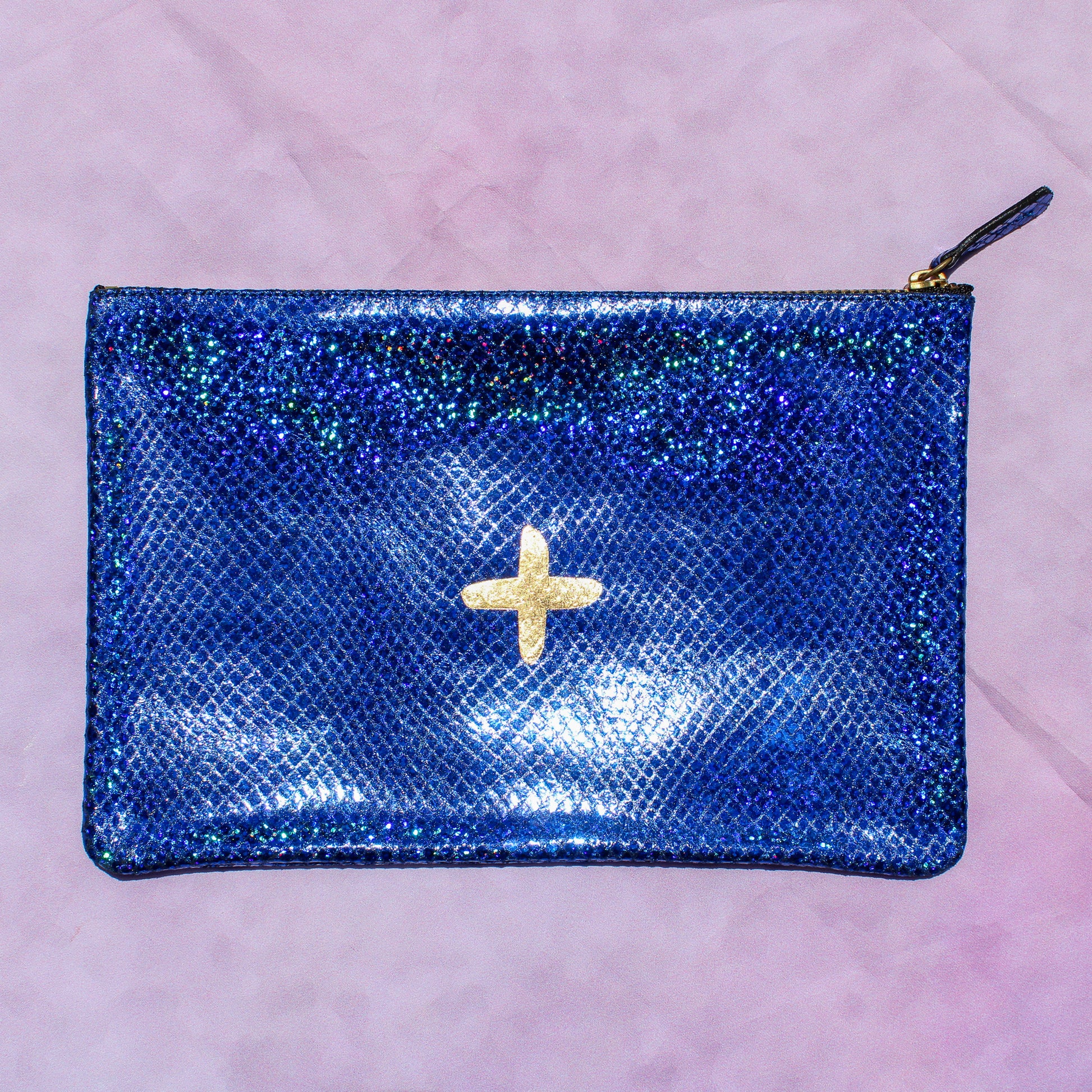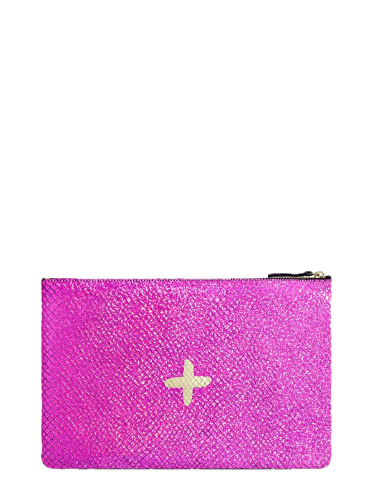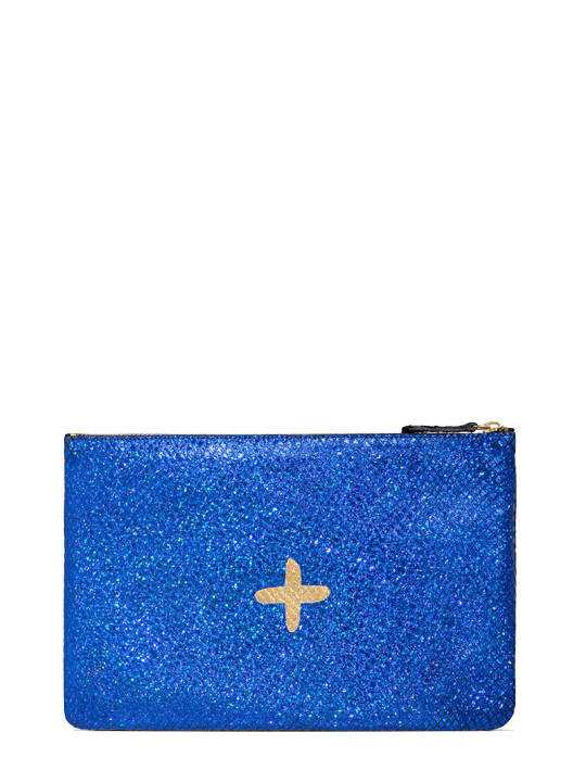 Shimmery metallic leather pouch in a universal size to carry all your essentials! Use as a little clutch on its own or pack it with goodies to throw in a larger bag.