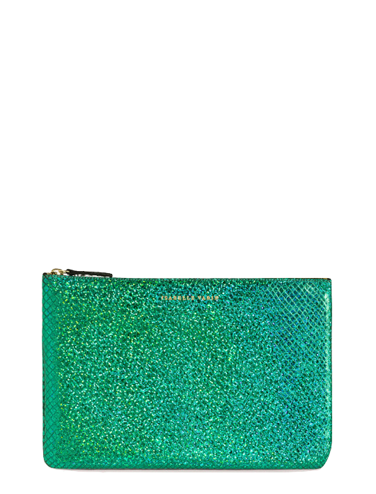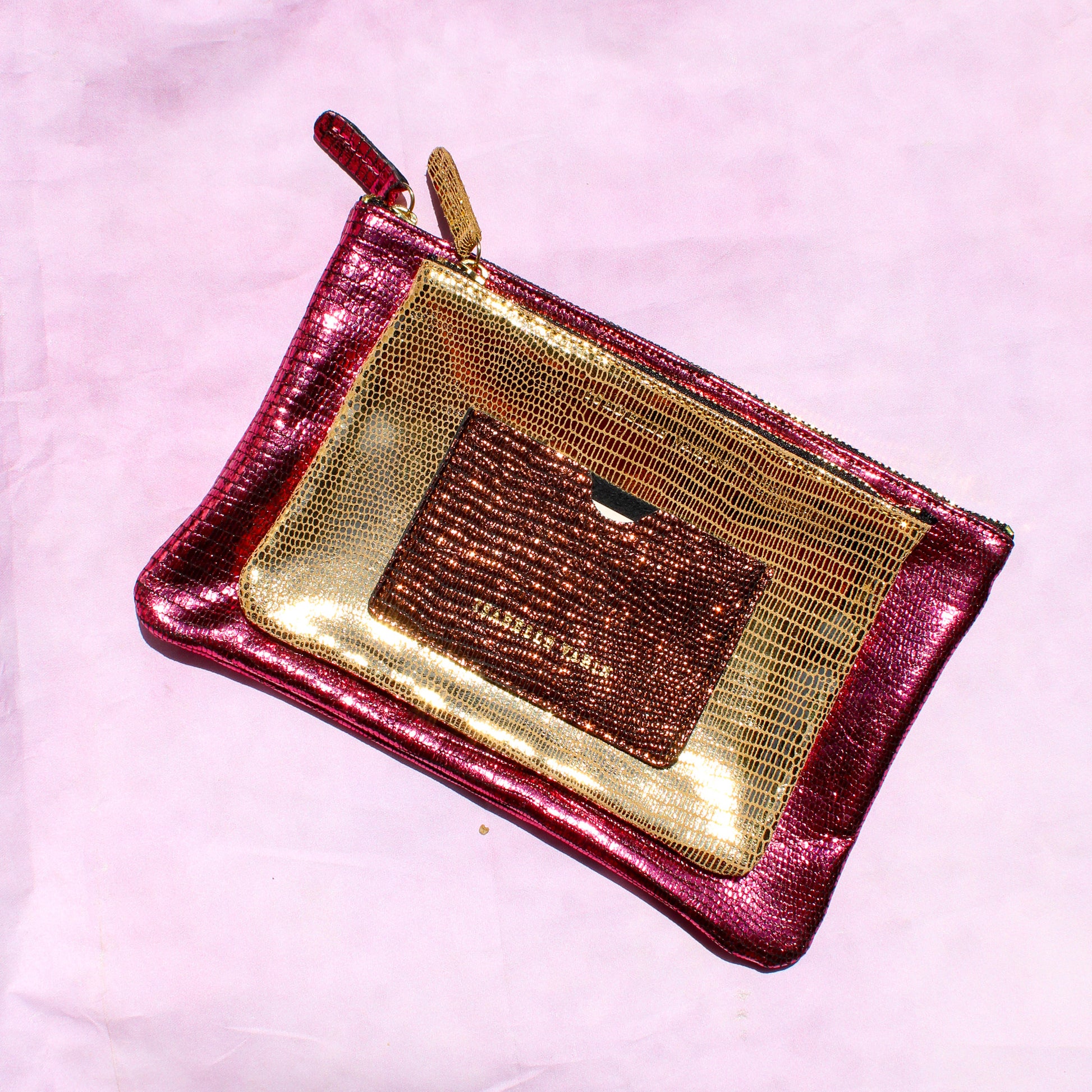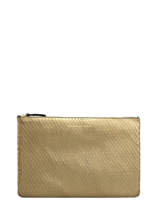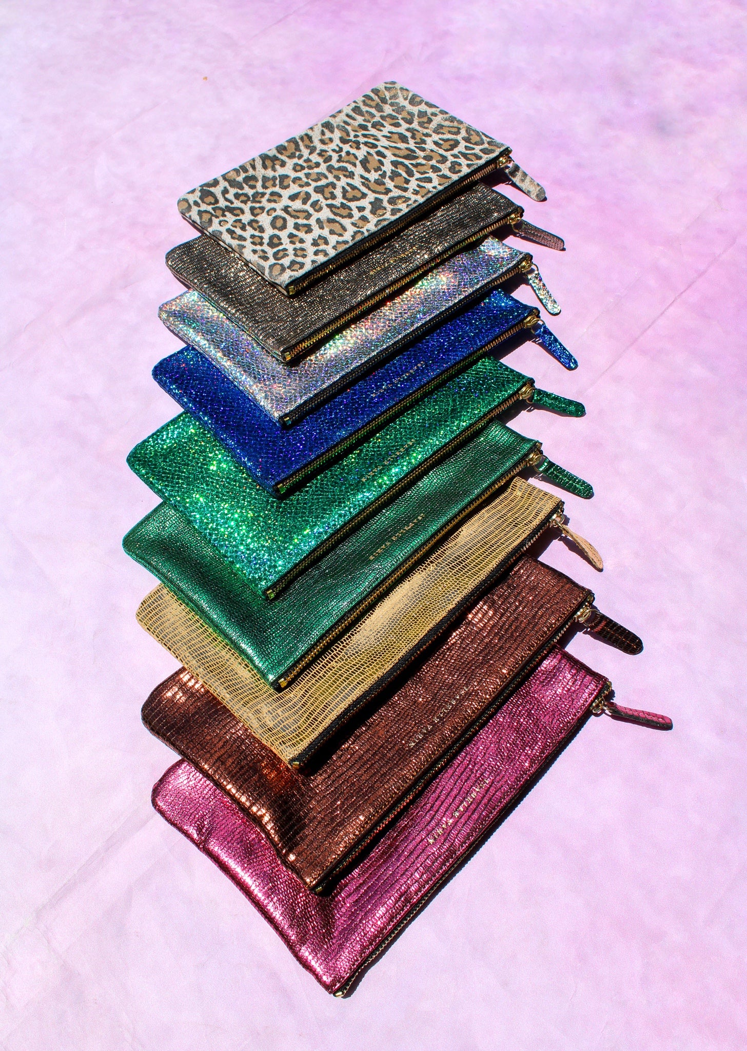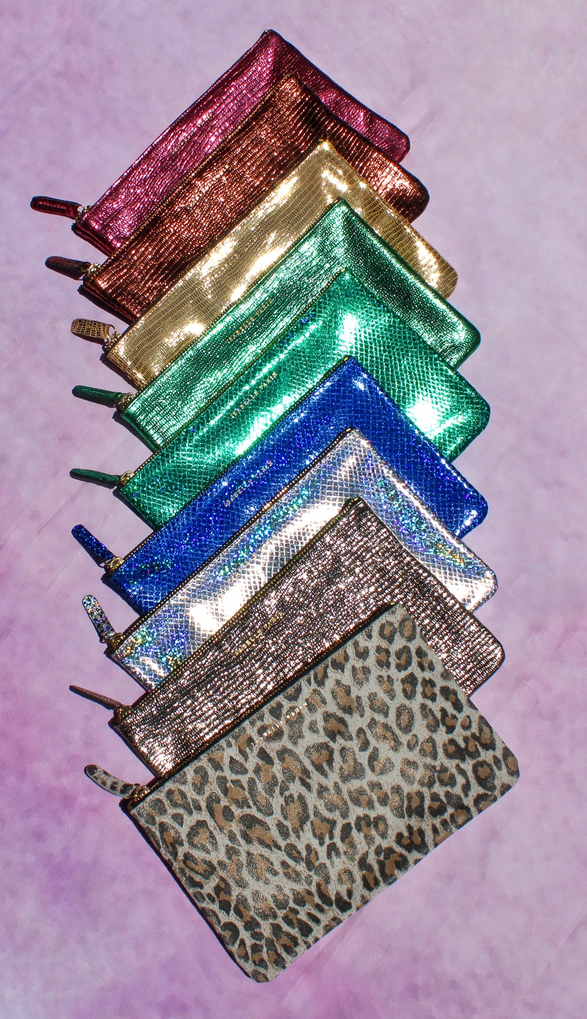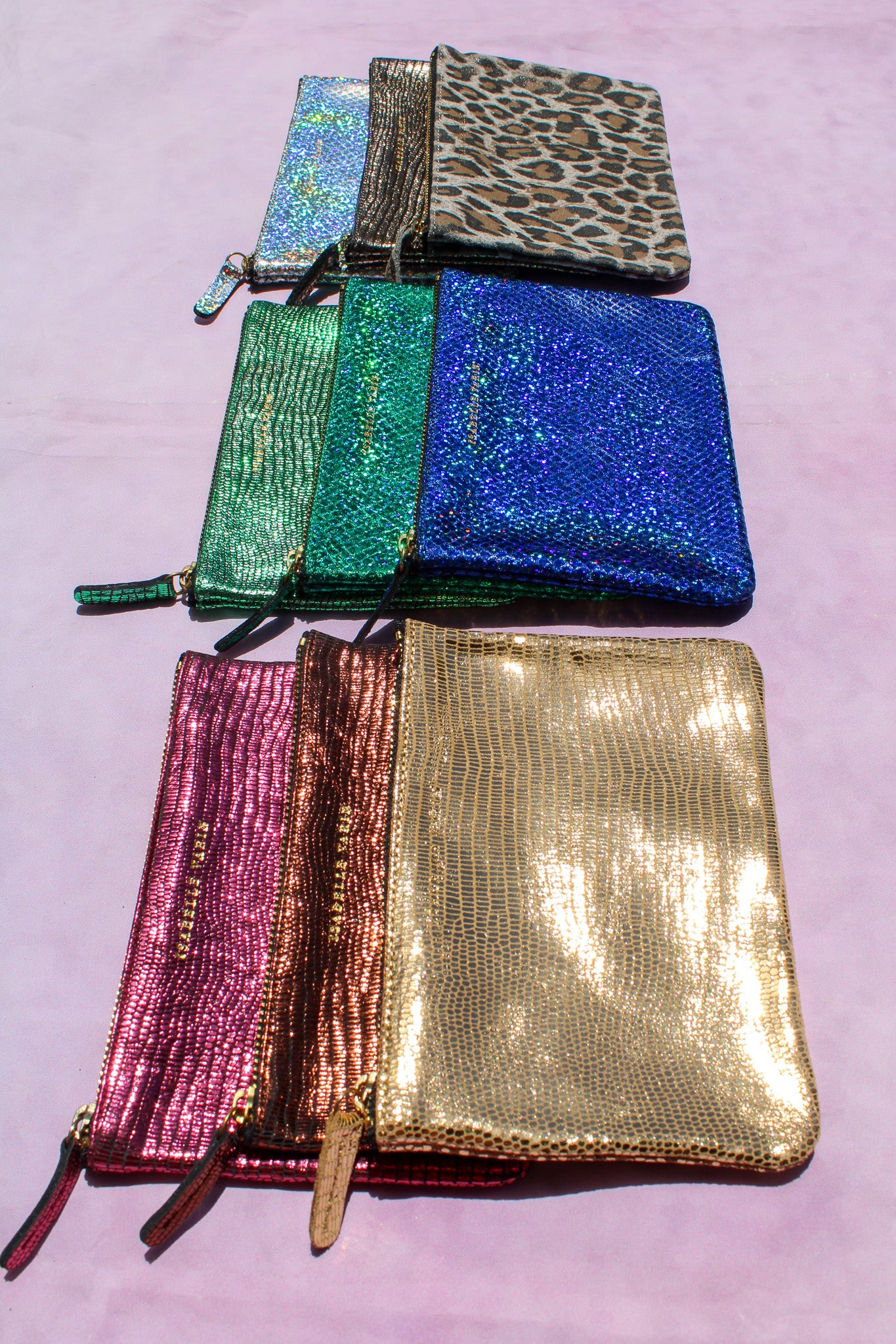 Shimmery metallic leather pouch in a universal size to carry all your essentials! Use as a little clutch on its own or pack it with goodies to throw in a larger bag.