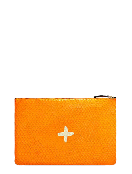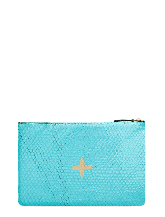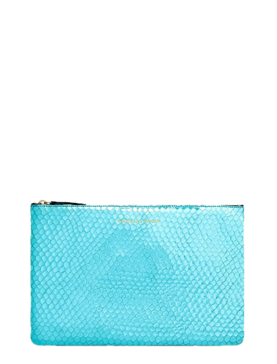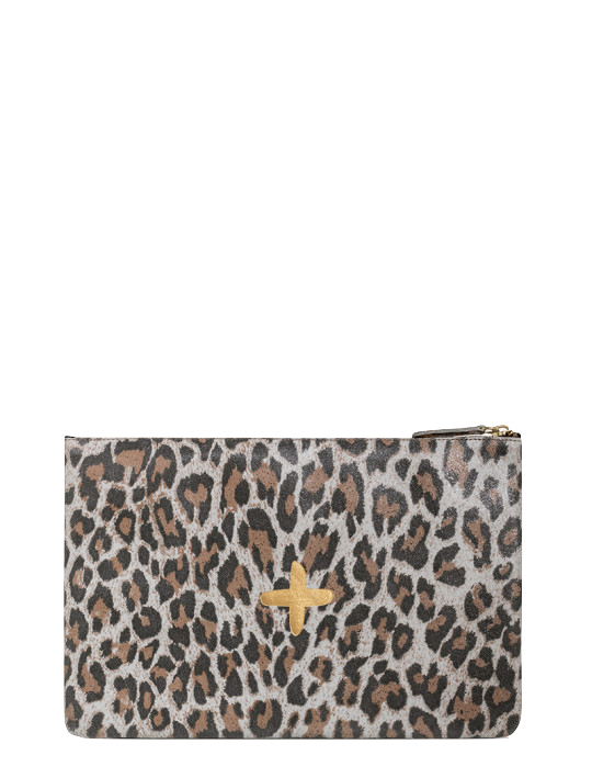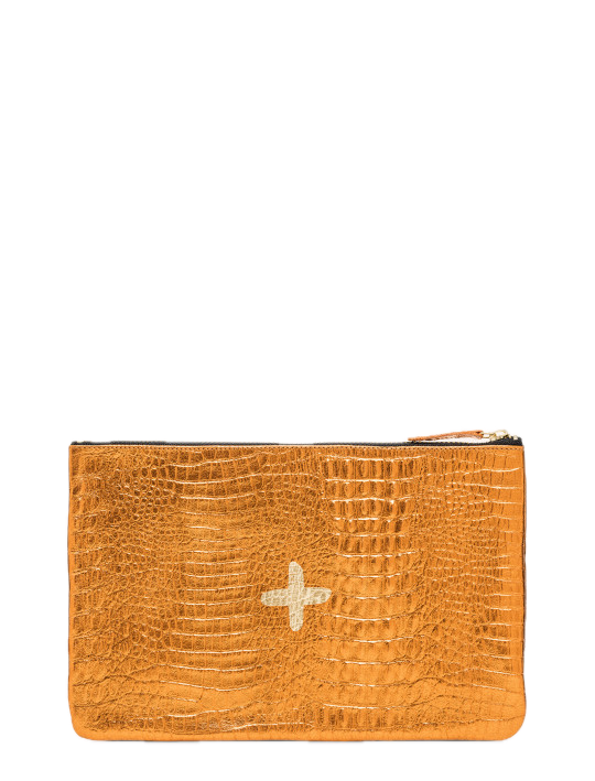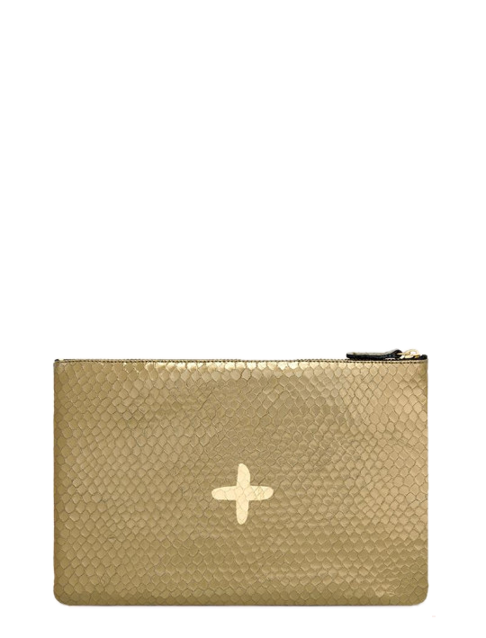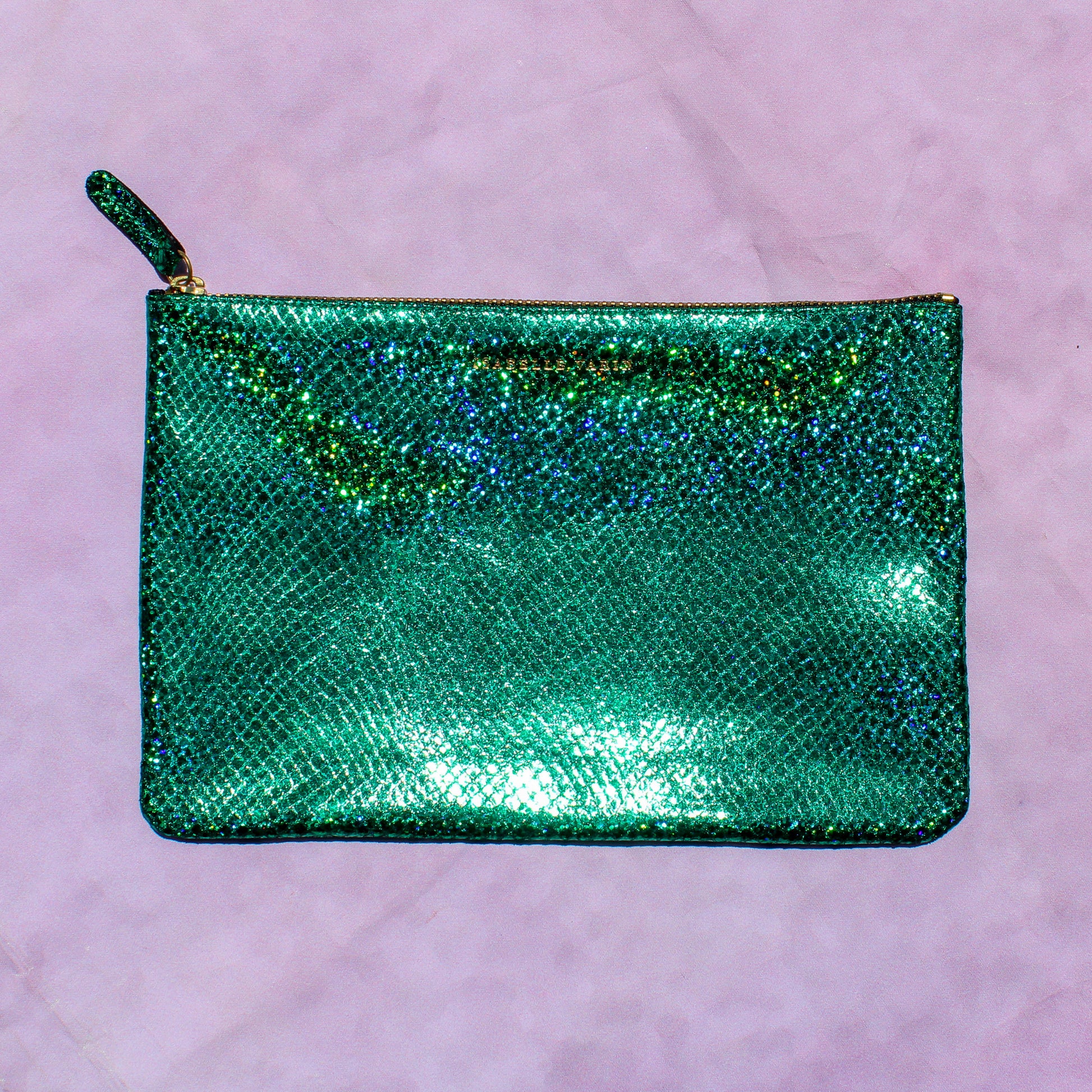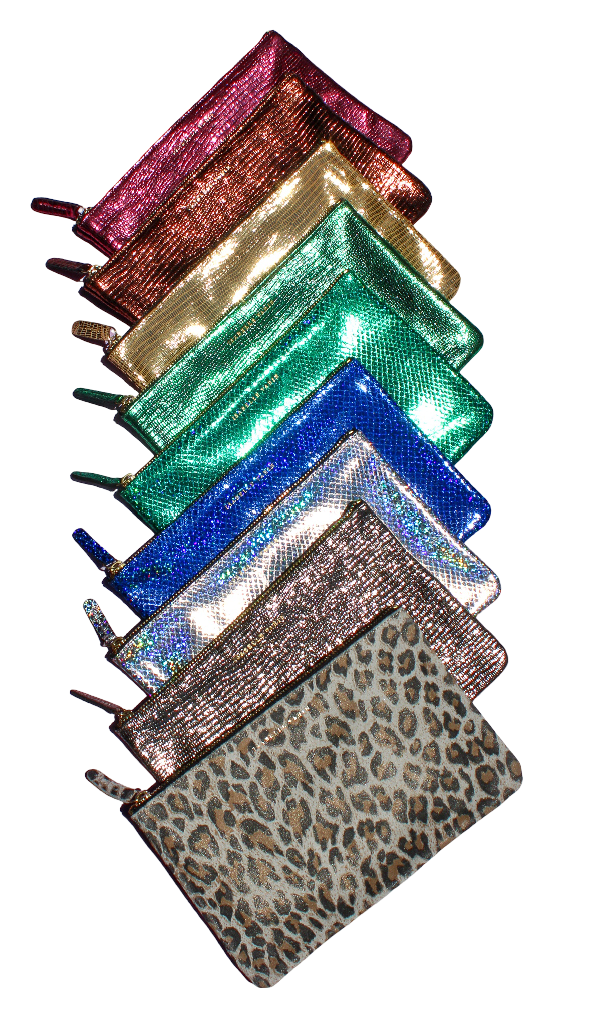 Shimmery metallic leather pouch in a universal size to carry all your essentials! Use as a little clutch on its own or pack it with goodies to throw in a larger bag.