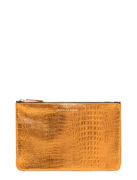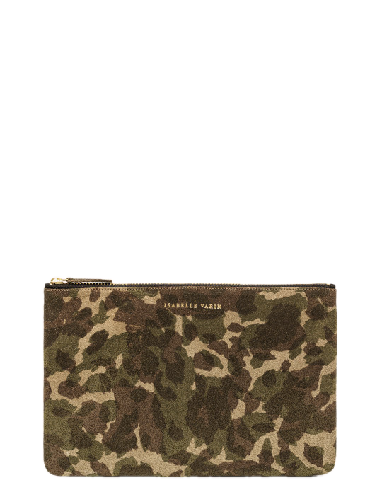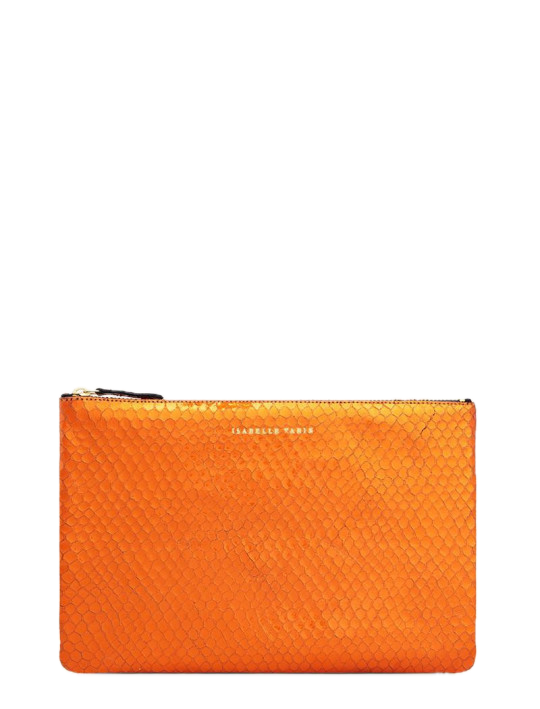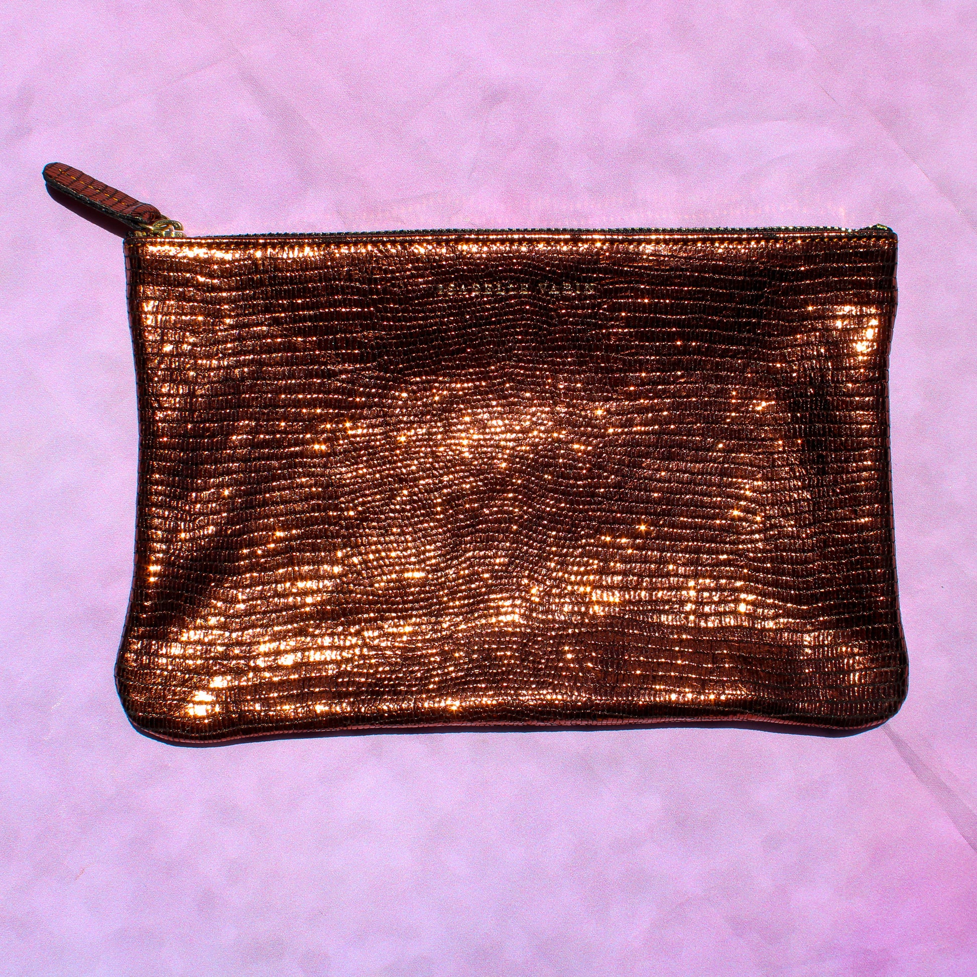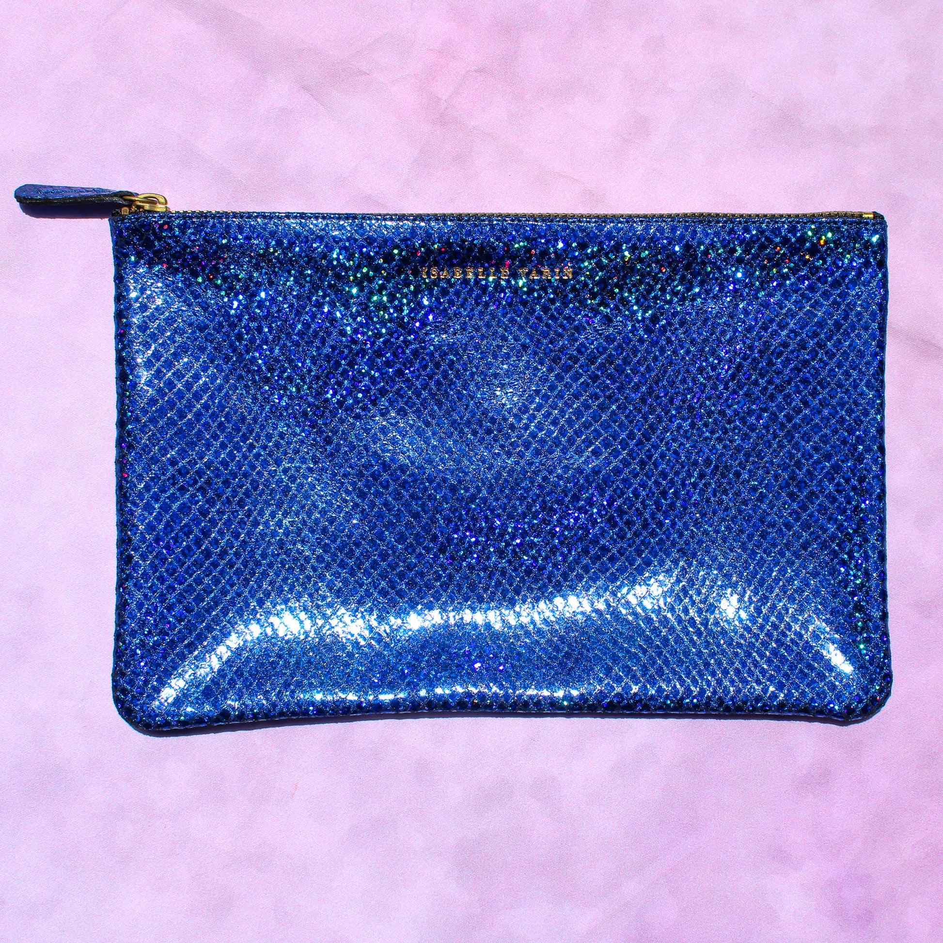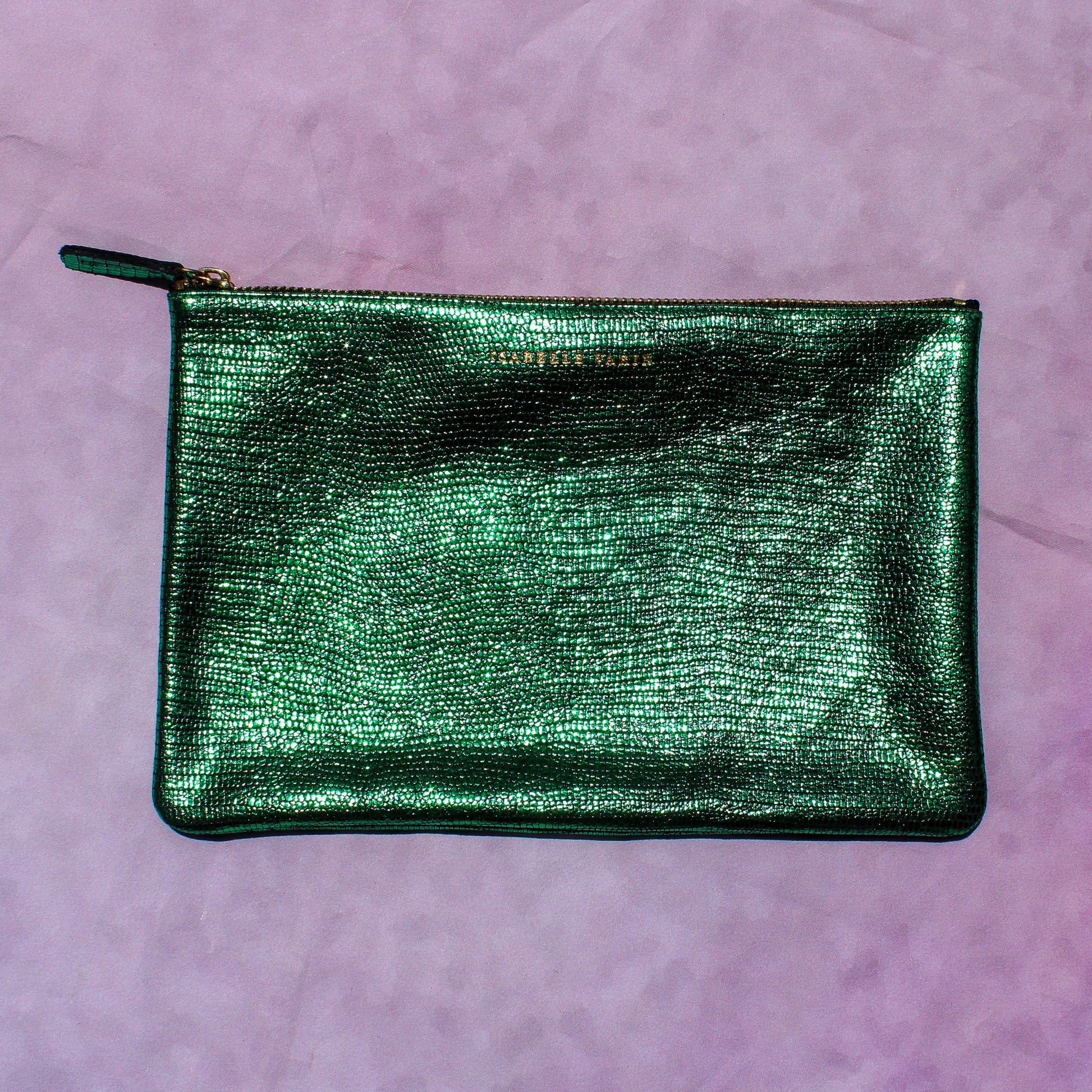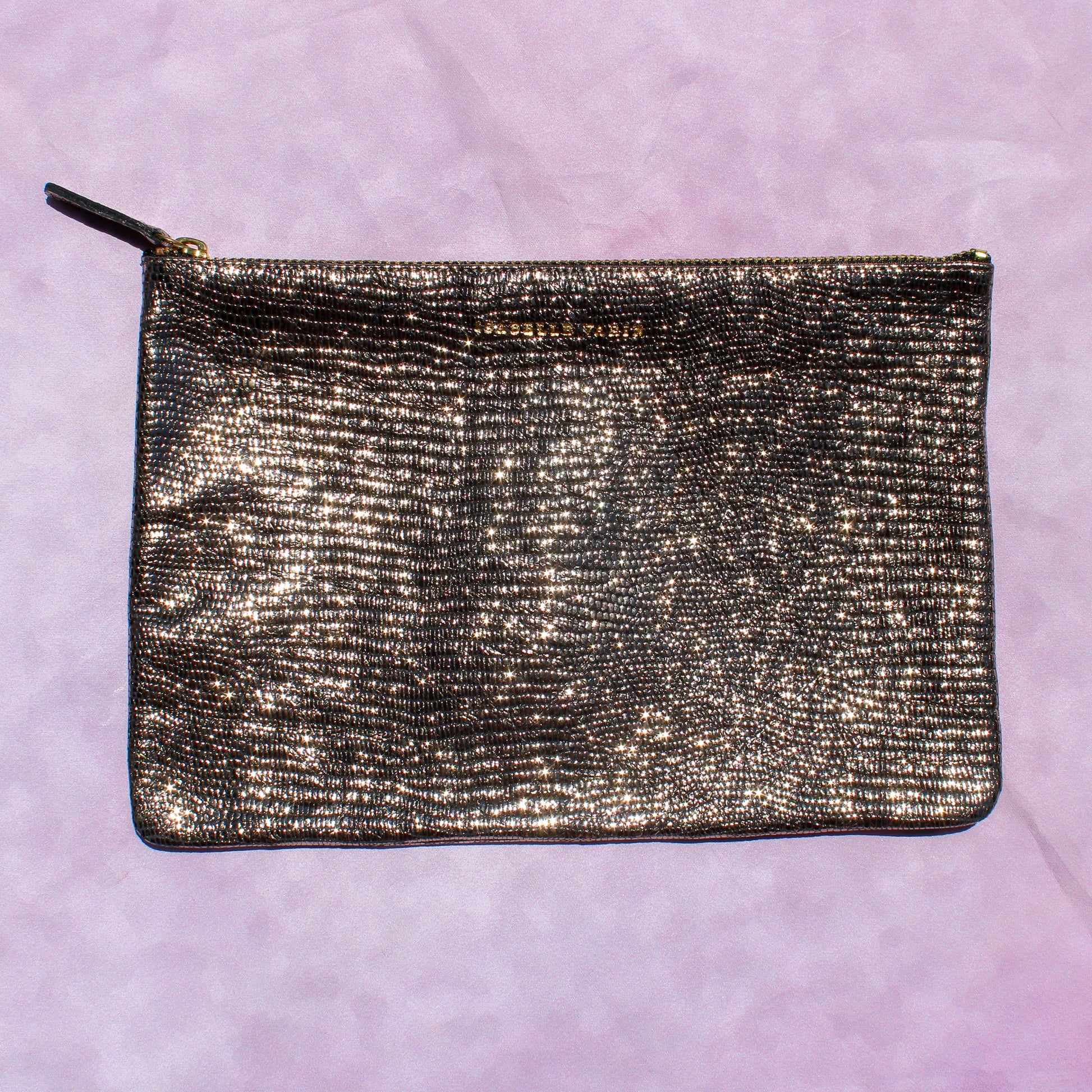 Front side embossed with "Isabelle Varin" in gold lettering, back side has IV's signature gold "X" mark. Zipper closure.