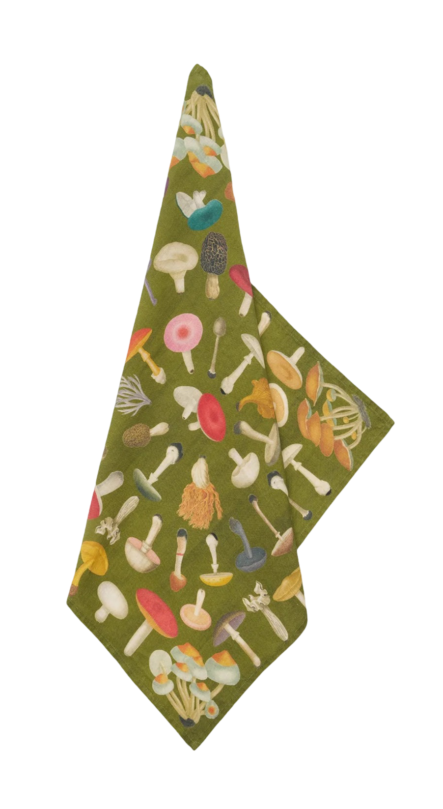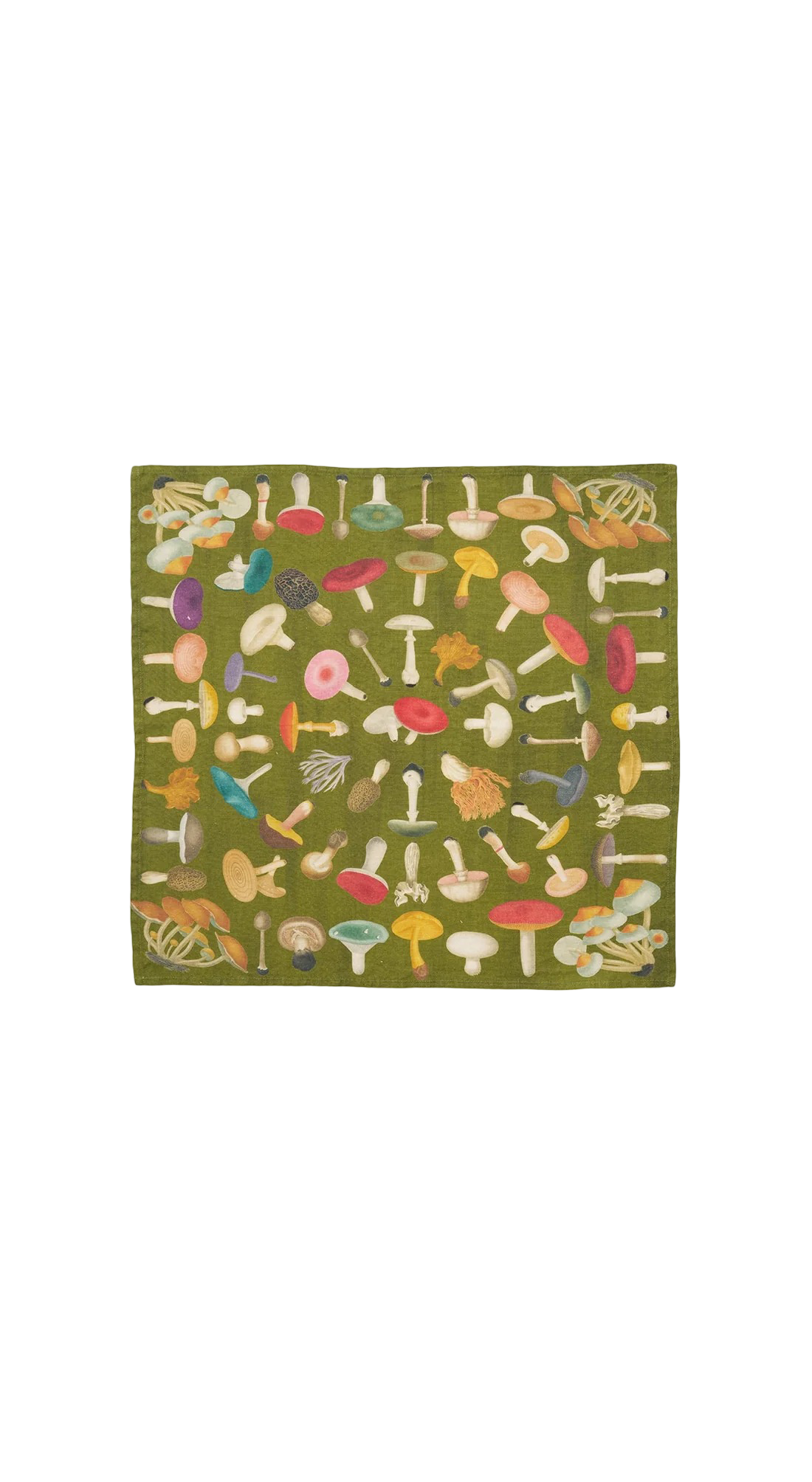Reimagined from 18th and 19th century illustrations in John Derian's extensive archive, a vintage array of mushrooms dance across this spirited table linen in riotous shades. Set on a deep avocado green ground, formed as a kaleidoscopic vision of nature's edible forest floor finds.