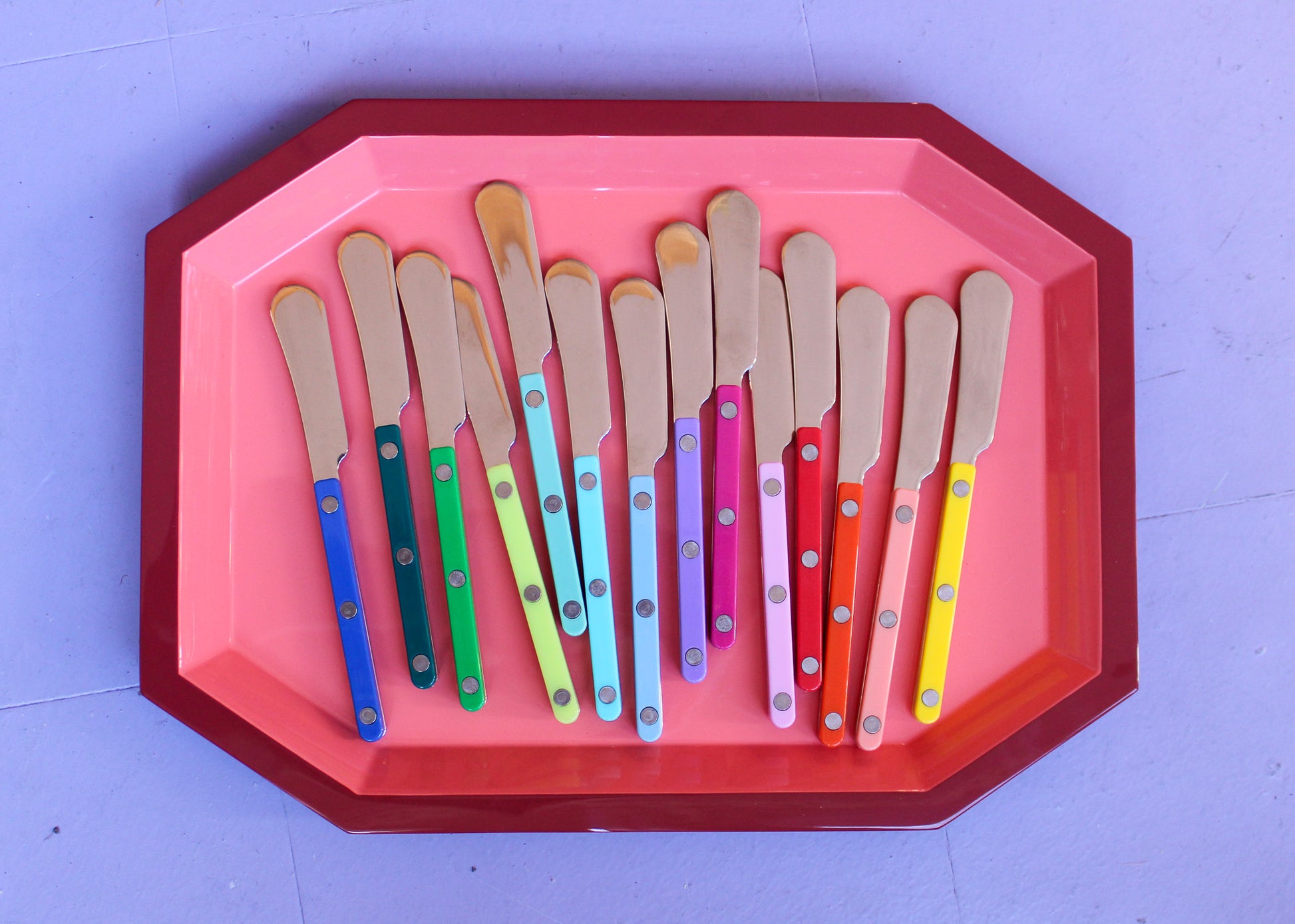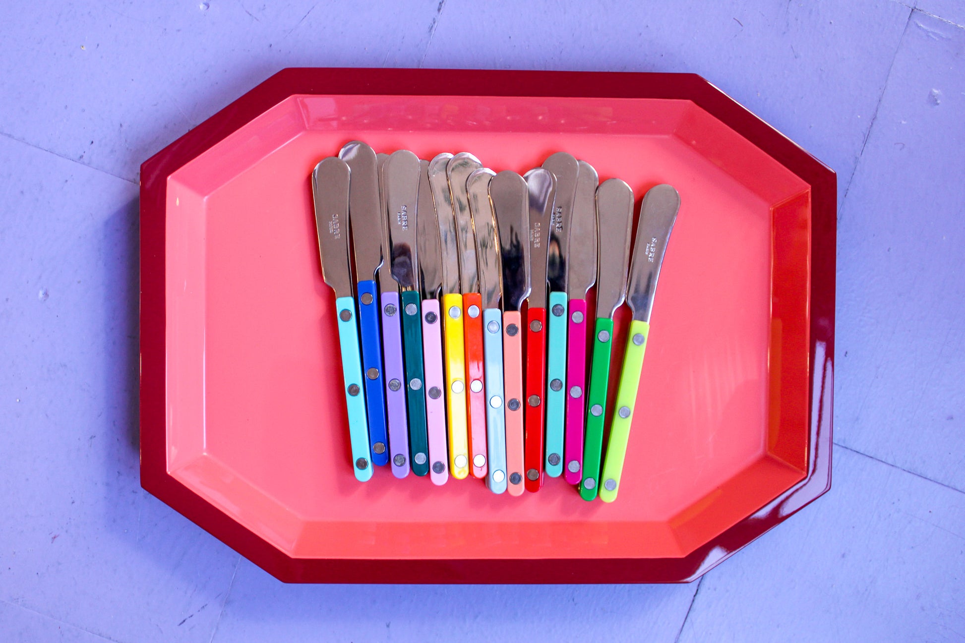 When designing this cutlery we wanted to faithfully capture the atmosphere while adding a modern touch: the styling is simple, the rivets are visible, while the colours and materials stand out nicely. From red to blue, not forgetting the superb materials with horn or tortoise effects. Available with gloss or vintage finishes, we’re sure you’ll enjoy this collection, which is designed to be both traditional and contemporary at the same time.