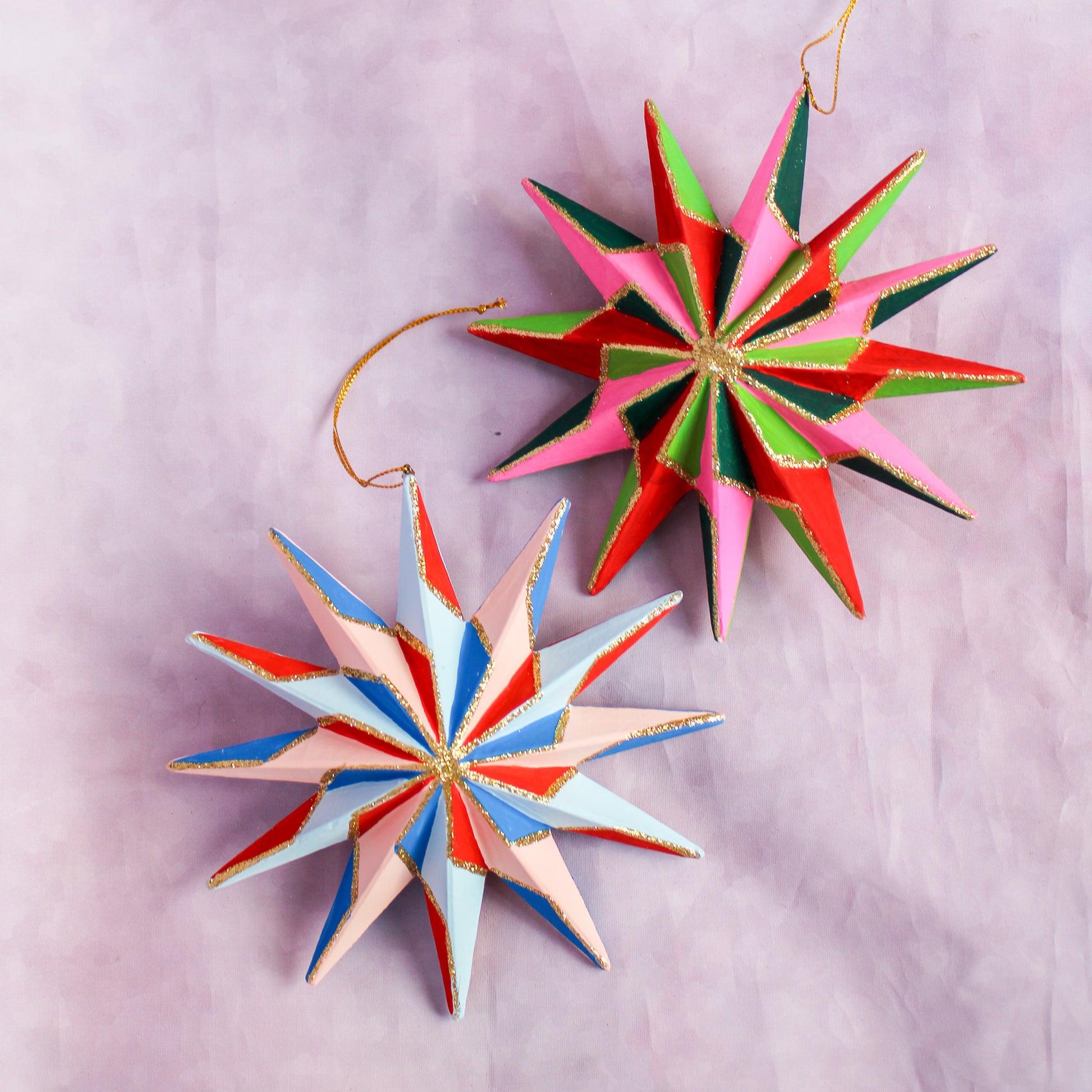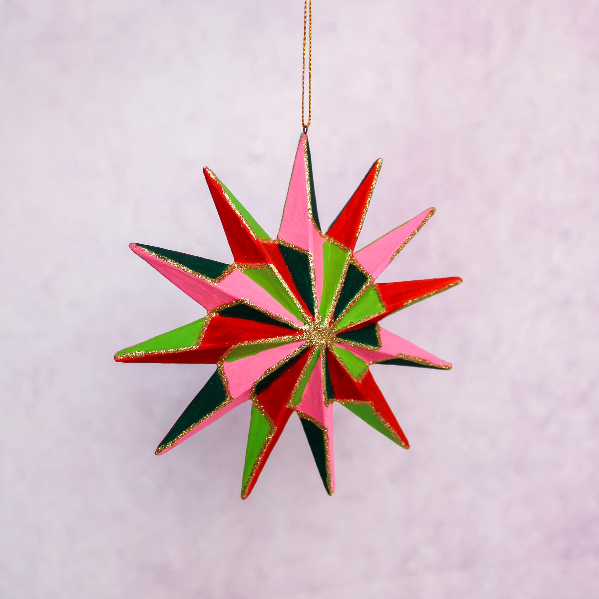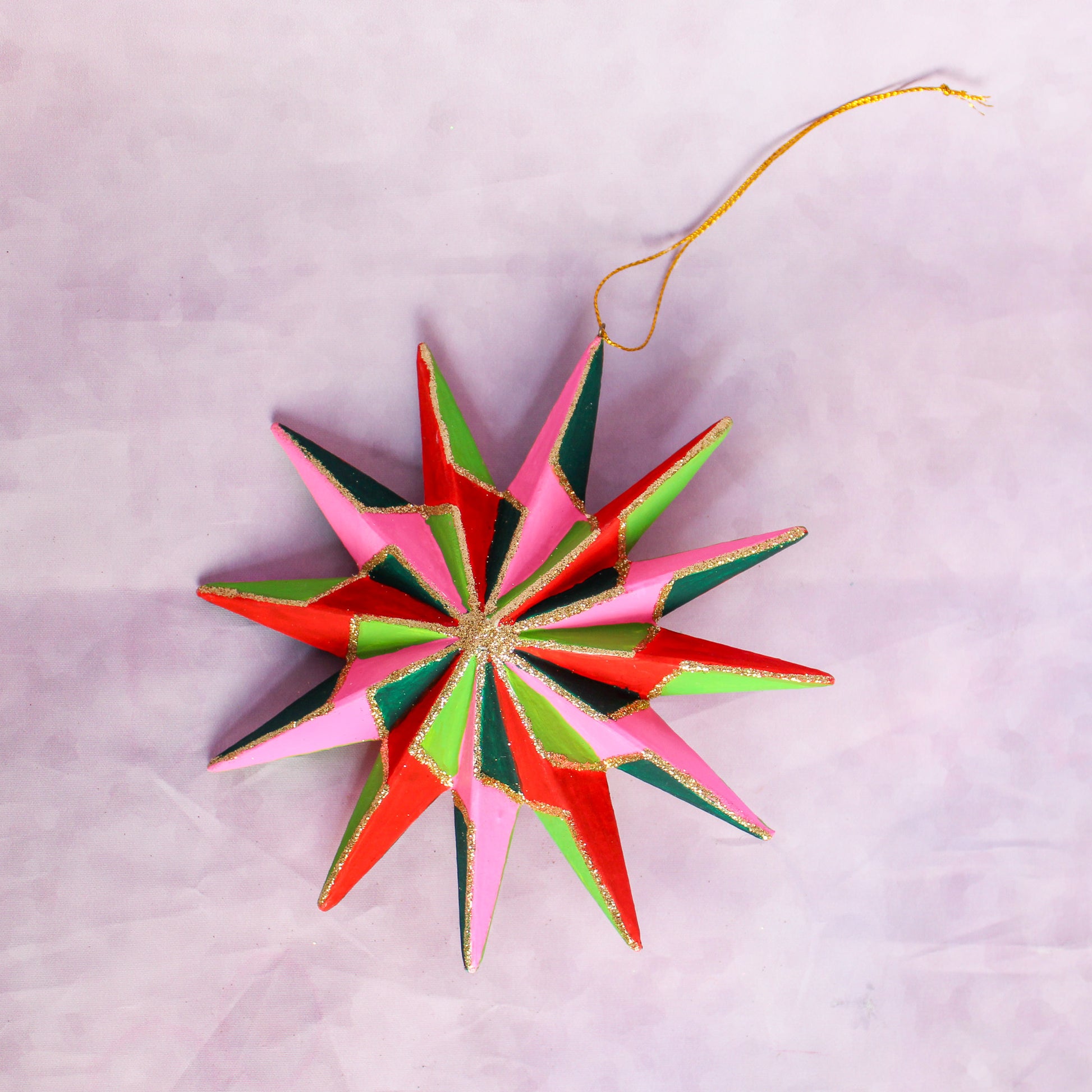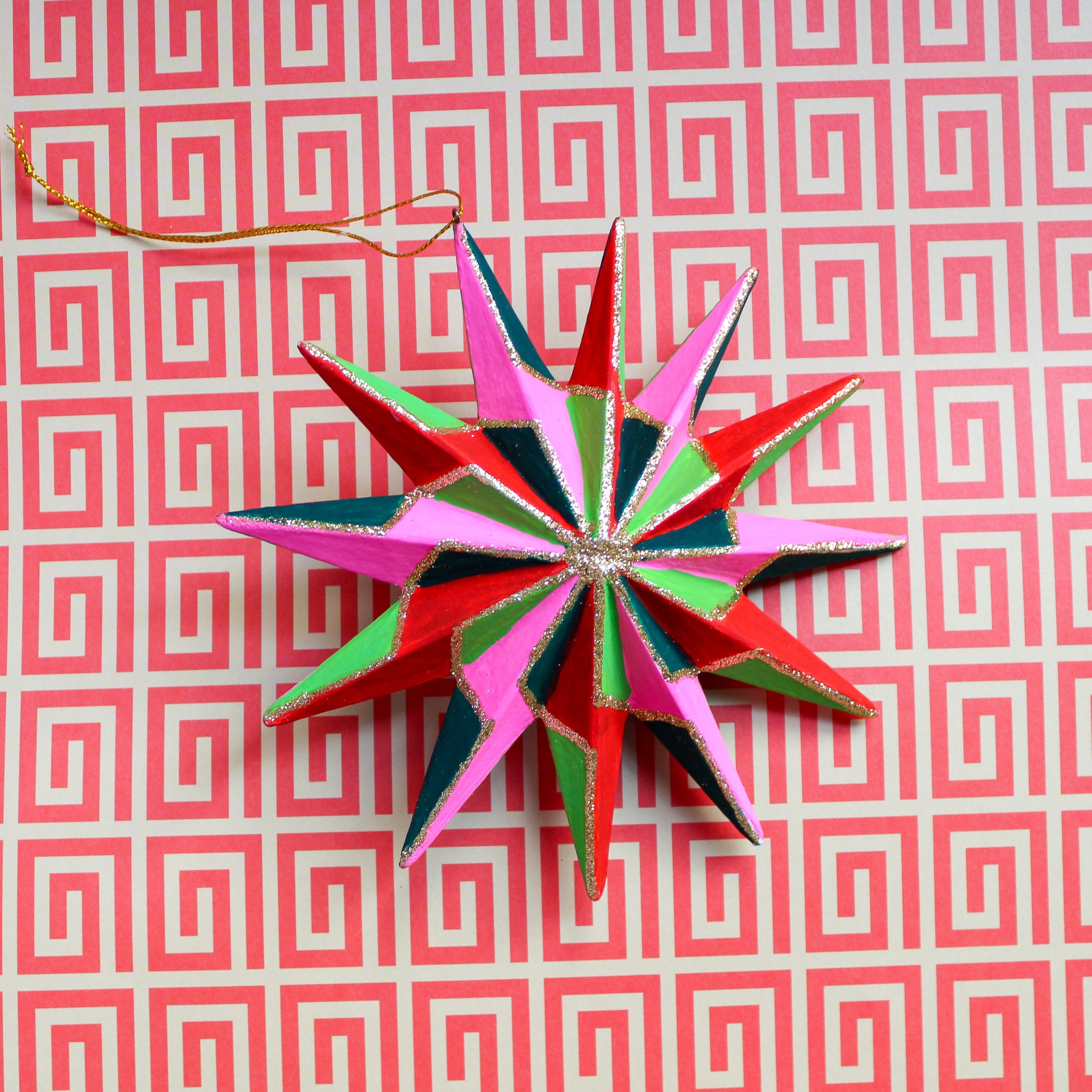 Hand painted paper mache and glitter star ornament. Available in two colors - pastel and neon.
