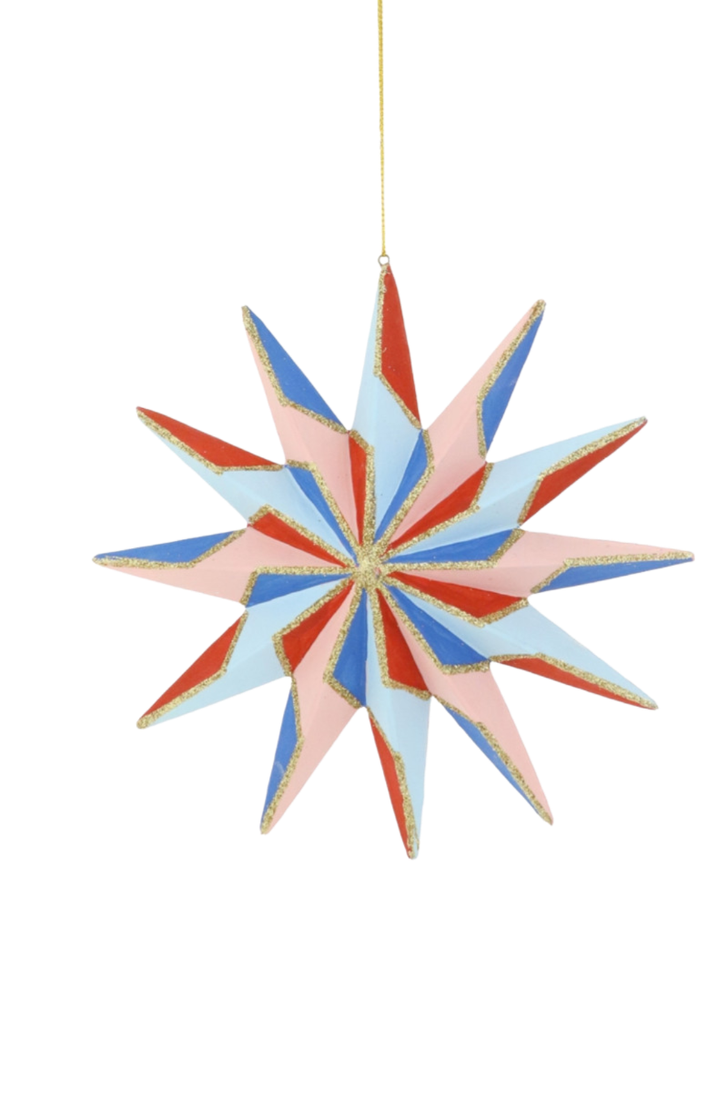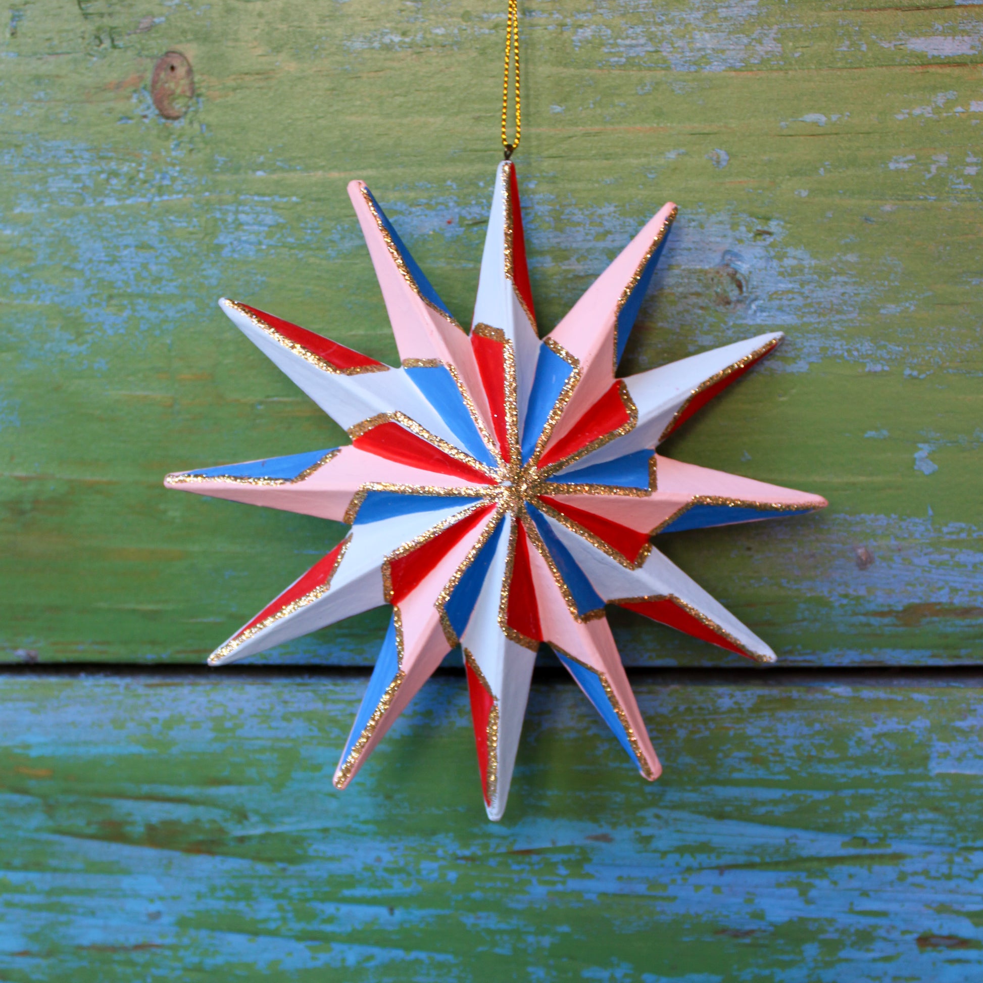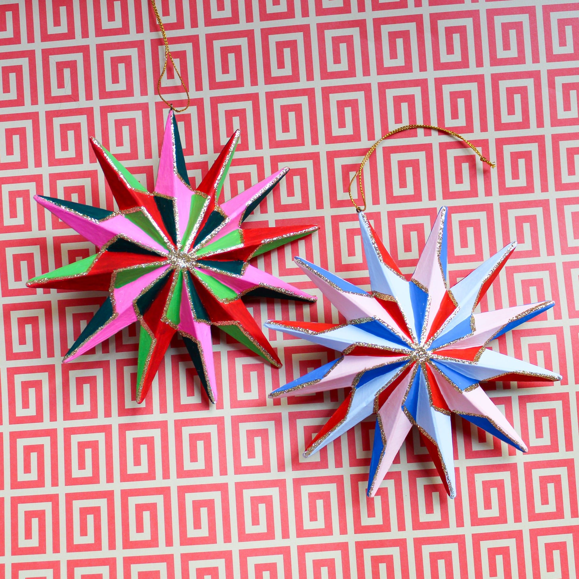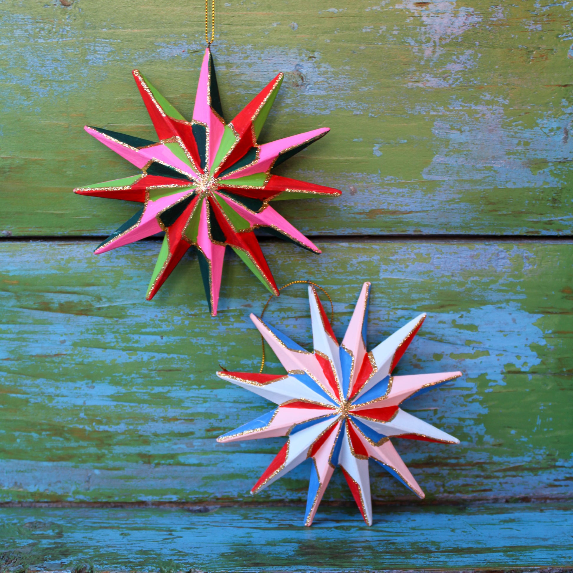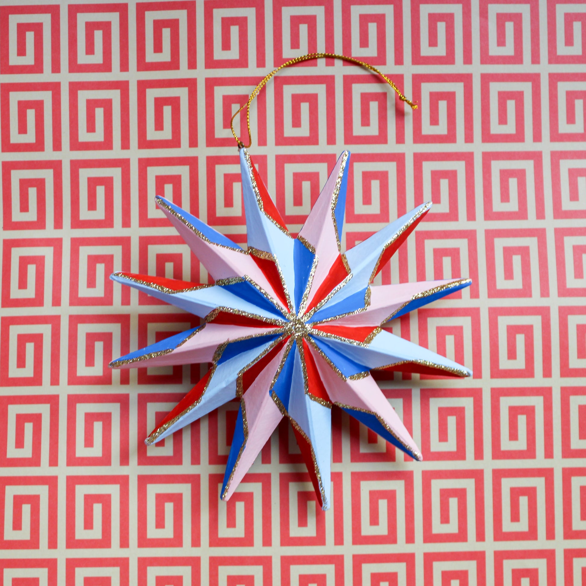 Hand painted paper mache and glitter star ornament. Available in two colors - pastel and neon.