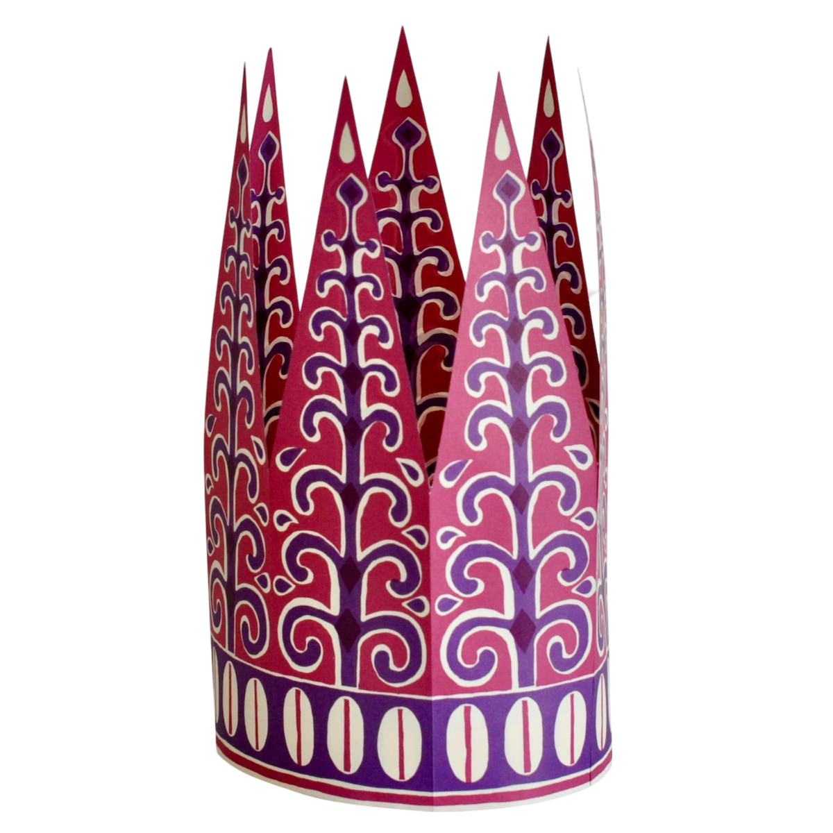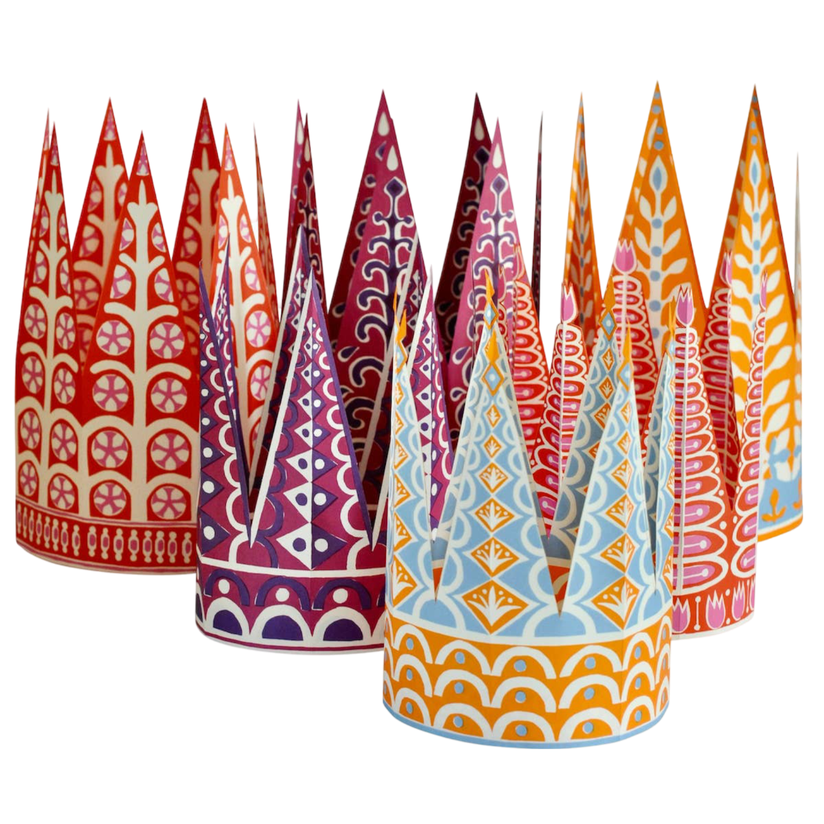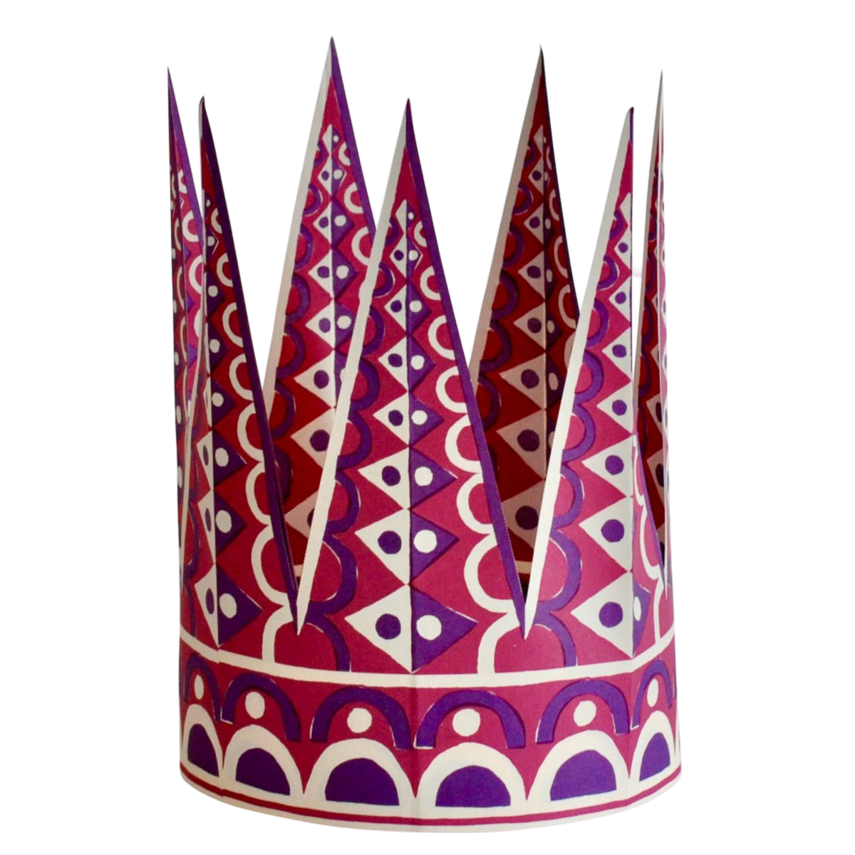 Six tall patterned crowns for feasts, parties, high days and holidays. Six Different Magnificent Designs. Never again will you be satisfied with one of those feeble tissue paper hats that comes out of a cracker. Some minimal assembly is required, and this allows the crown to be adjusted to the size of the wearer's head.