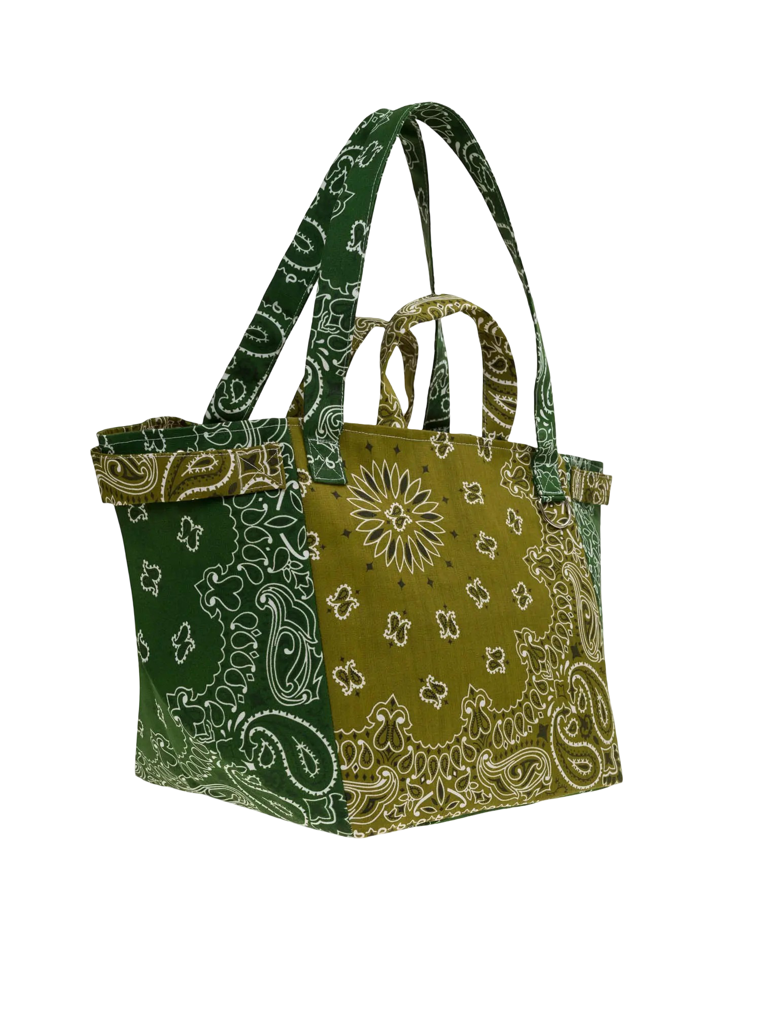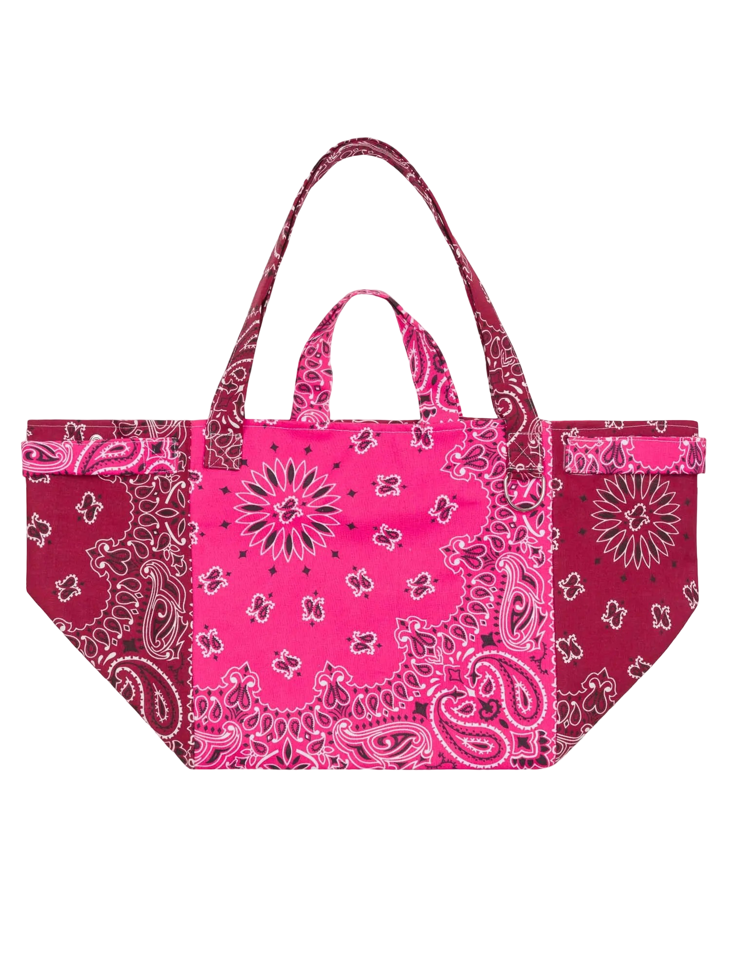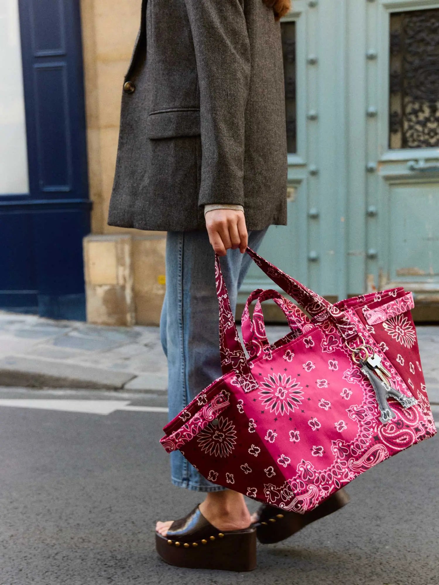 This bag is made from a patchwork of authentic American bandanas and small hand-embroidered motifs.