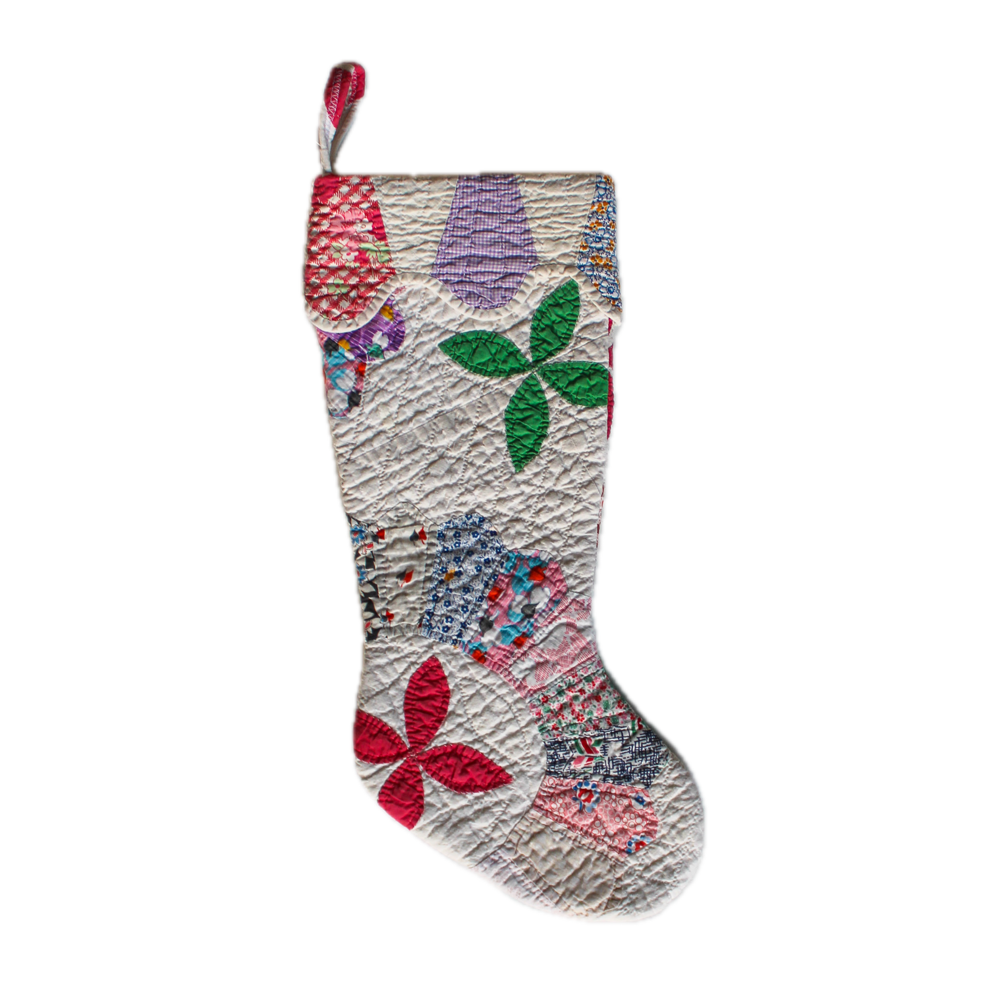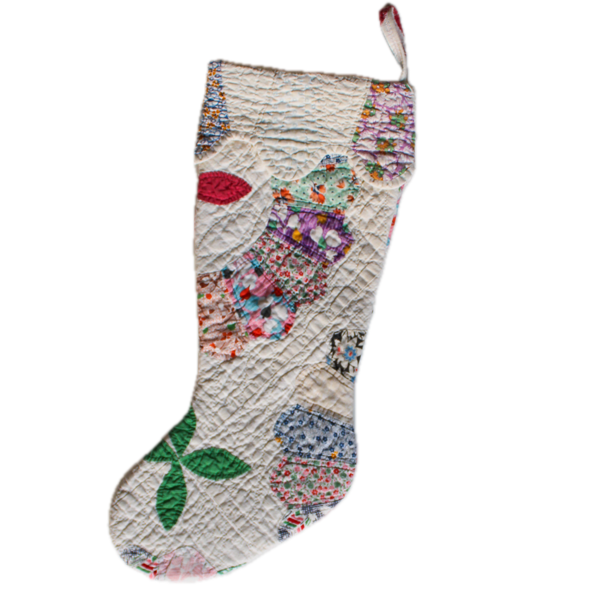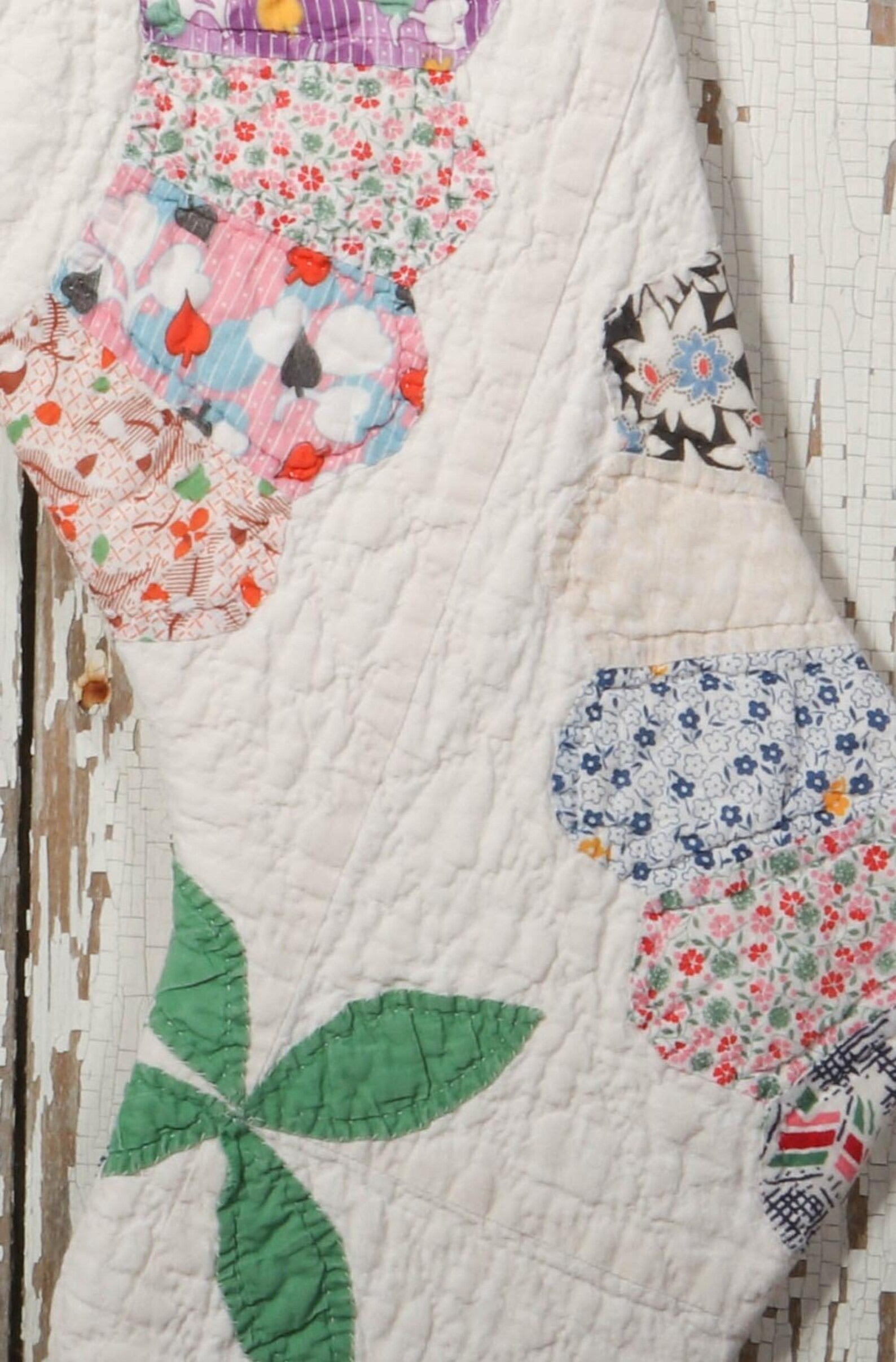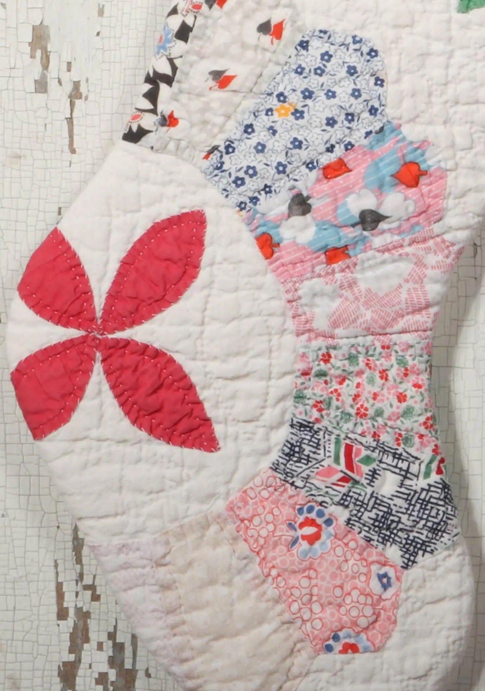Dresden Plate Vintage Quilt with Flowers Christmas Stocking - Scalloped Cuff - Flower, Hand Quilted, Antique Quilt