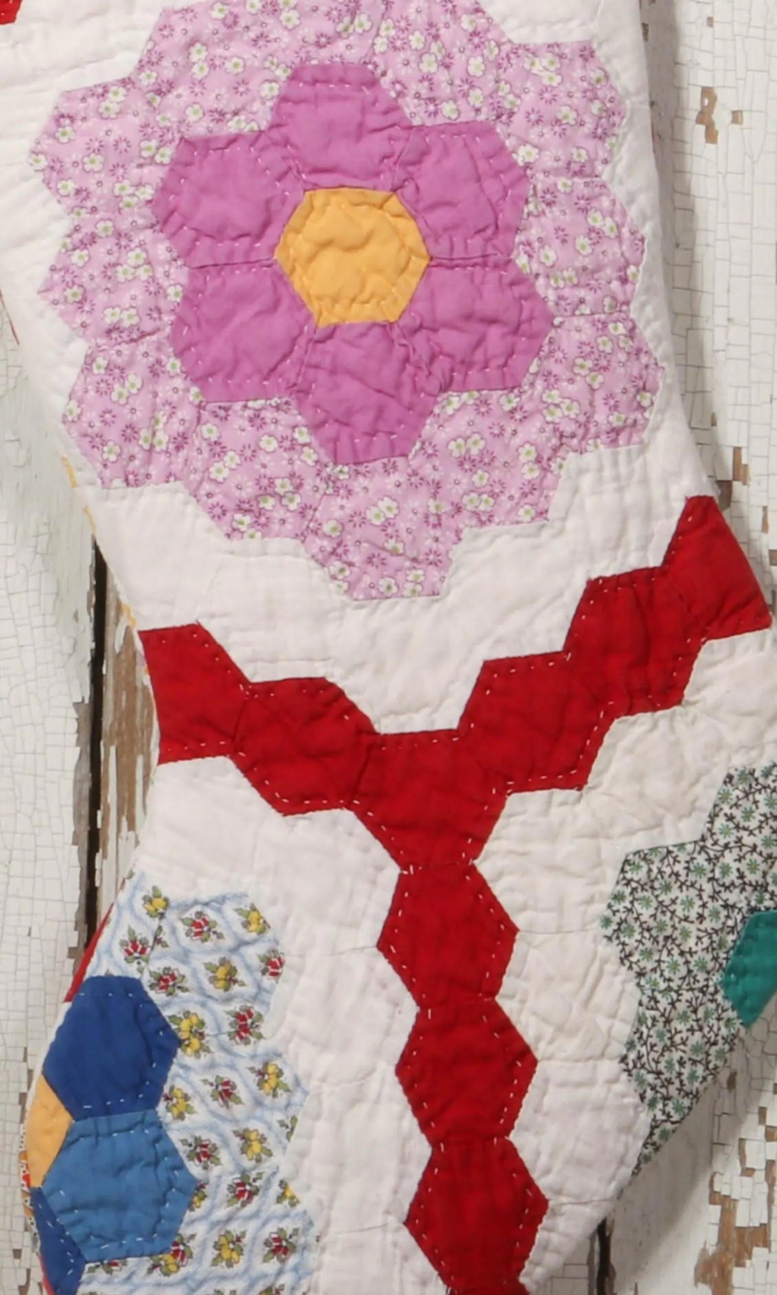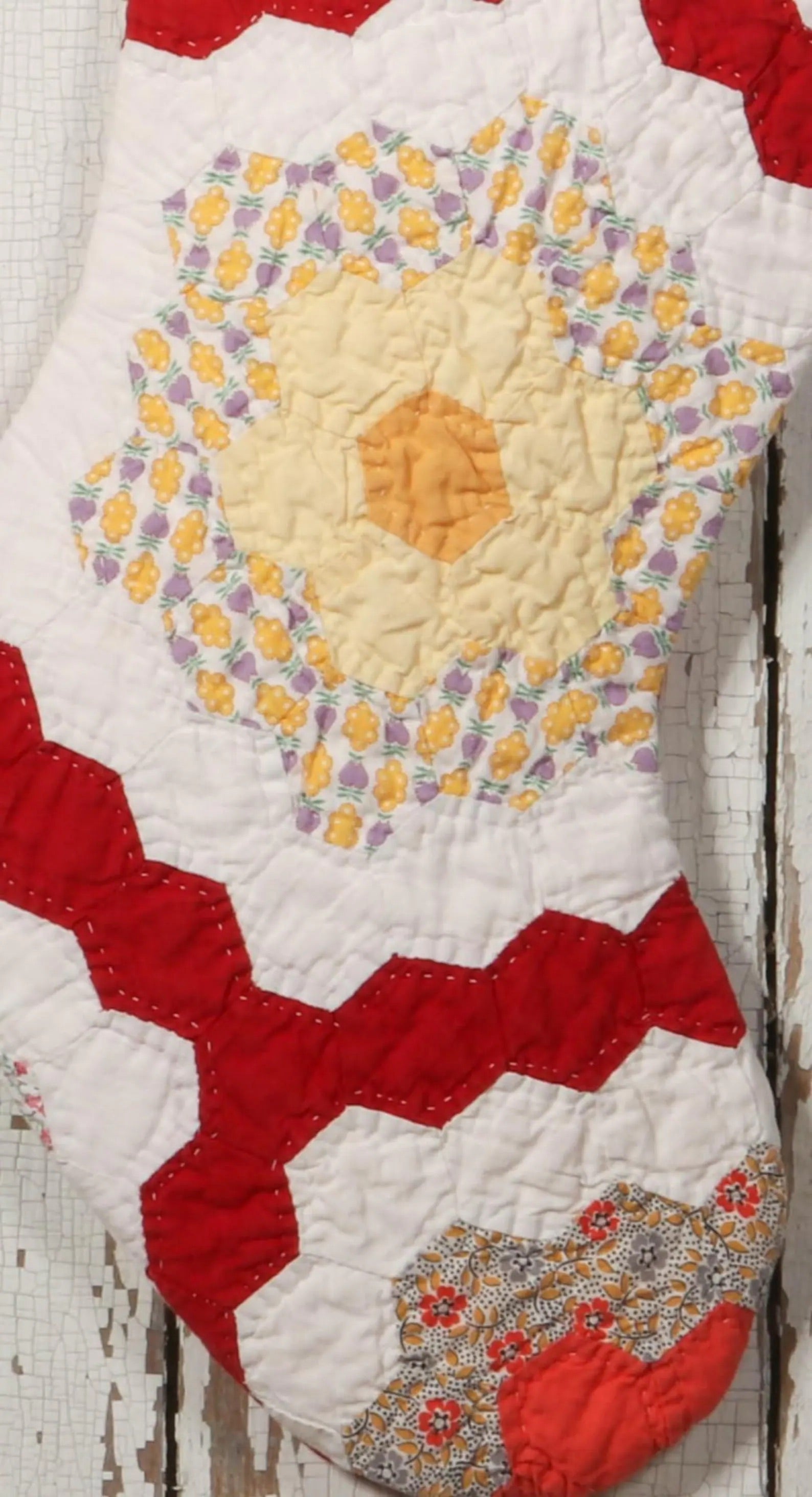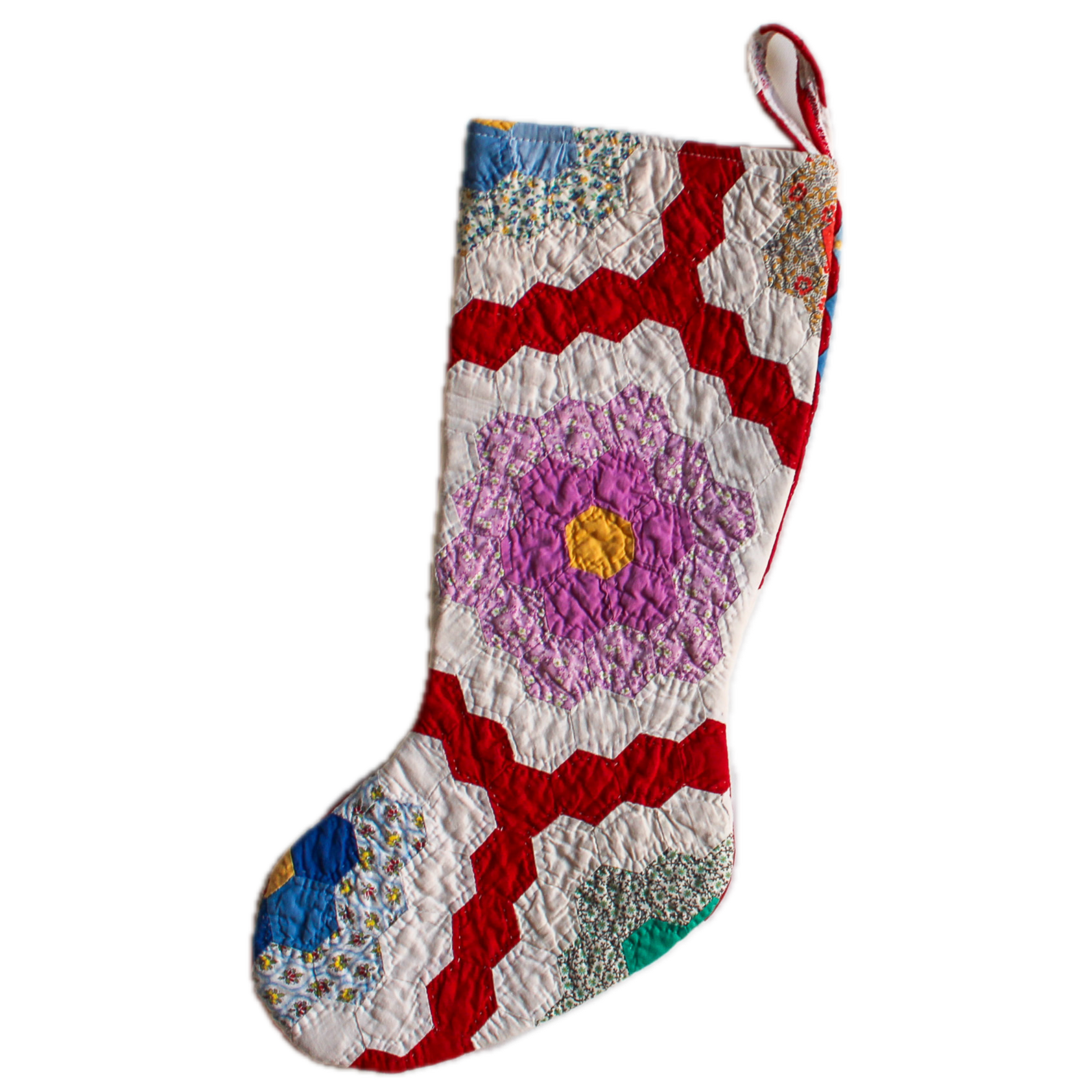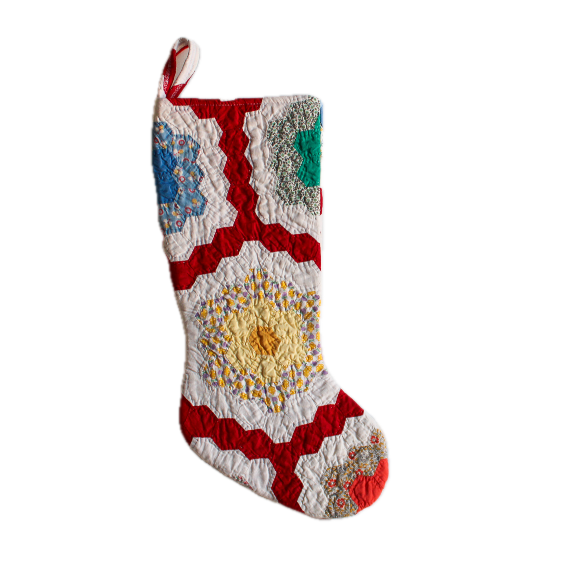 Bright Red Path Grandmas Garden Vintage Quilt Christmas Stocking - Flower, Hand Quilted, Antique Quilt