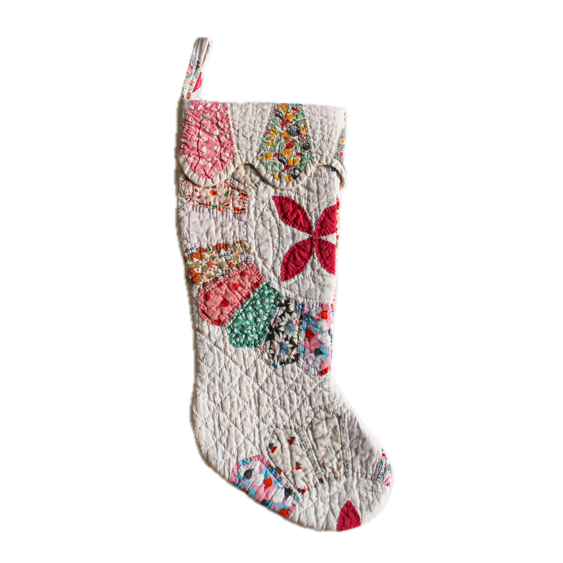 Unique and Hard to Find Red Path Vintage Quilt. Hand-made using an upcycled vintage hand sewn quilt... even the loop to hang is from this pretty old quilt. The slight imperfections are part of it's charm. Hang in either direction for a different look next year. Every stocking is unique! Measures approximately 21" x 9" and fully lined with a cute string of lights fabric. I also fused the quit with interfacing to help support the delicate fabrics for years to come.