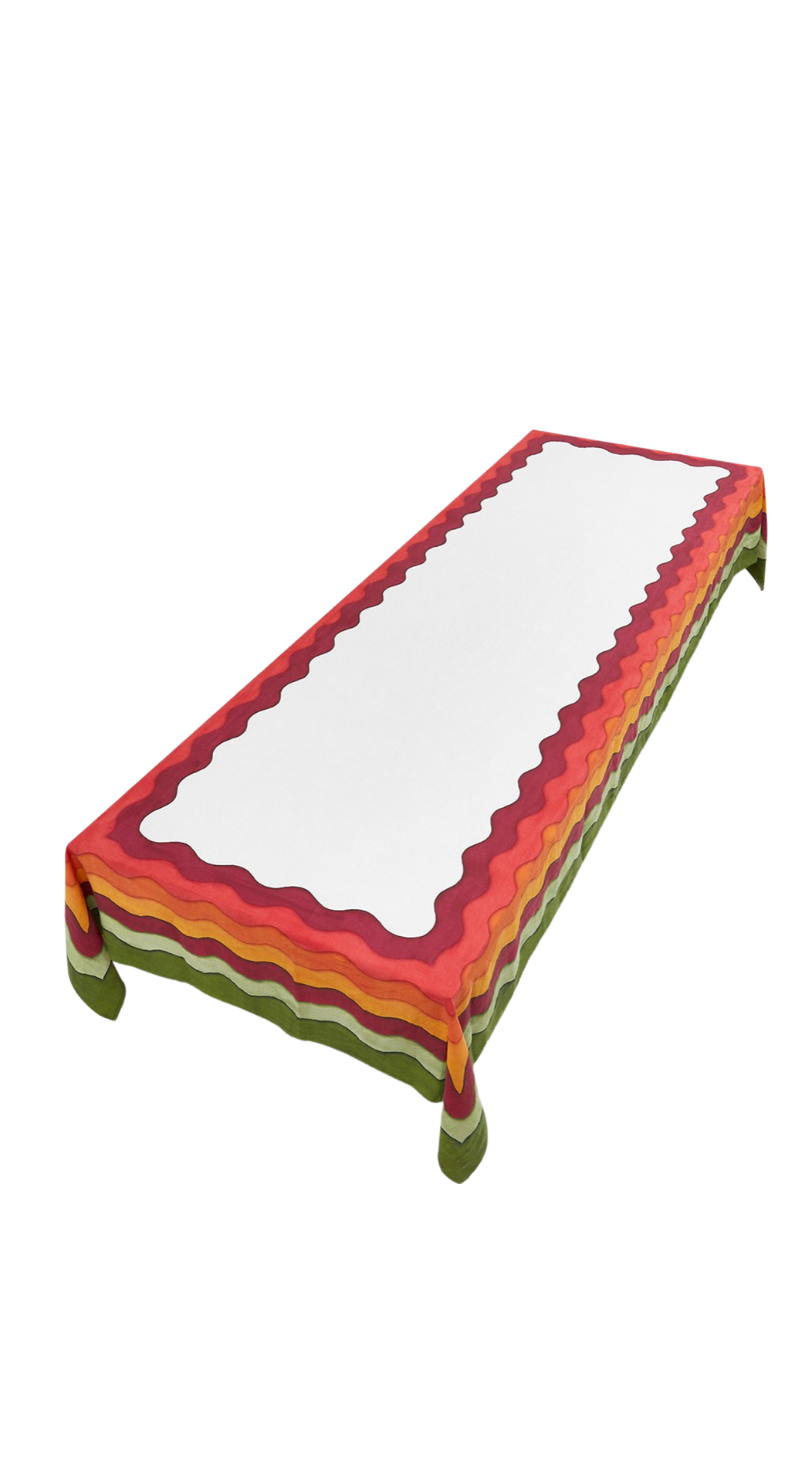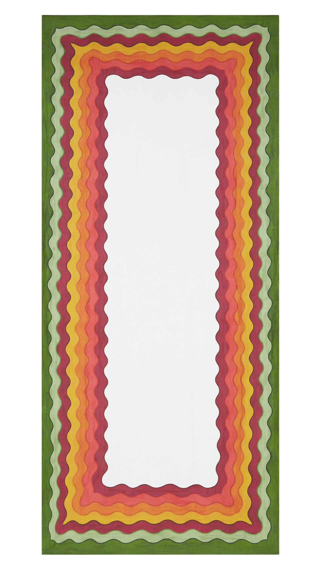 This impactful design is a Trompe L'Oeil of a scalloped rainbow, designed to capture the magic and mystery of the natural phenomena and is coloured by rich, warm shades that typify the cooler months.