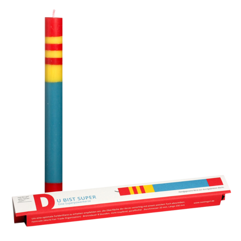A gift, congratulations or a greeting - we have the right candle for every theme, individually packaged in a colored cardboard box. The candle is made of dyed wax - layer by layer of color is painstakingly poured by hand during production. The packaging is printed and processed in Hamburg in a climate-neutral way on FSC-certified, open design paper.